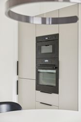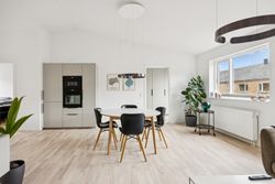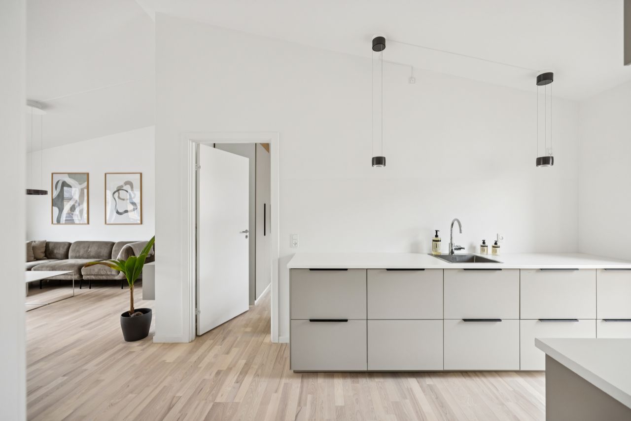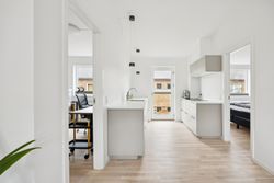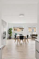 Hjertet af boligen er det åbne køkken-alrum – et naturligt samlingspunkt til hverdagen og til når der kommer gæster på besøg. Det moderne køkken fremstår stilrent og funktionelt med plads til både madlavning og samvær.