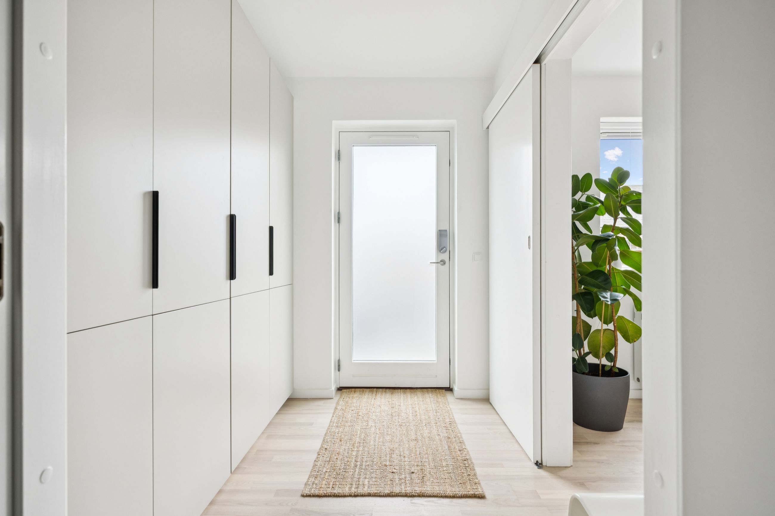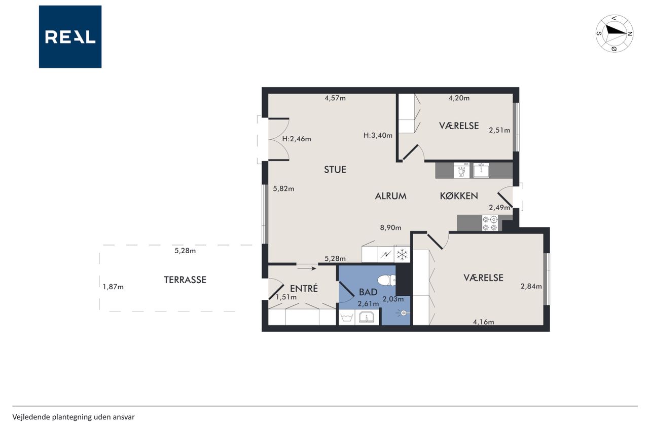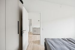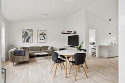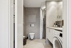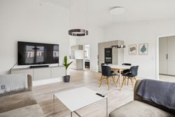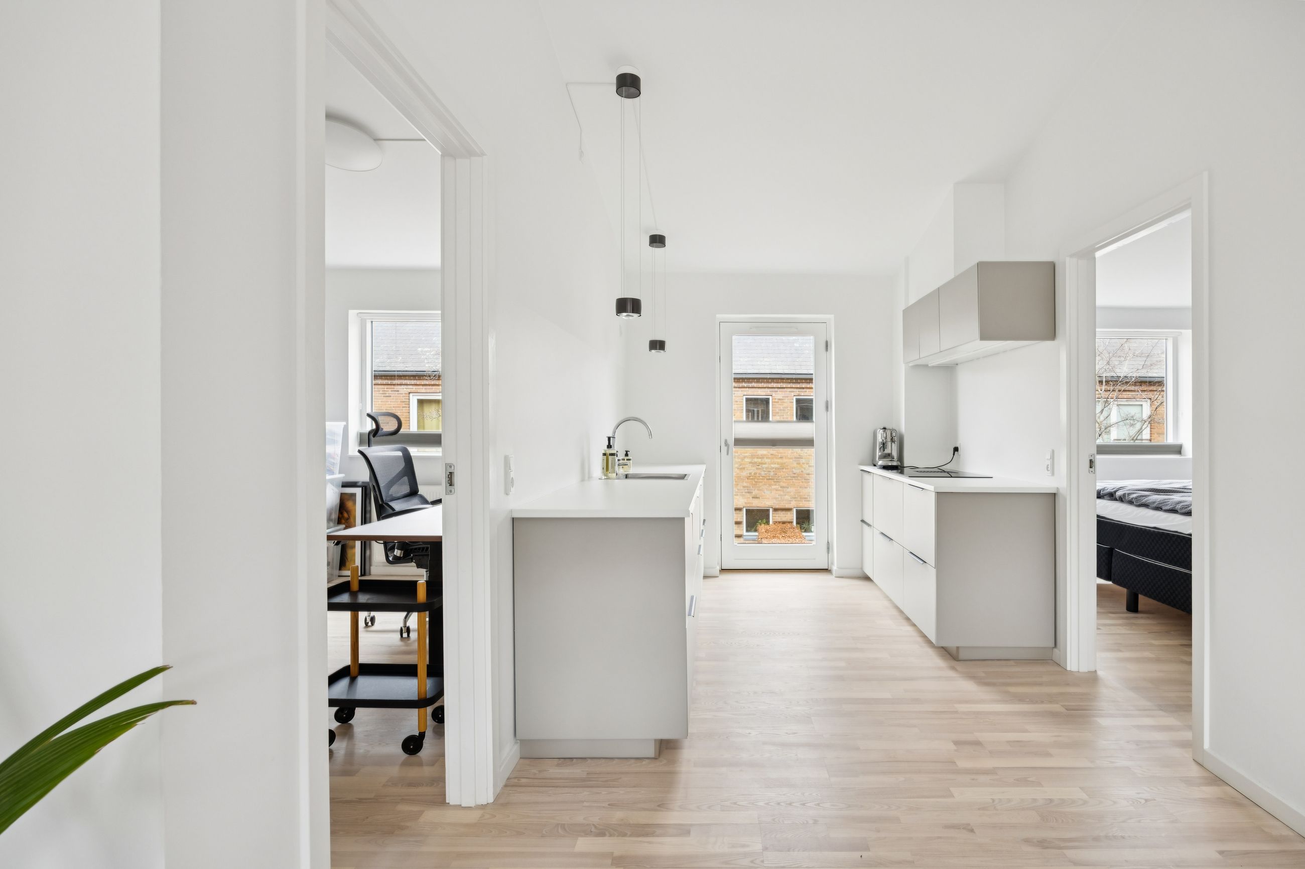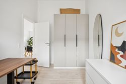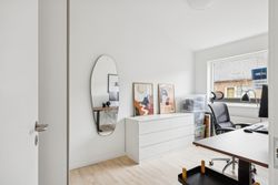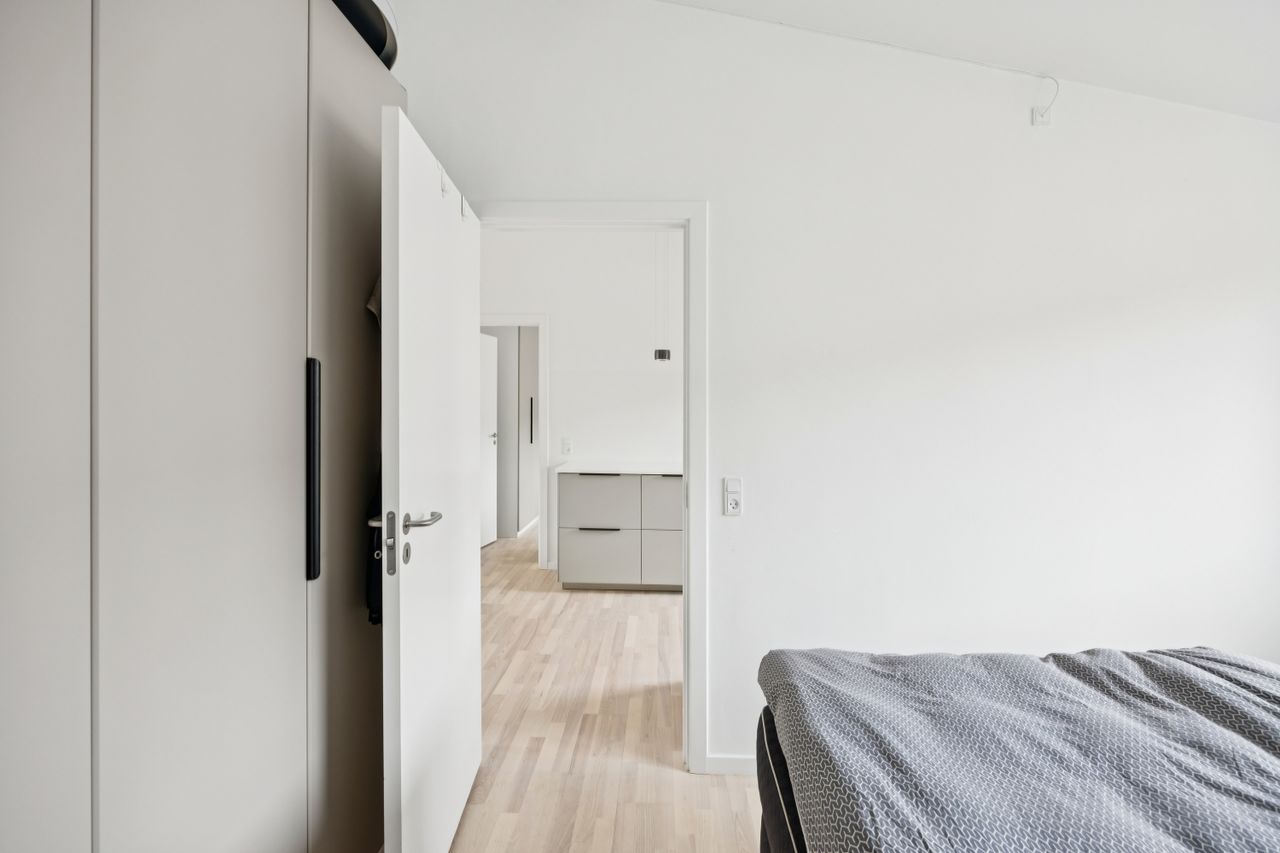 Boligen rummer i alt tre værelser, hvilket gør den ideel til både par, små familier eller dem, der ønsker et hjemmekontor. Badeværelset er elegant udført med gulvvarme og vaskesøjle.