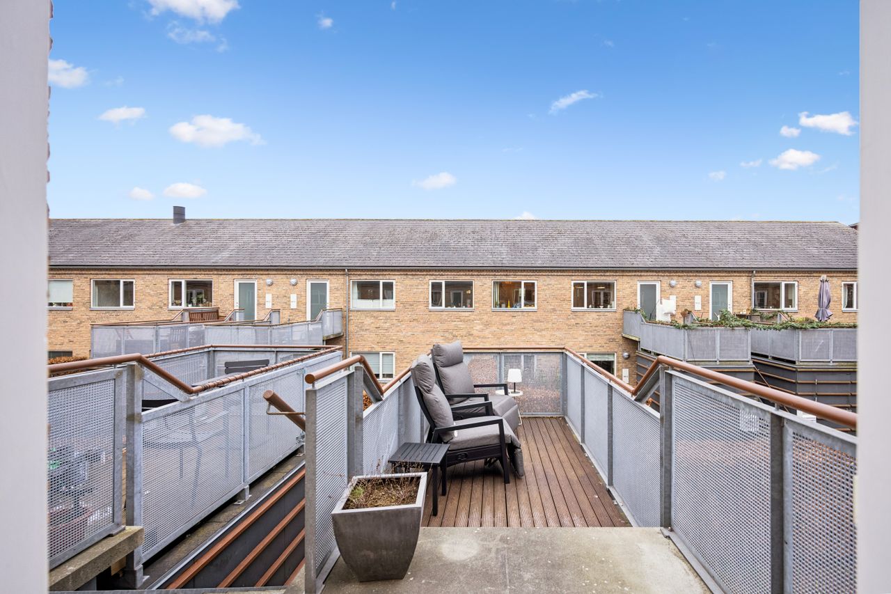 Fra hoveddøren er der udgang til en privat sydvendt terasse, hvor du kan nyde solen fra morgen til aften.