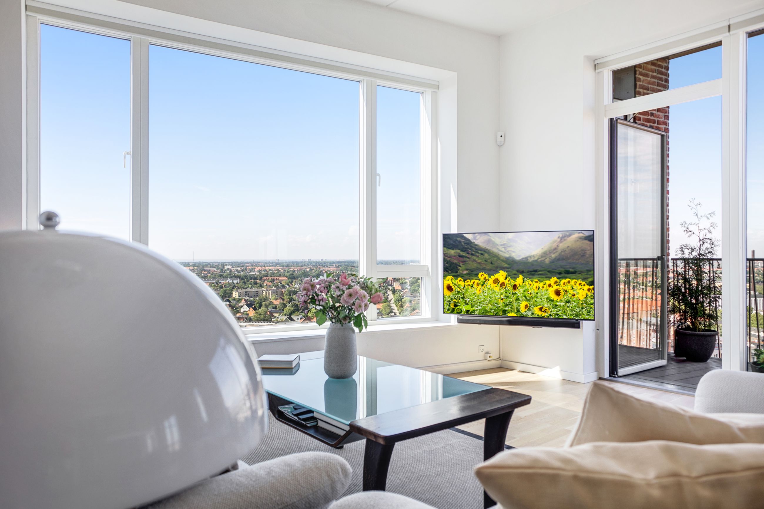 Når du træder ud på den store, private tagterrasse, er det udsigten, der sætter tonen. Herfra har du panorama over hele København – fra byens tårne til Øresund og Valby Parkens grønne vidder. Glasværnet giver frit udsyn og samtidig fuld afskærmning fra indkig.