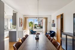 Det store køkkenalrum er lejlighedens naturlige samlingspunkt. Her er god plads til både madlavning, hverdagens måltider og hyggelige aftener med gæster. Fra alrummet åbner stuen sig op – et lyst og indbydende rum med masser af indretningsmuligheder, perfekt til både afslapning og selskabelighed.