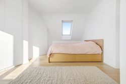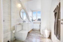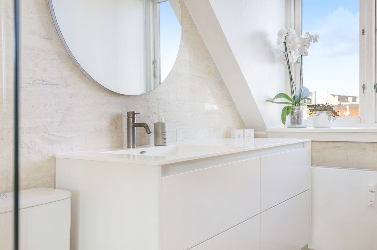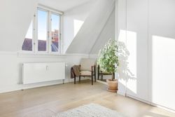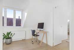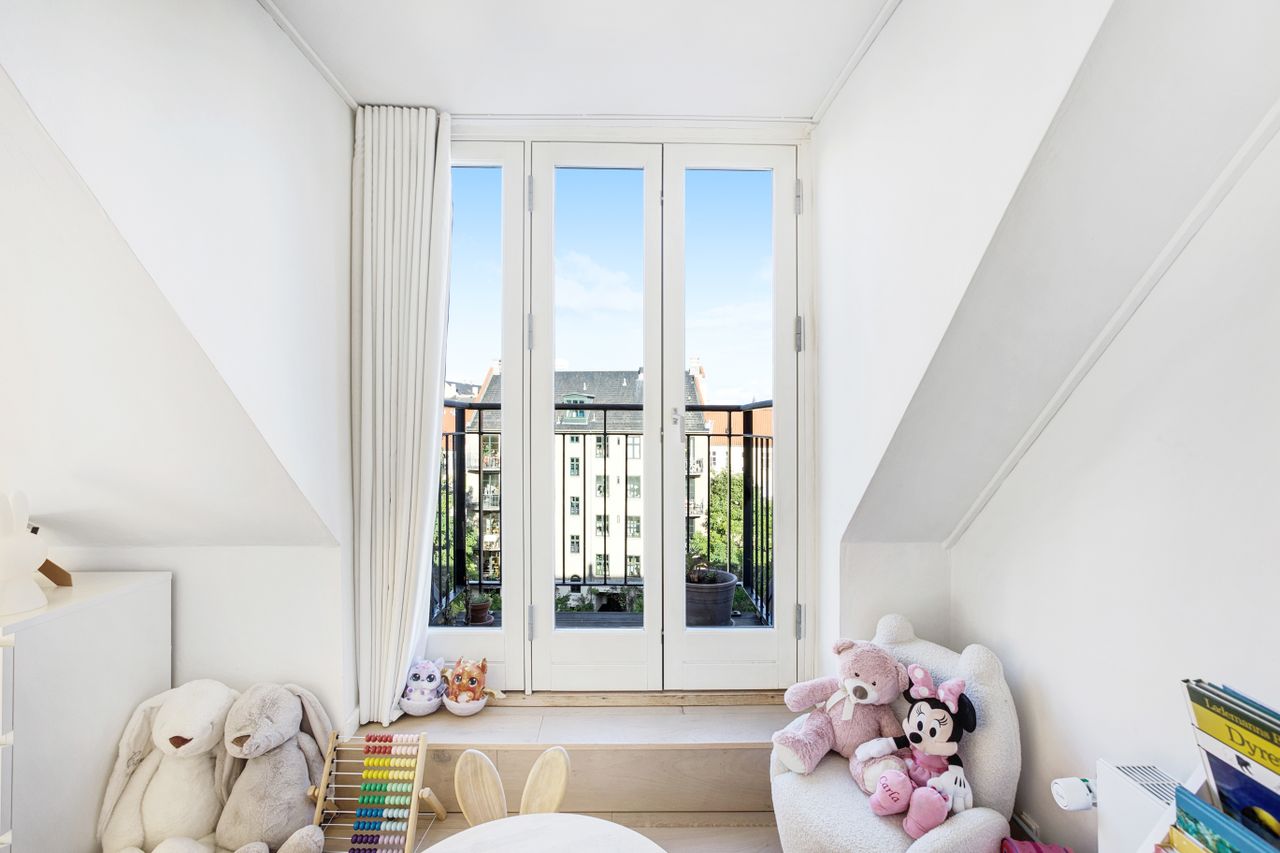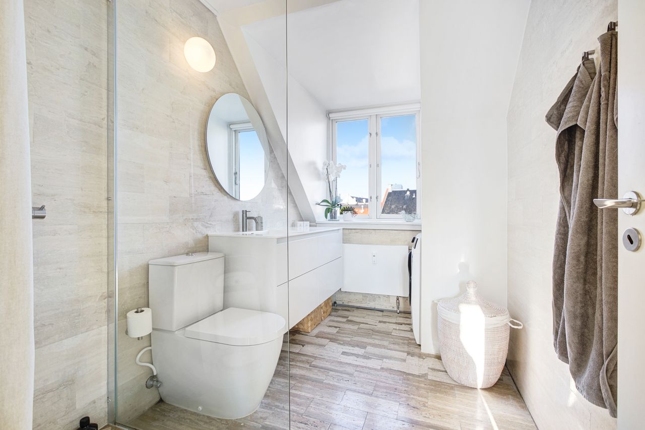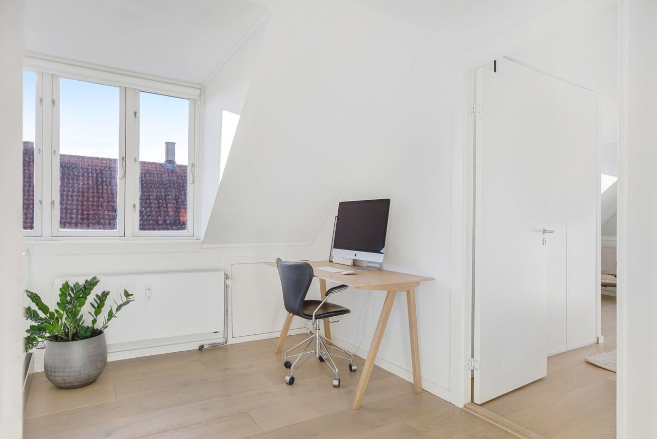 En elegant trappe fører op til boligens øverste plan, hvor man mødes af rolige og lyse rammer. Her finder du et rummeligt soveværelse med indbyggede skabe, et kontor i åben forbindelse med reposen samt et dejligt værelse med udgang til lejlighedens anden altan. Badeværelset er indrettet med lyse klinker, bruseniche og smukke overflader i en harmonisk, afdæmpet tone.