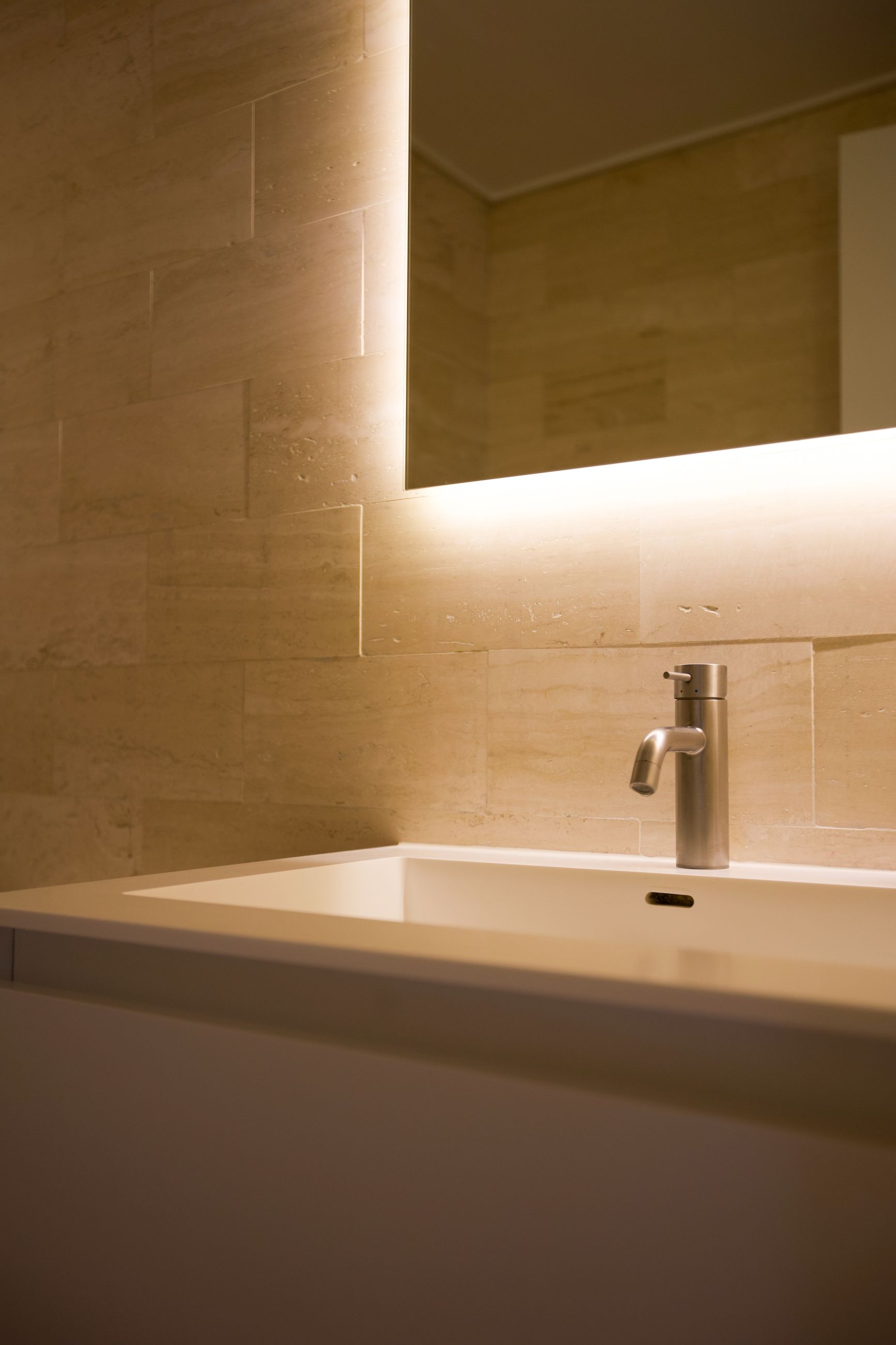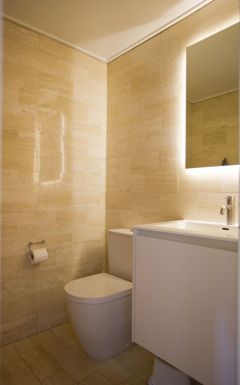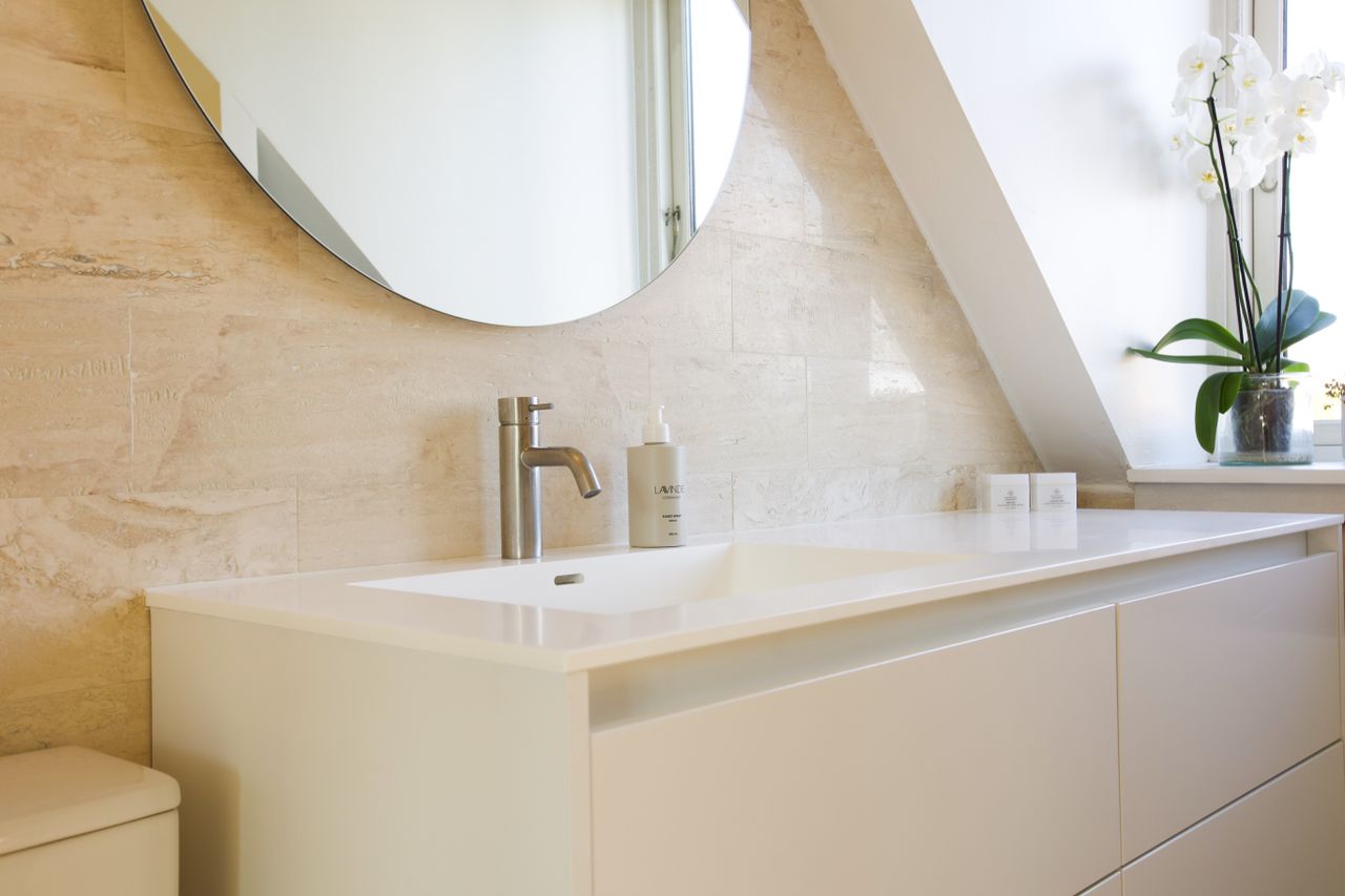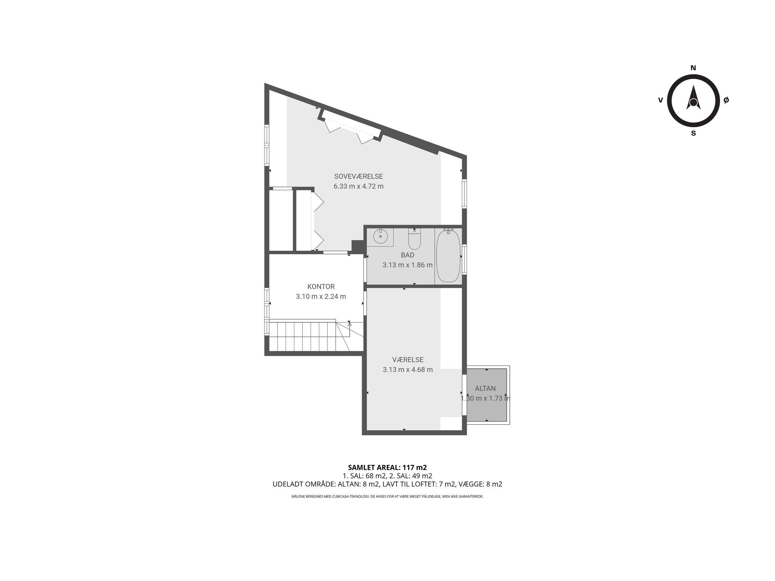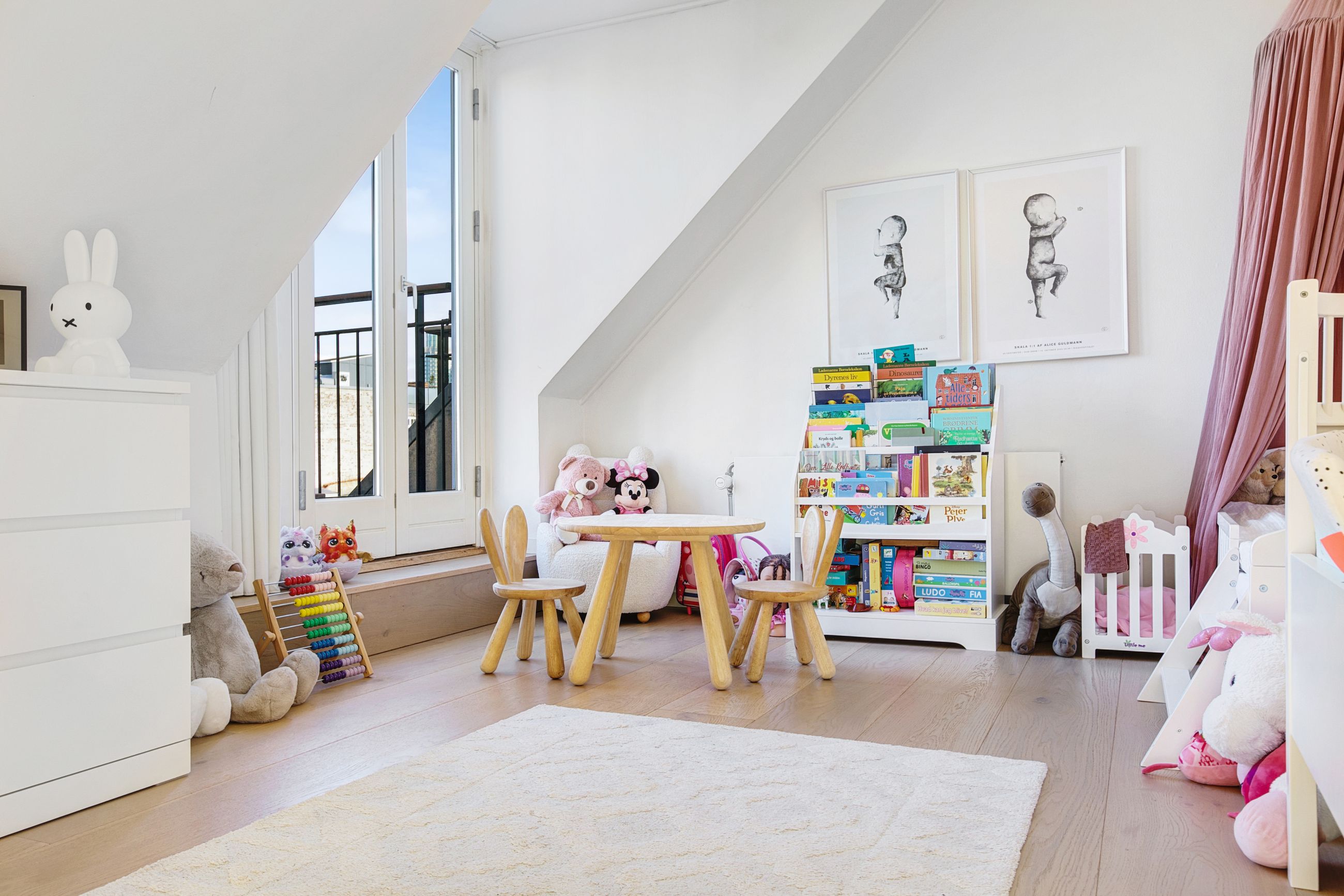 En elegant trappe fører op til boligens øverste plan, hvor man mødes af rolige og lyse rammer. Her finder du et rummeligt soveværelse med indbyggede skabe, et kontor i åben forbindelse med reposen samt et dejligt værelse med udgang til lejlighedens anden altan. Badeværelset er indrettet med lyse klinker, bruseniche og smukke overflader i en harmonisk, afdæmpet tone.