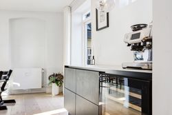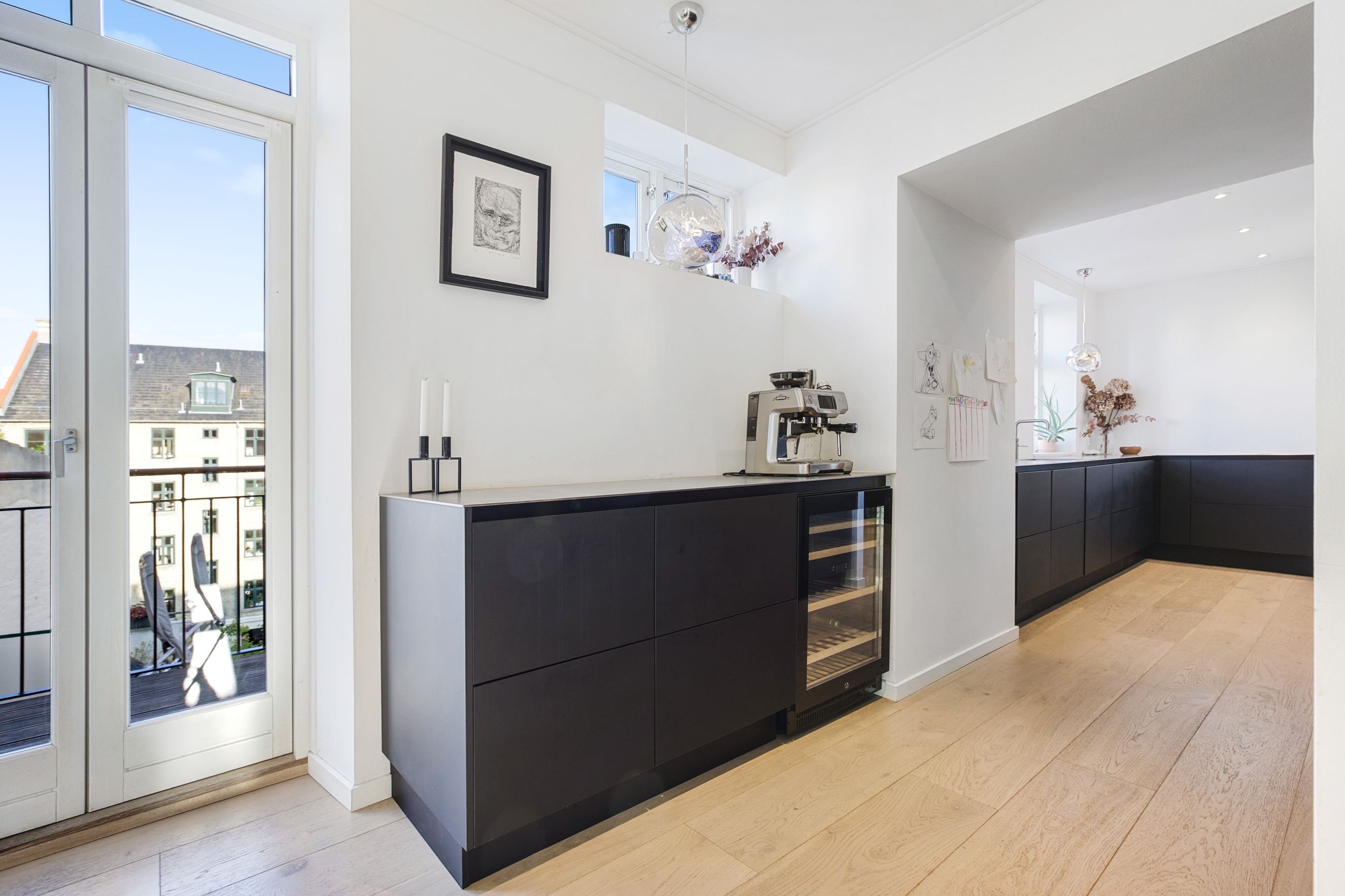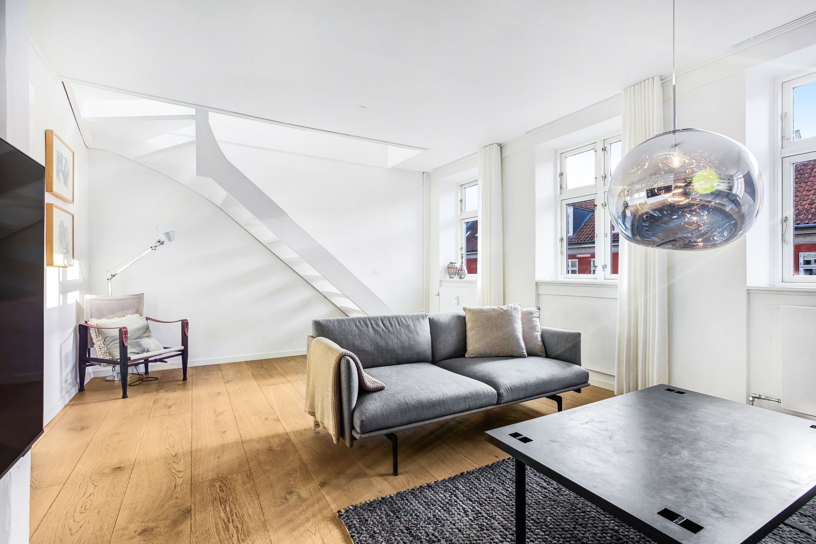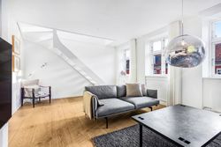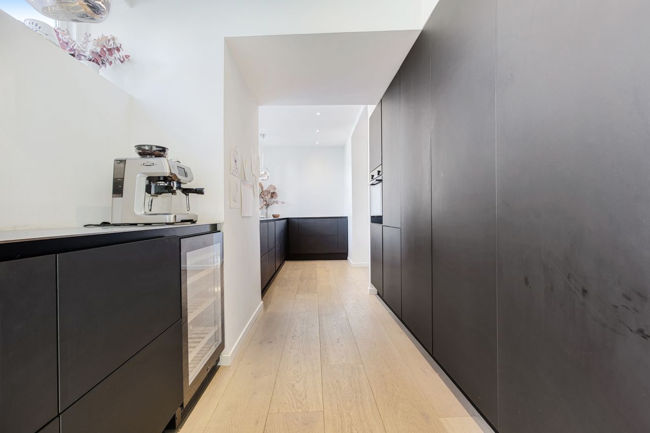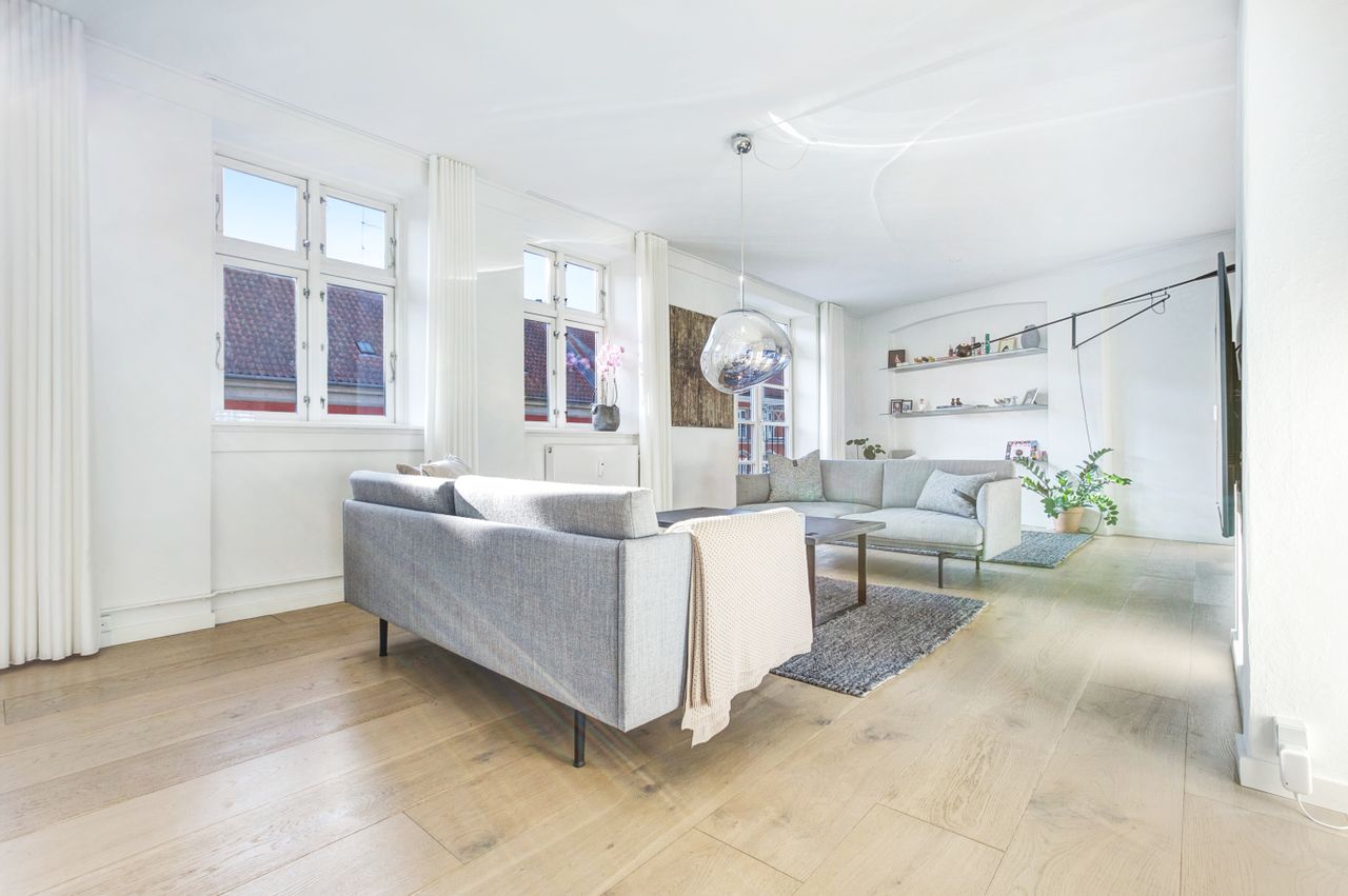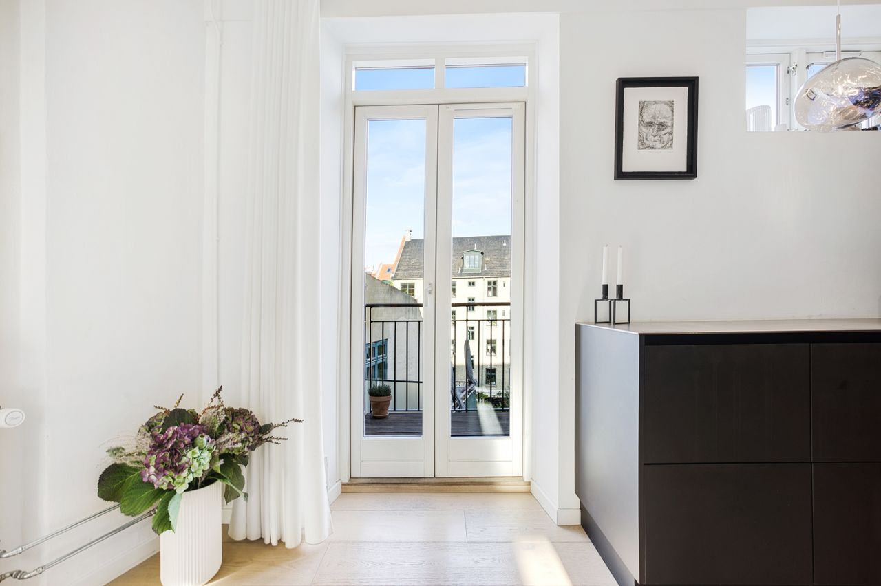 Lejligheden fordeler sig over to etager og fremstår både elegant og funktionel med et flot sammenhængende udtryk. På første sal bydes du velkommen i en rummelig entré, der åbner sig mod et stilrent køkken med mørke, grebsløse fronter og god bordplads. Køkkenet ligger i åben forbindelse med spisestue og stue, hvor de store vinduer og den markante loftshøjde skaber en helt særlig rumfornemmelse. Her er luft, lys og en klar fornemmelse af kvalitet. Fra stuen er der udgang til en solrig altan med udsigt mod gården – et perfekt spot til et glas vin i aftensolen. Et gæstetoilet fuldender etagen.