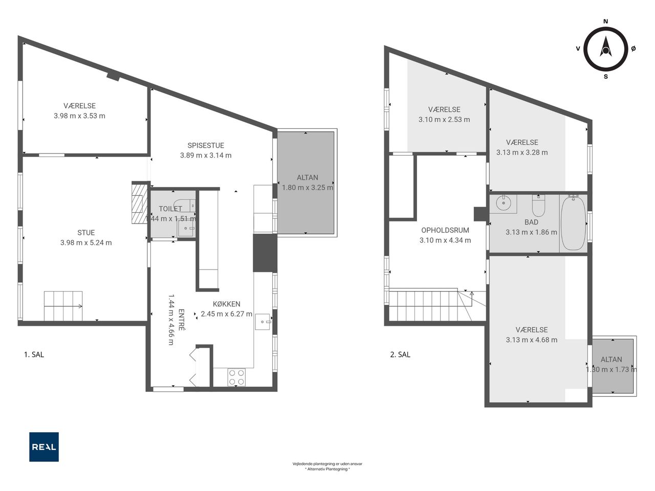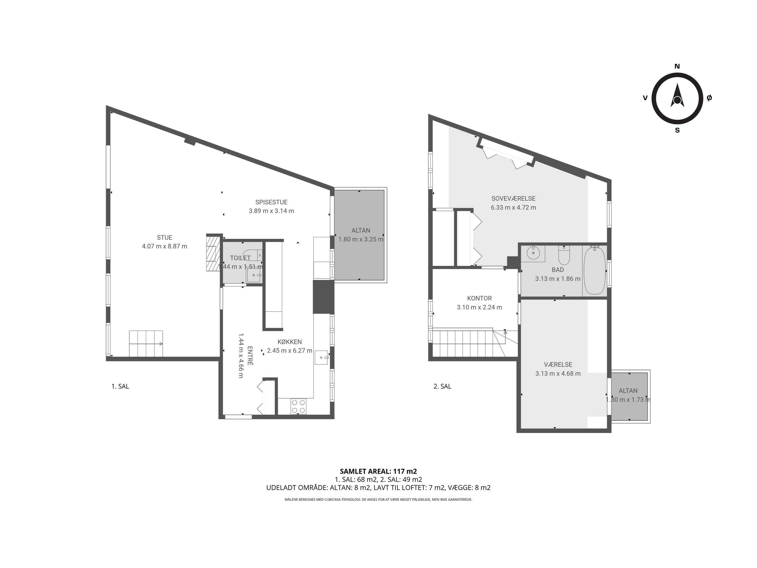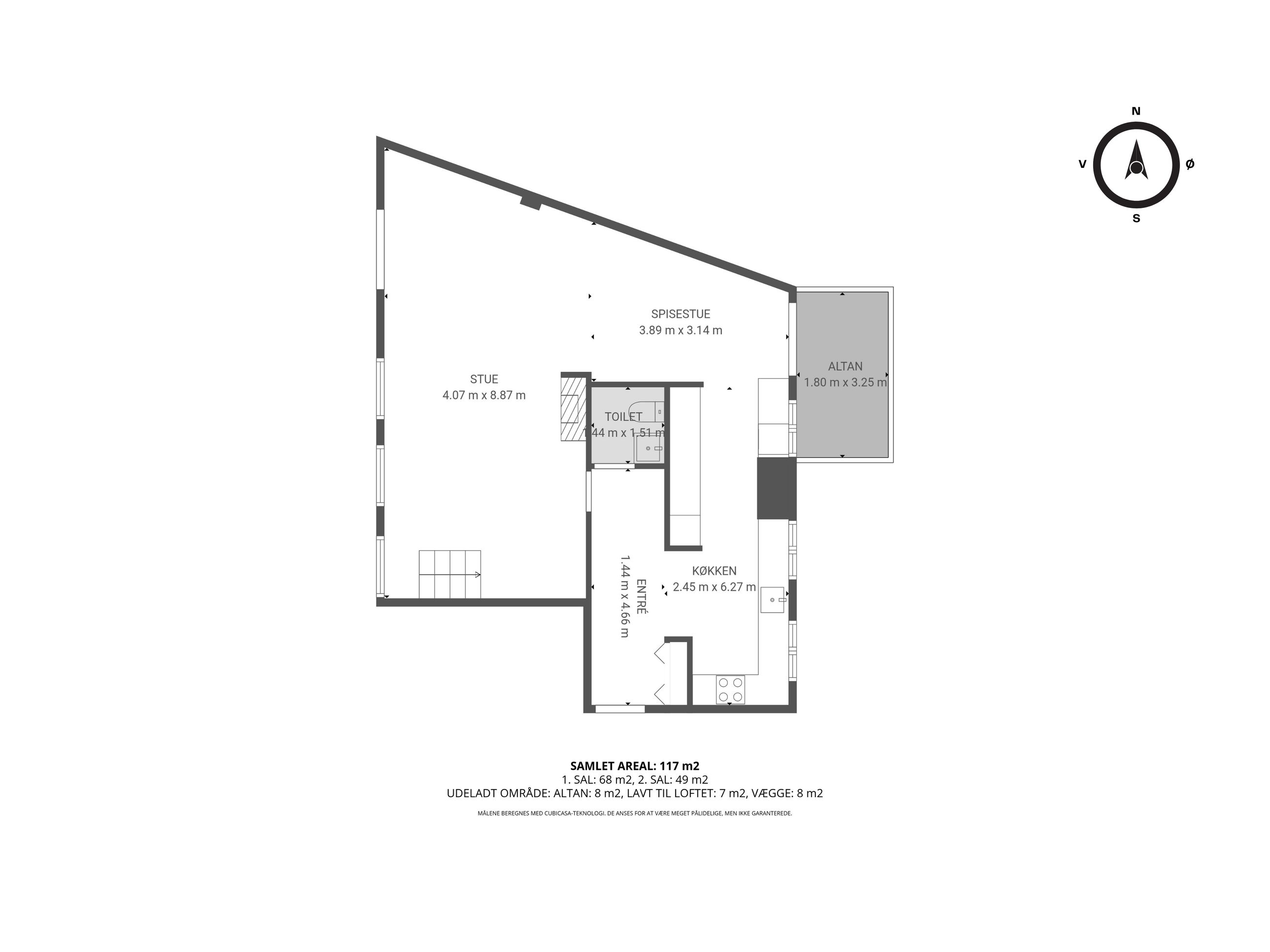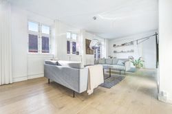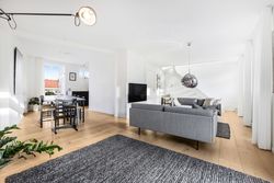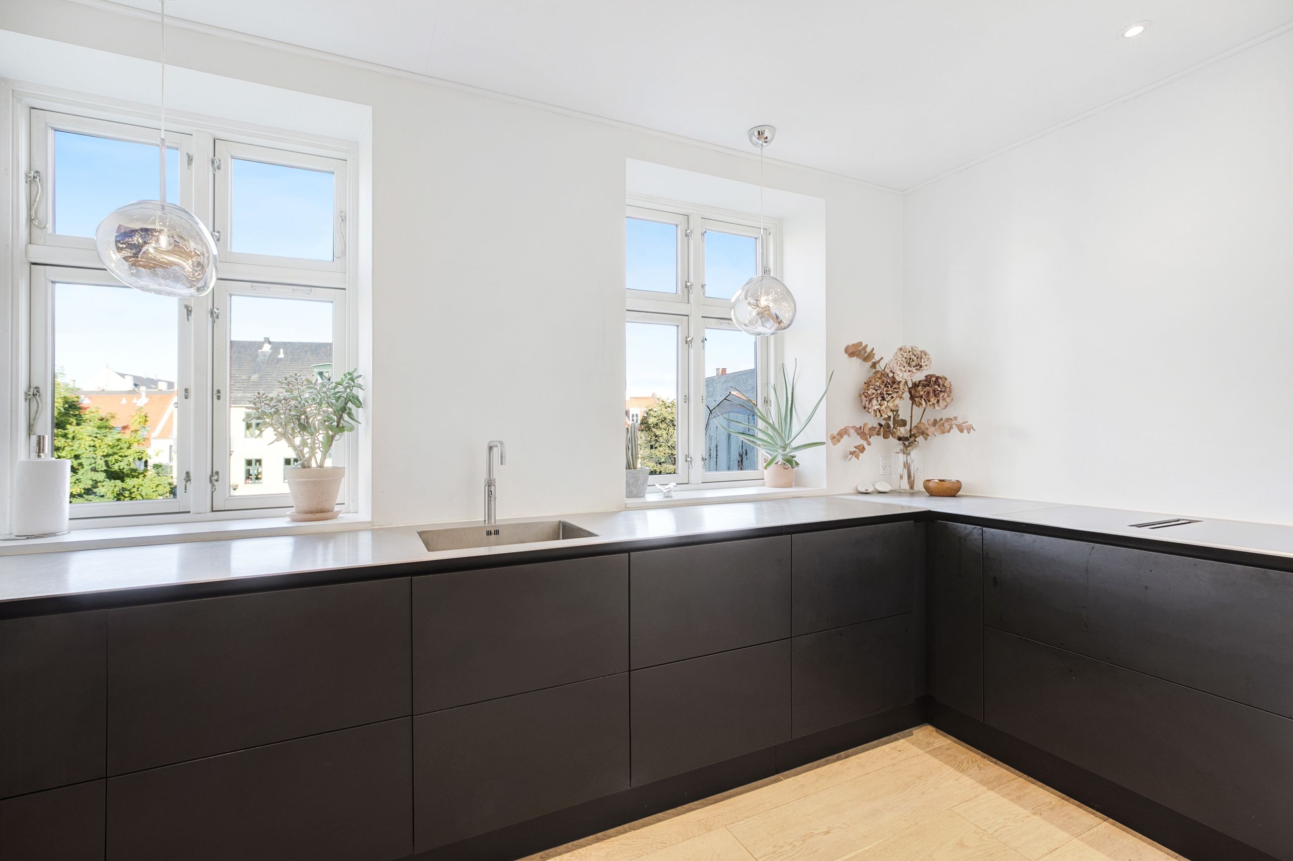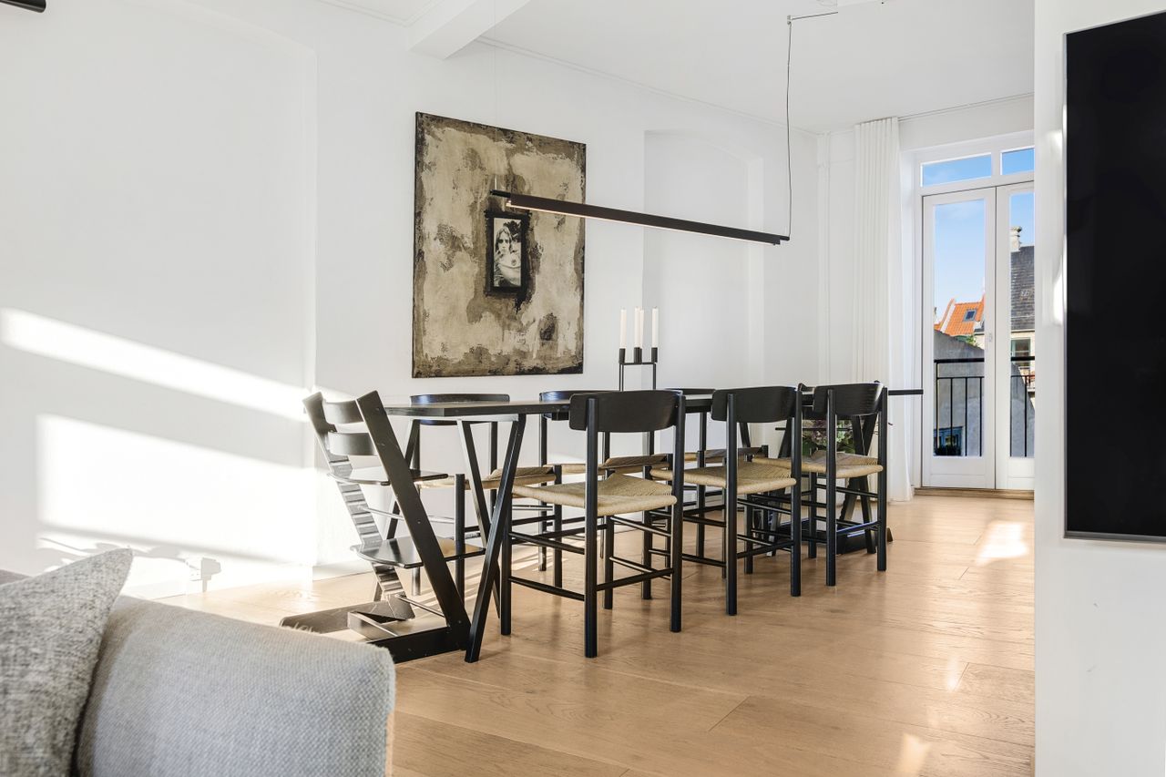 Lejligheden fordeler sig over to etager og fremstår både elegant og funktionel med et flot sammenhængende udtryk. På første sal bydes du velkommen i en rummelig entré, der åbner sig mod et stilrent køkken med mørke, grebsløse fronter og god bordplads. Køkkenet ligger i åben forbindelse med spisestue og stue, hvor de store vinduer og den markante loftshøjde skaber en helt særlig rumfornemmelse. Her er luft, lys og en klar fornemmelse af kvalitet. Fra stuen er der udgang til en solrig altan med udsigt mod gården – et perfekt spot til et glas vin i aftensolen. Et gæstetoilet fuldender etagen.