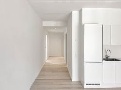 Boligens hjerte er det åbne opholdsrum, hvor det stilrene køkken smelter naturligt sammen med stuen. Her er god plads til både spisebord og sofaarrangement – og udgangen til den franske altan skaber en fin forbindelse til alrummet.