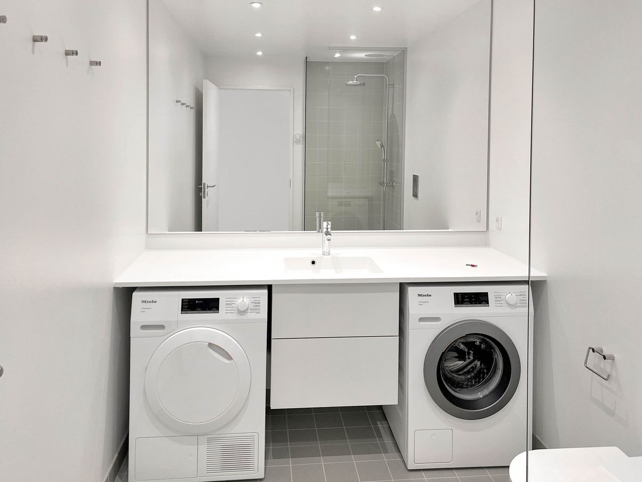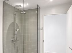 Soveværelset er rummeligt med mulighed for god opbevaring, mens badeværelset er opført i moderne stil med separat bruseniche og vaskesøjle.