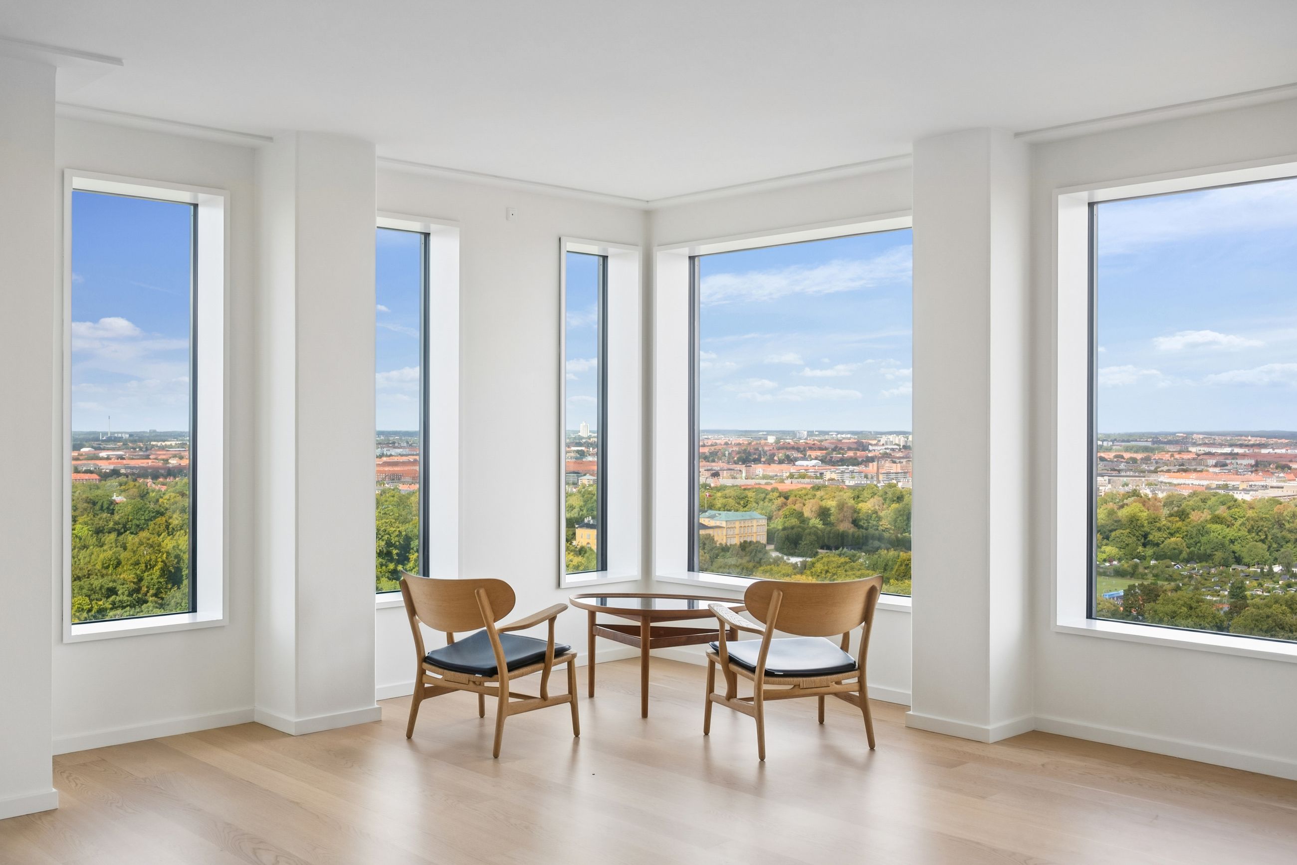 En bolig i højden, hvor moderne komfort møder gennemtænkt indretning og et spektakulært lysindfald.
