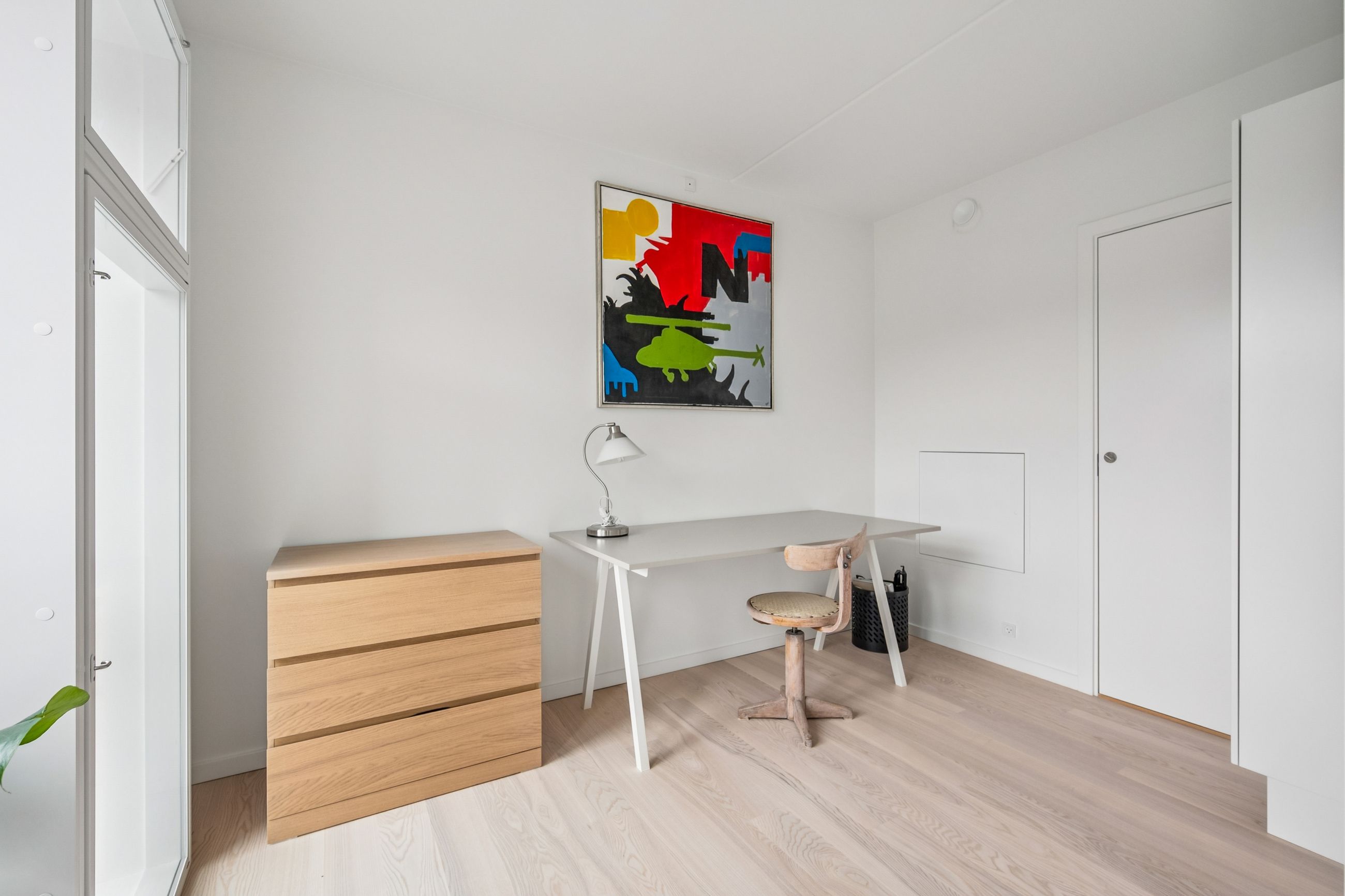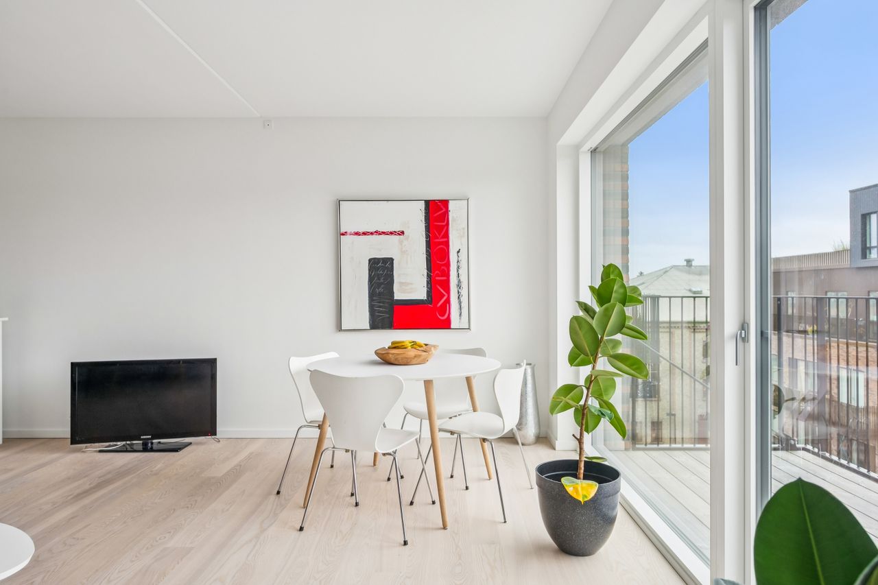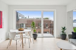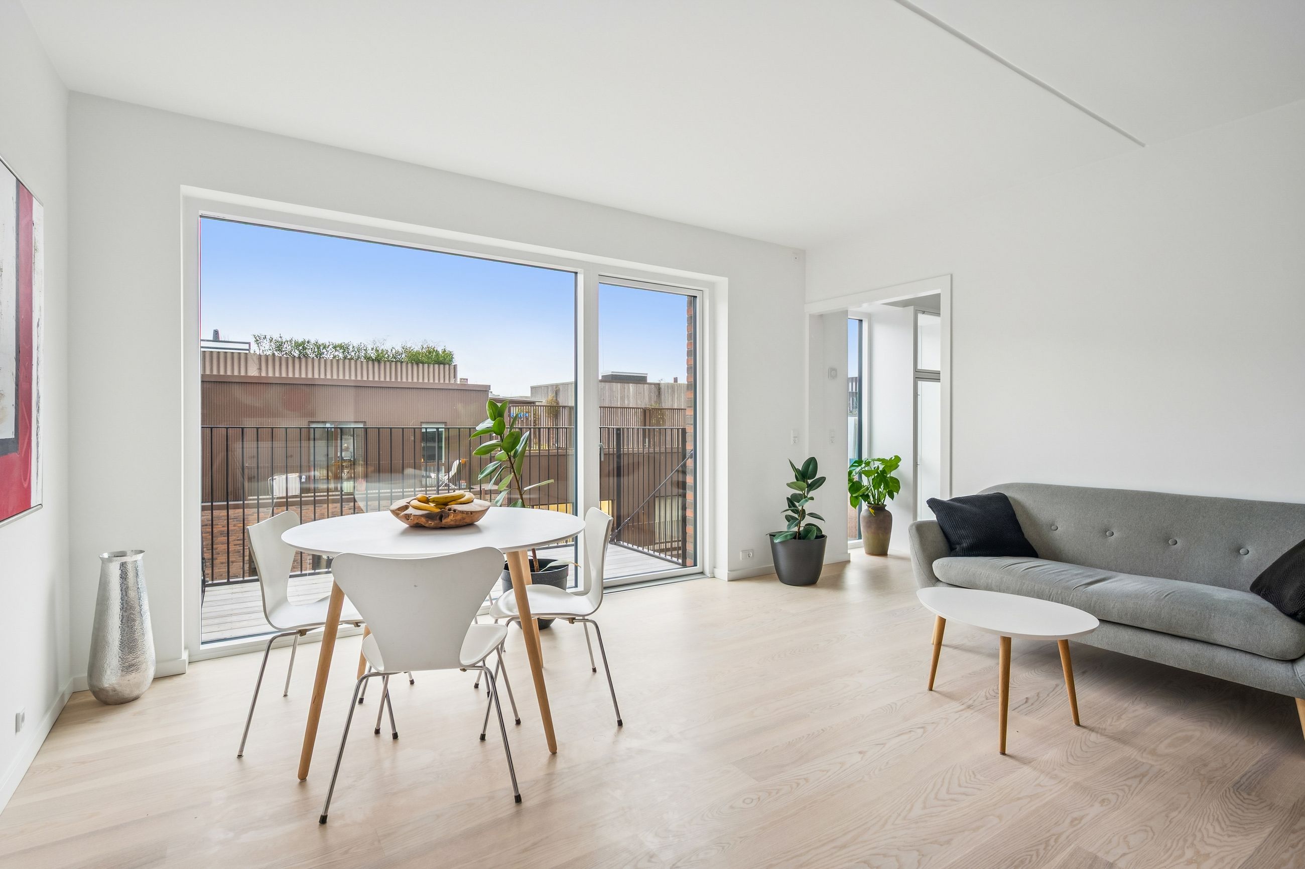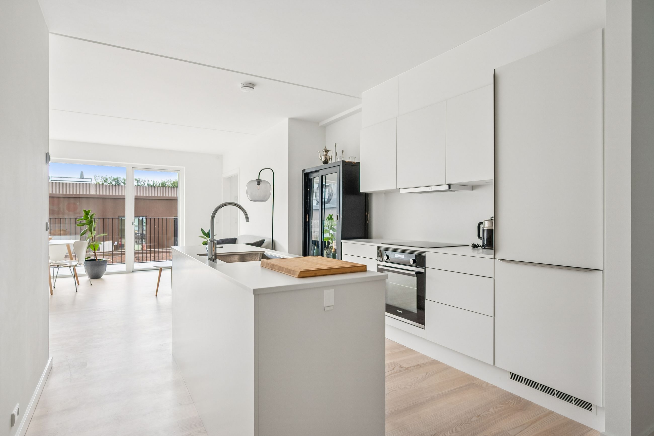Når du træder ind i lejligheden, får du et godt førstehåndsindtryk. Boligens naturlige samlingspunkt er det store, åbne køkken-alrum med stue i forlængelse. De store vinduespartier fylder rummet med lys og skaber en behagelig og rummelig atmosfære. Herfra er der direkte adgang til en vestvendt altan, hvor solen kan nydes det meste af dagen – perfekt til hyggelige sommerdage. Lejligheden byder på to rummelige værelser. Master bedroom har et praktisk ekstra rum, ideelt som walk-in-closet eller til andet opbevaring. Det andet værelse er fleksibelt og kan indrettes efter behov, for eksempel som børneværelse, hjemmekontor eller gæsteværelse. Lejligheden rummer samtidig en moderne og indbydende badeværelse med et elegant design, der kombinerer funktionalitet og æstetik på bedste vis.