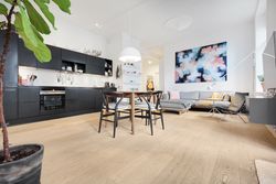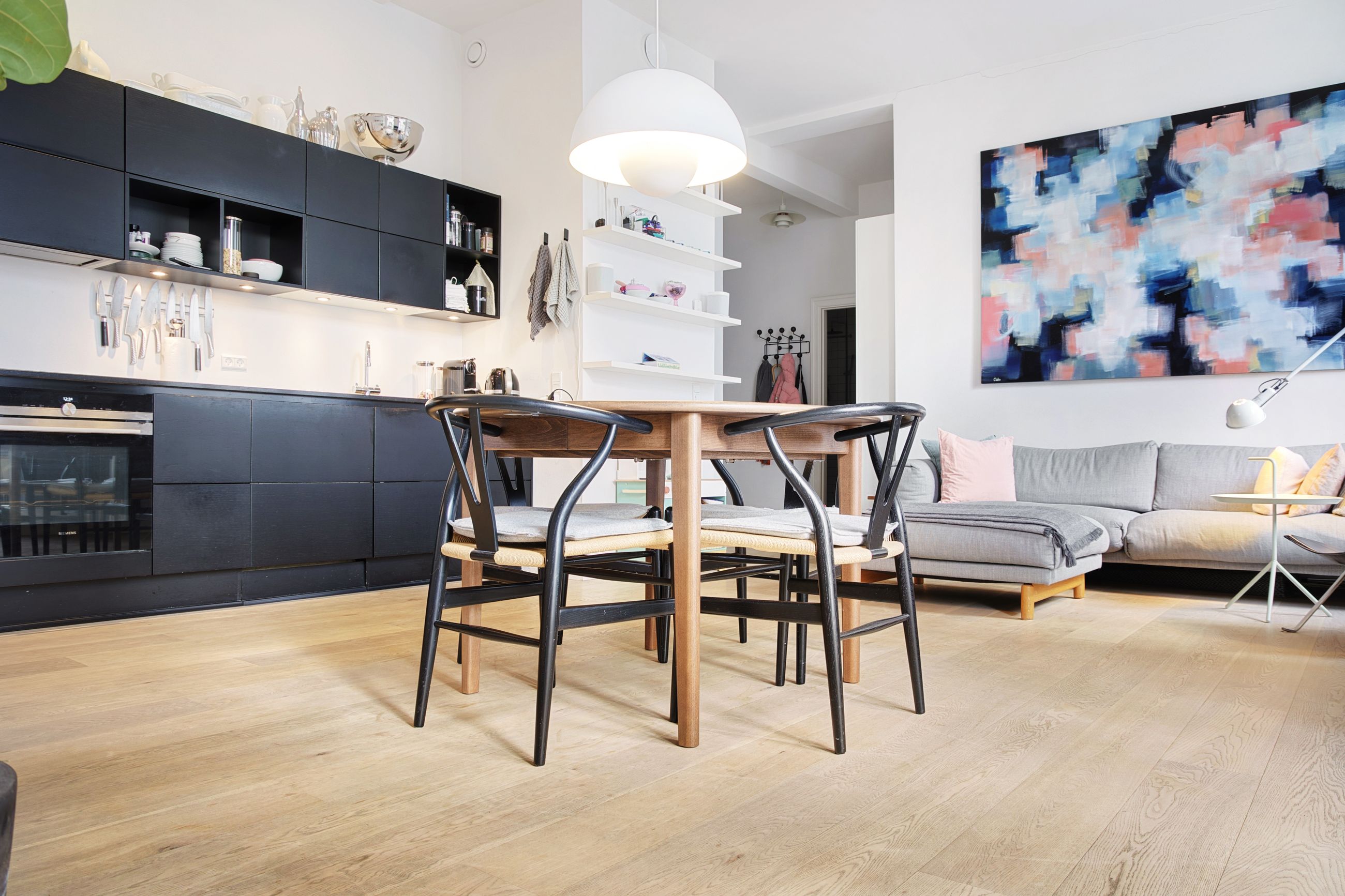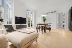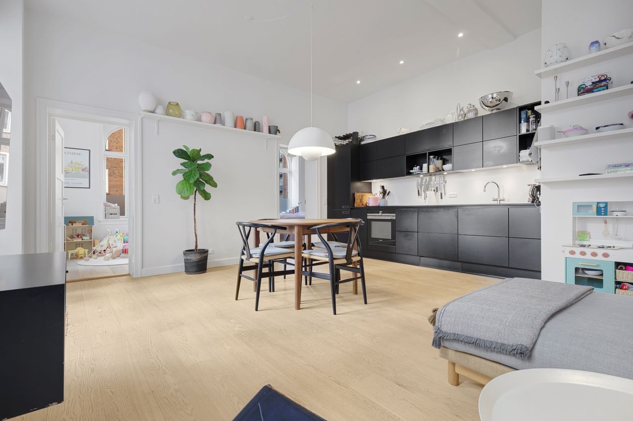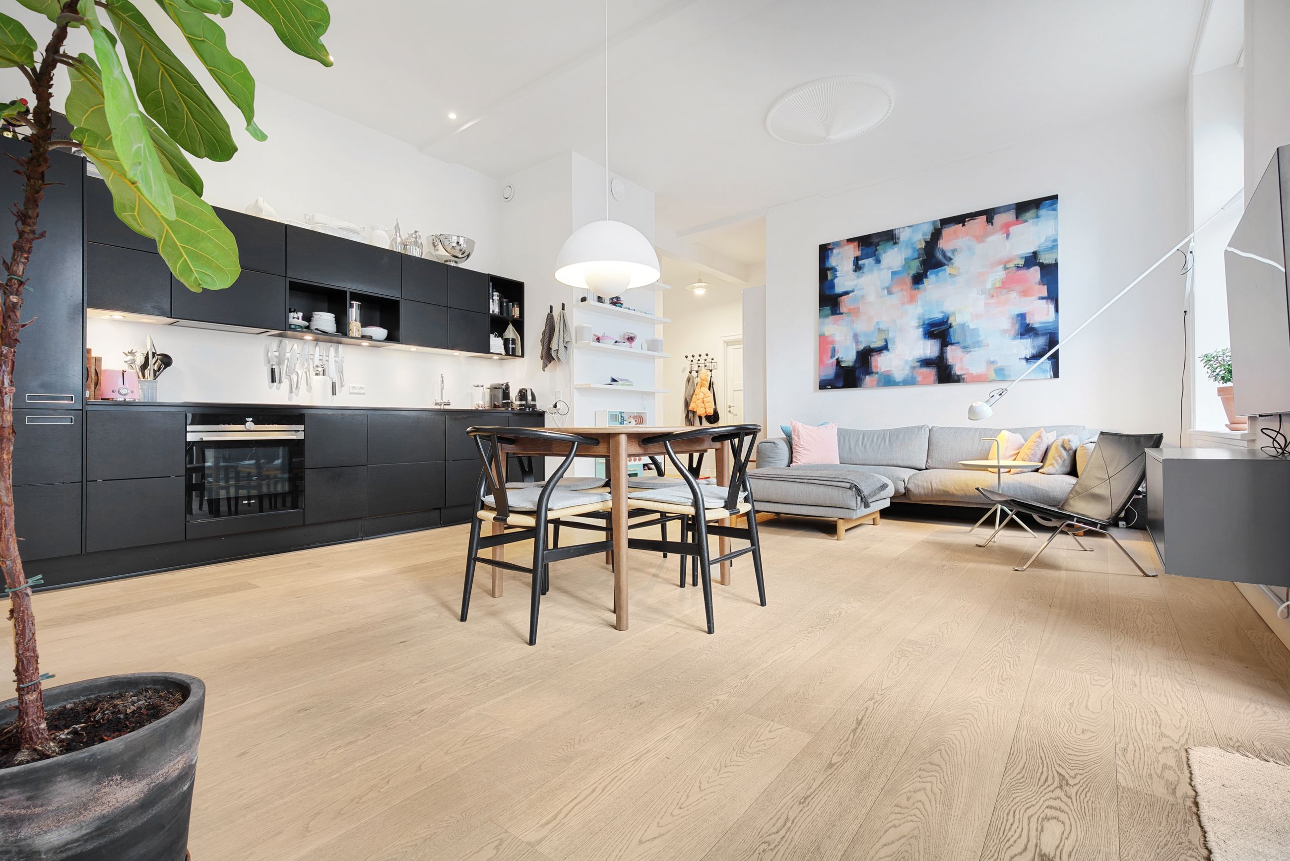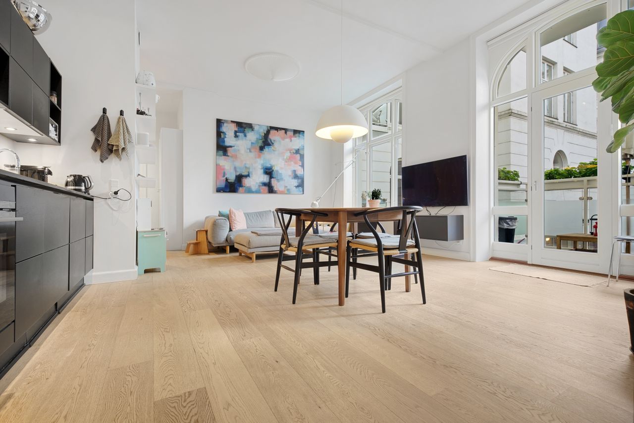 Lejligheden fremstår i dag som en moderne og tidssvarende bolig, hvor du får fornemmelsen af en næsten ny lejlighed, samtidig med at ejendommens historie og sjæl stadig er tydelig. Her er der tænkt over detaljerne, og planløsningen er skabt til et moderne hverdagsliv. Gulvvarme i hele lejligheden sikrer varme og komfort året rundt, og store vinduespartier giver et flot lysindfald og en åben, indbydende atmosfære.