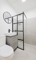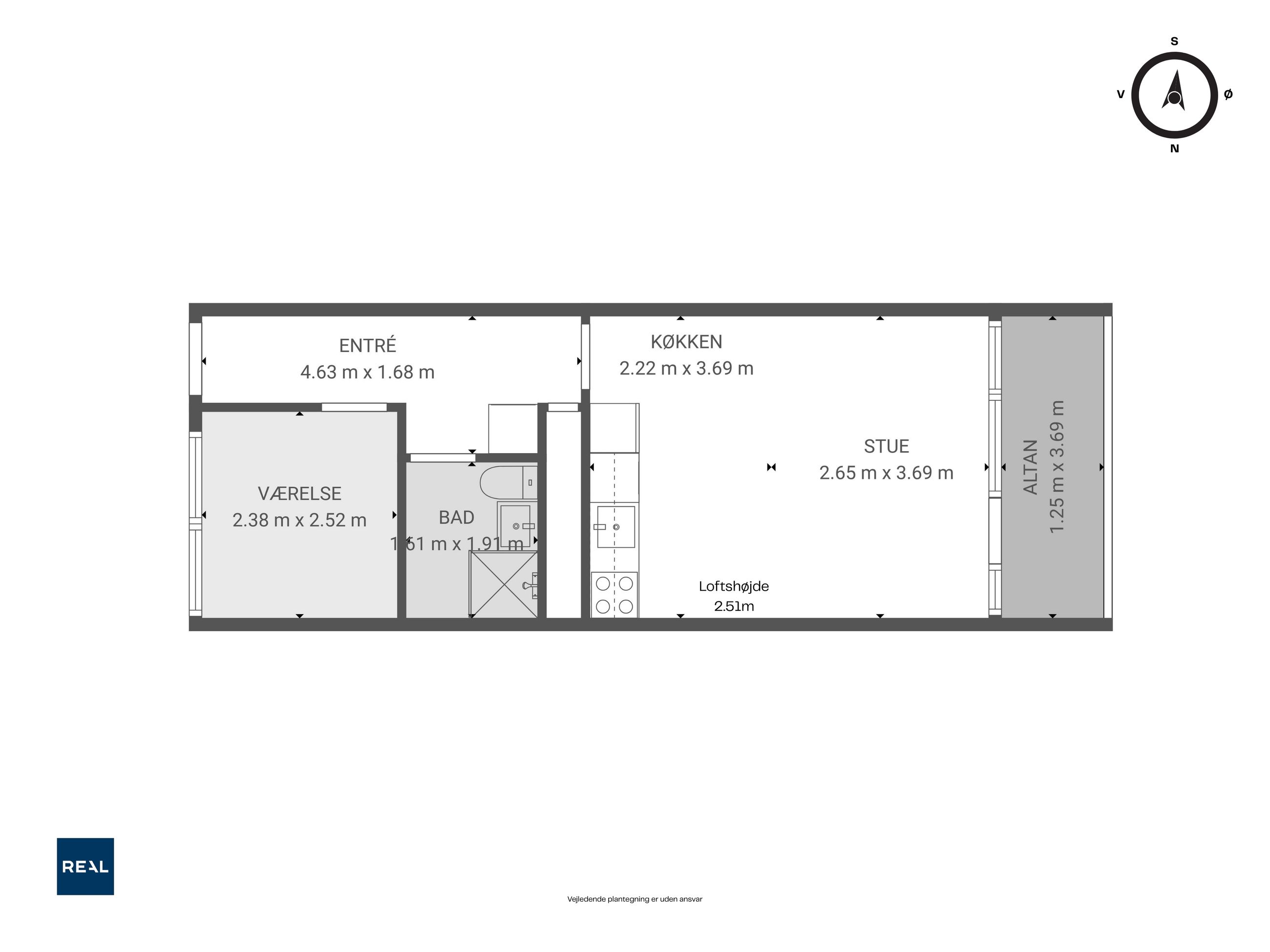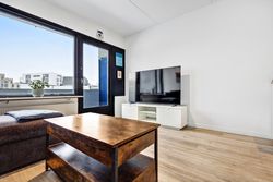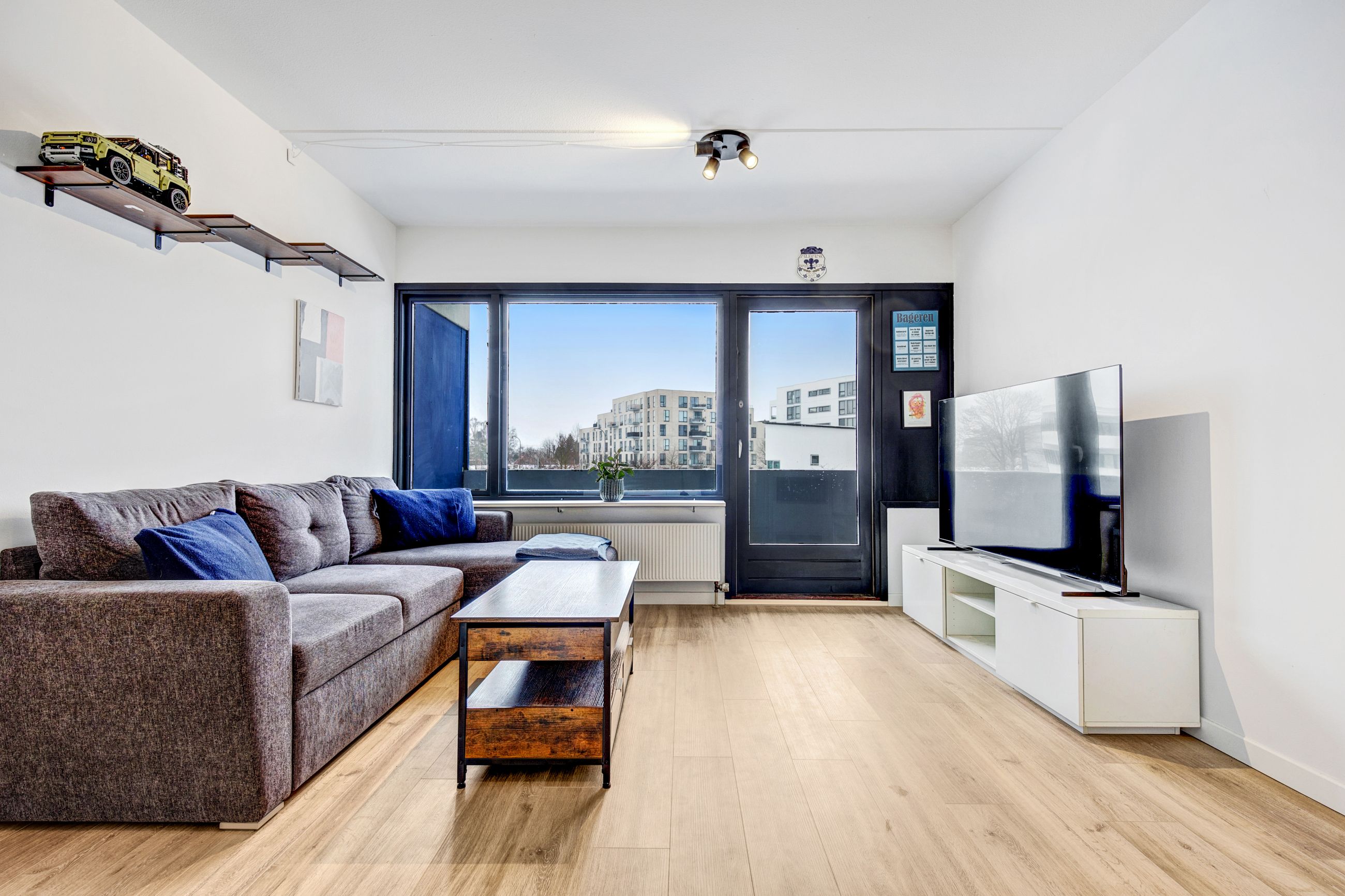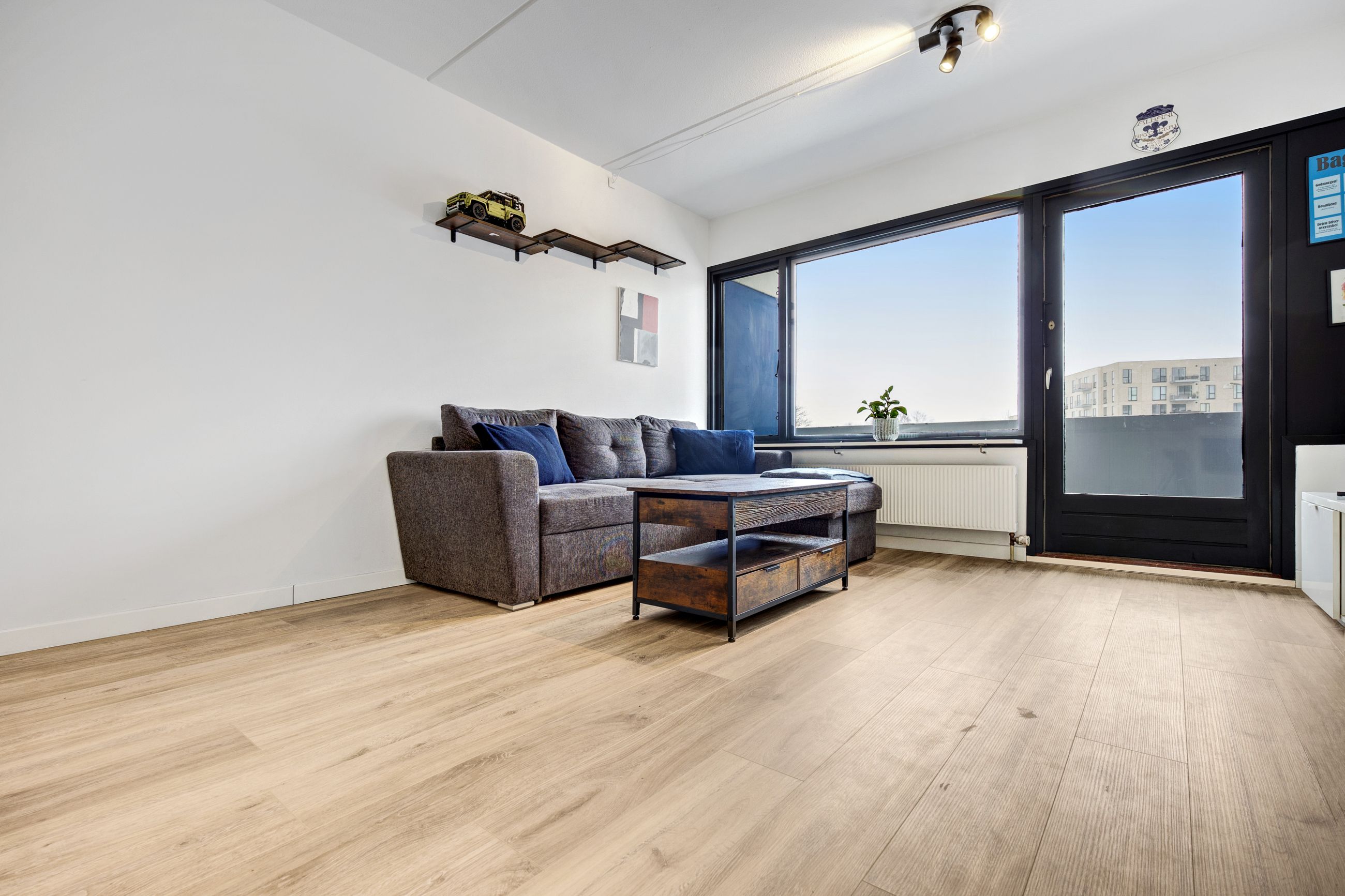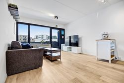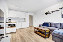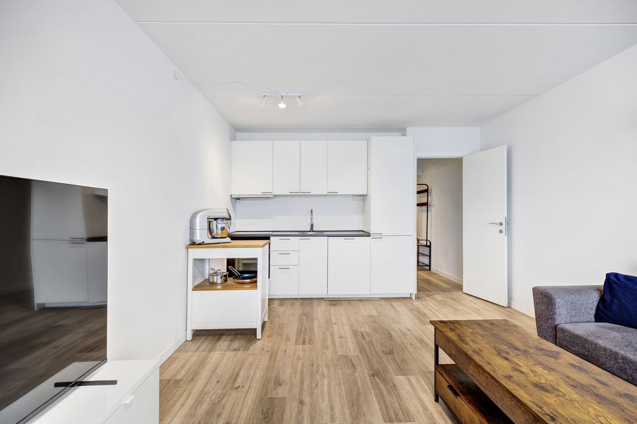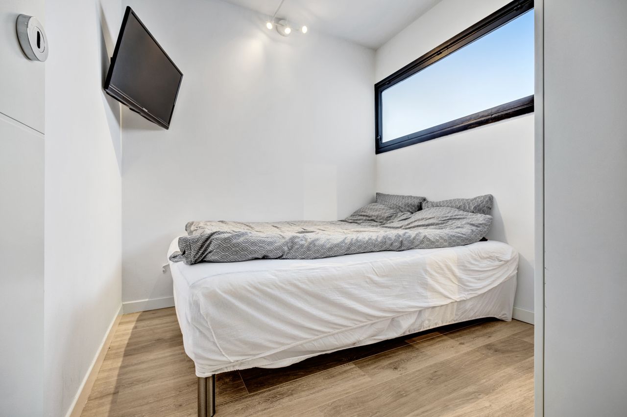 Soveværelset er regulært med plads til både seng og opbevaring. Planløsningen er veldisponeret og giver en naturlig sammenhæng mellem rummene. Badeværelset fremstår med separat bruseniche og et enkelt udtryk.