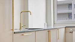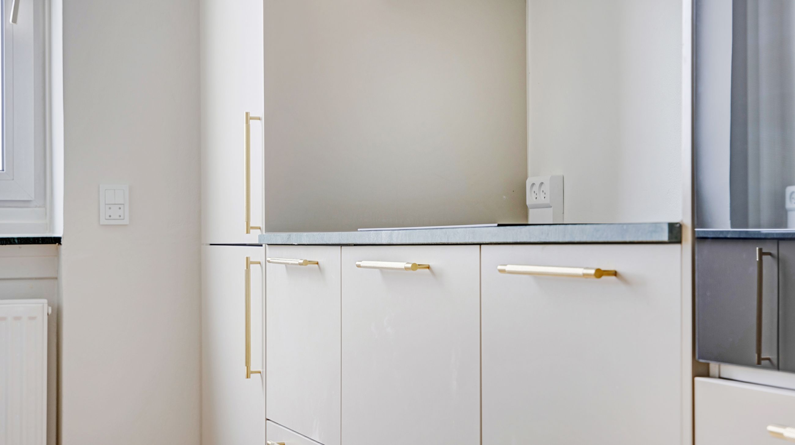 Køkkenet er stilrent og funktionelt med hvide elementer, god skabs- og bordplads samt integrerede hårde hvidevarer. Her er rammerne ideelle for både hverdagens madlavning og hyggelige stunder.