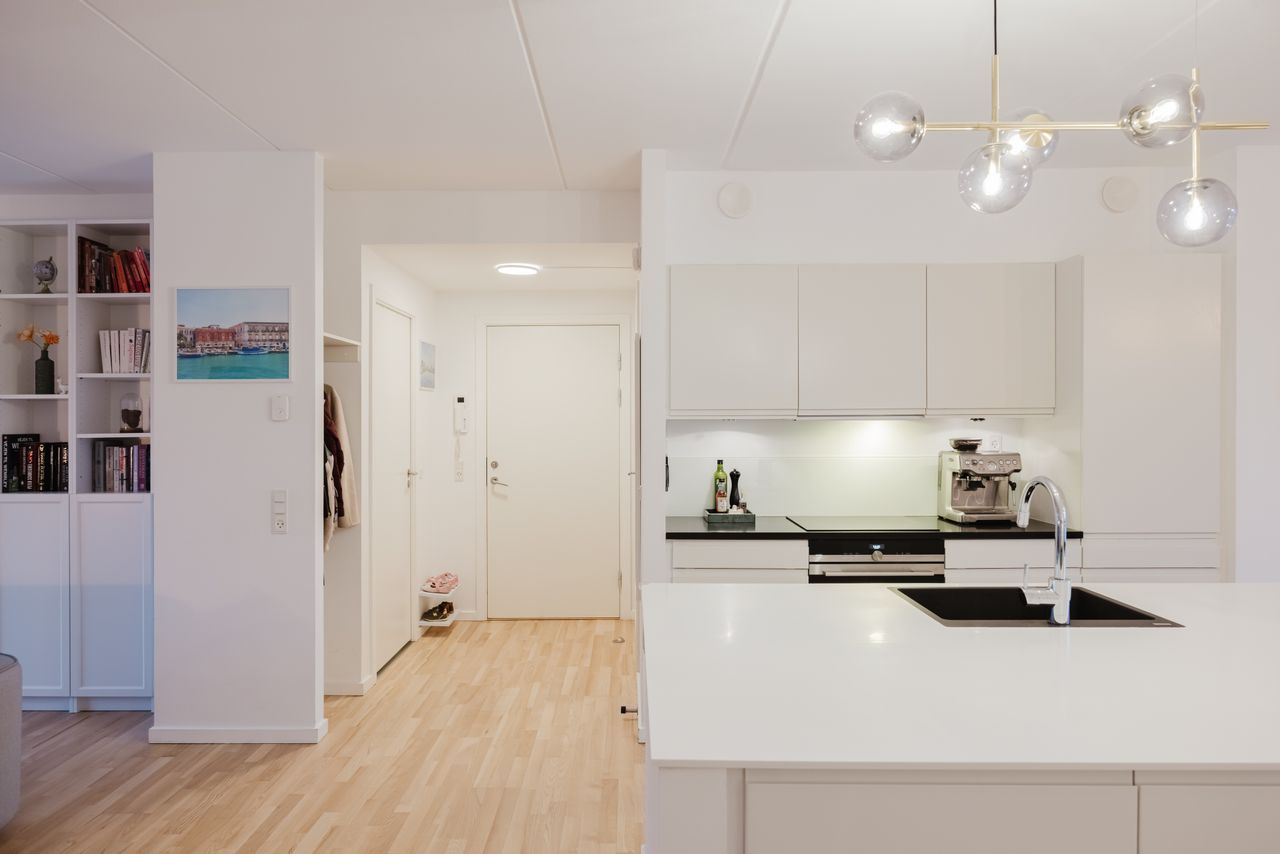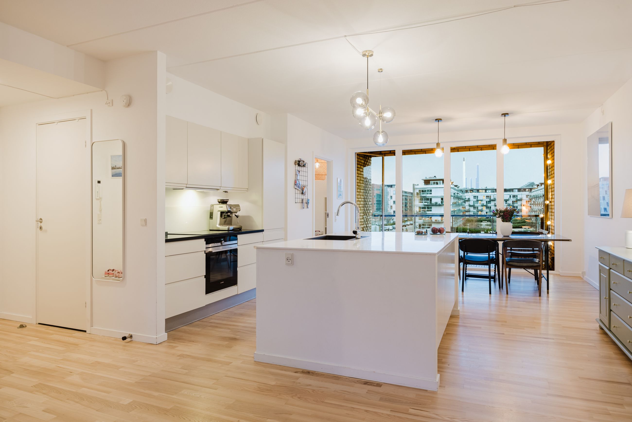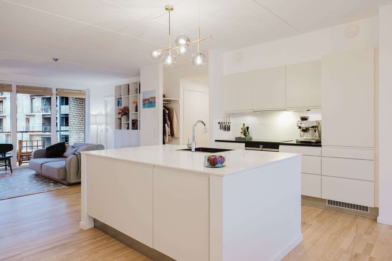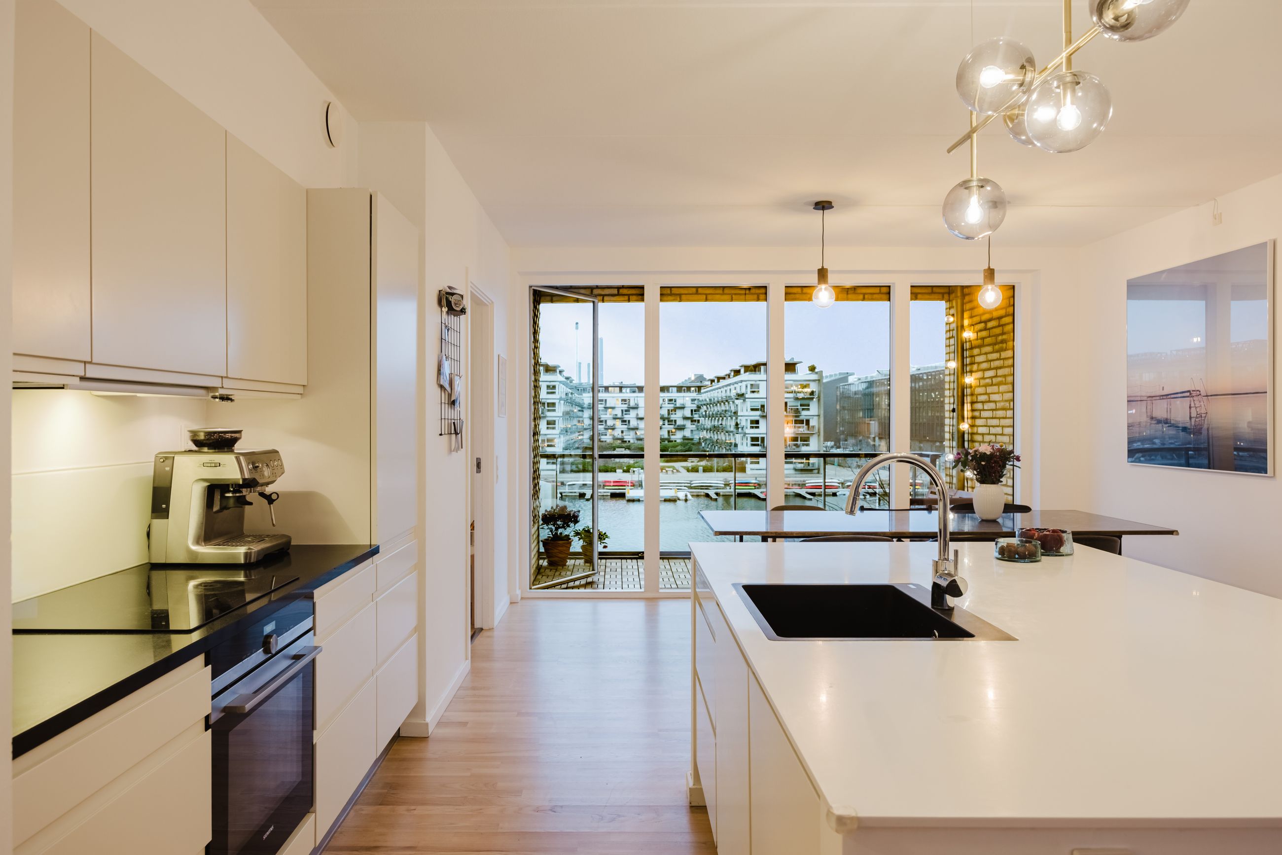 Hjertet i boligen er det store køkkenalrum og stue i åben forbindelse, et lyst, indbydende rum med plads til både madlavning, samvær og afslapning. Det tidløse køkken har hvide elementer, god bordplads og integrerede løsninger, der gør hverdagen let og elegant. Herfra er der udgang til to rummelige altaner, hvor morgensolen, havnelivet og de smukke solopgange kan nydes i fulde drag.