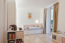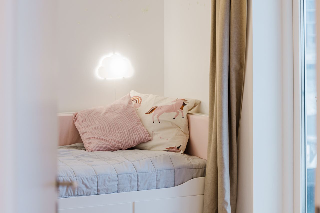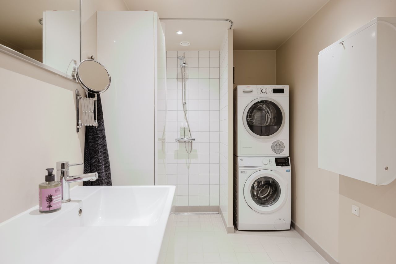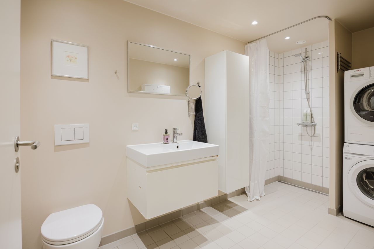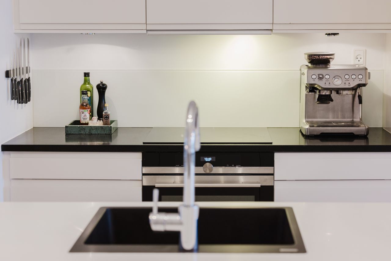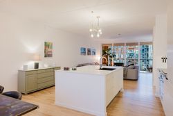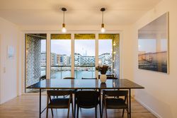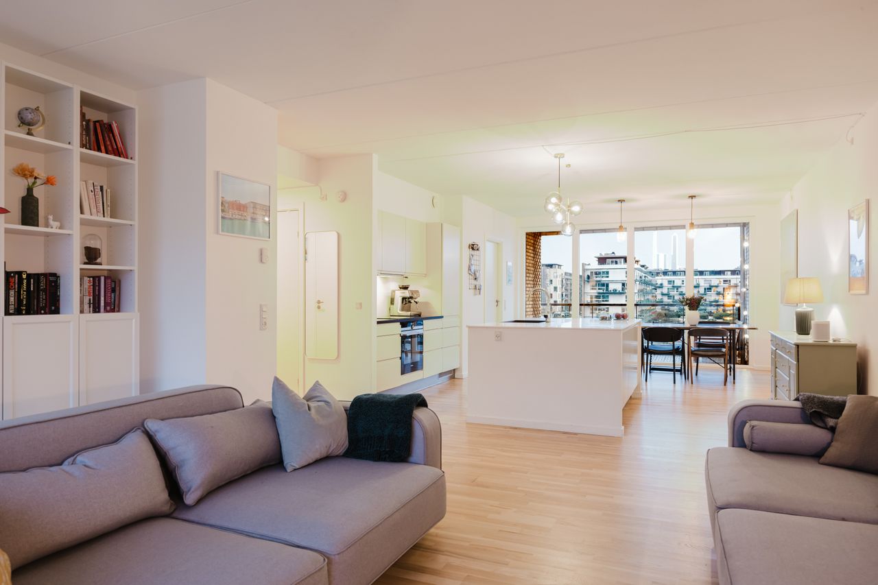 Hjertet i boligen er det store køkkenalrum og stue i åben forbindelse, et lyst, indbydende rum med plads til både madlavning, samvær og afslapning. Det tidløse køkken har hvide elementer, god bordplads og integrerede løsninger, der gør hverdagen let og elegant. Herfra er der udgang til to rummelige altaner, hvor morgensolen, havnelivet og de smukke solopgange kan nydes i fulde drag.
