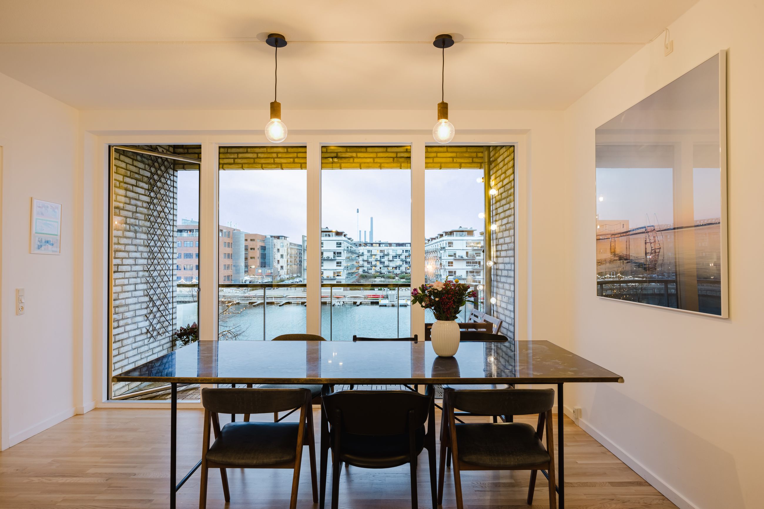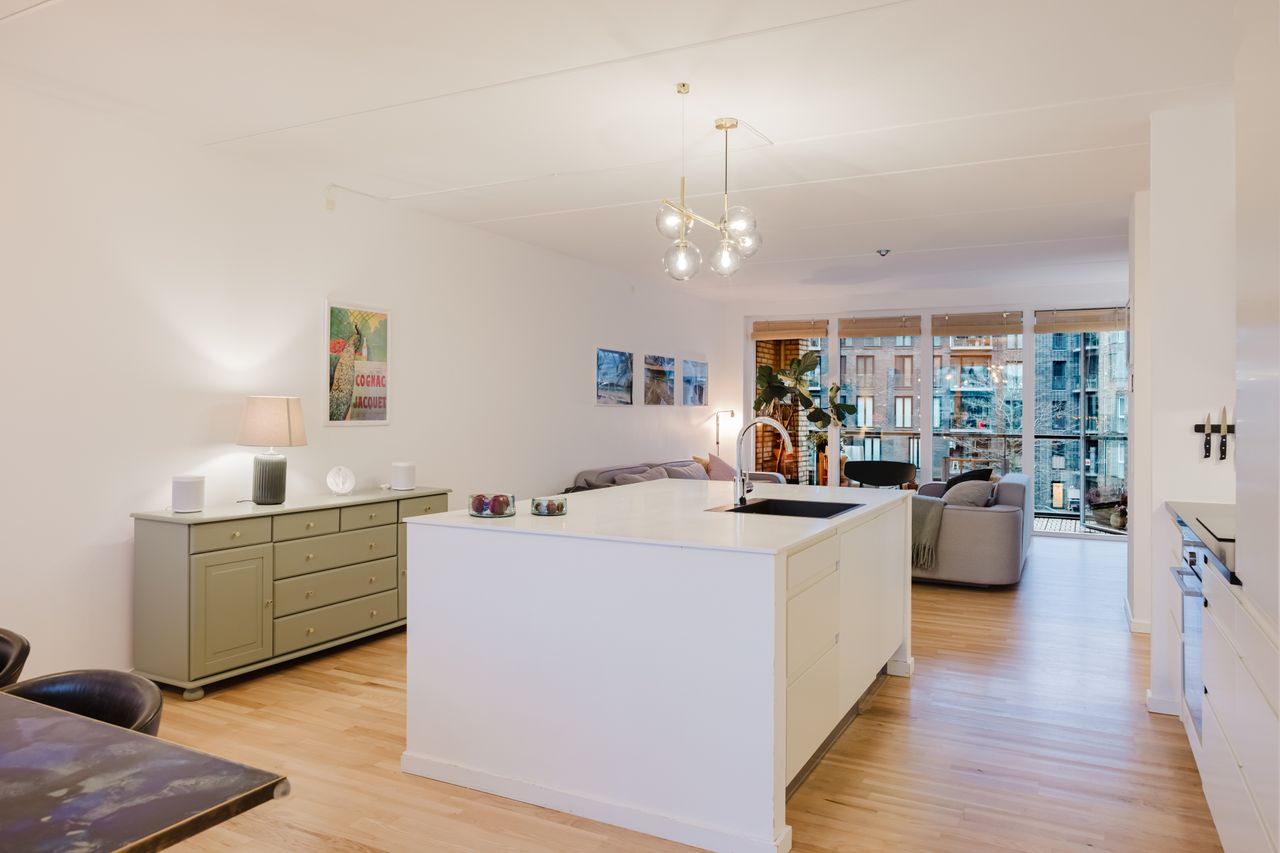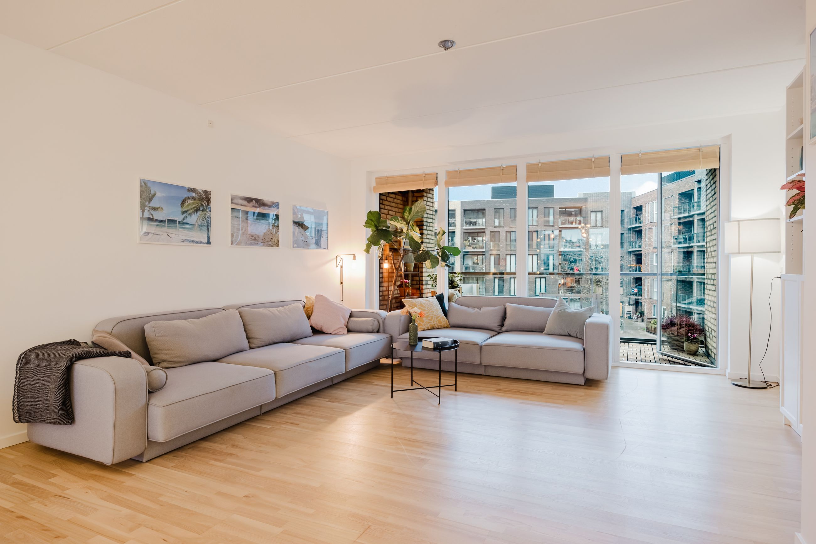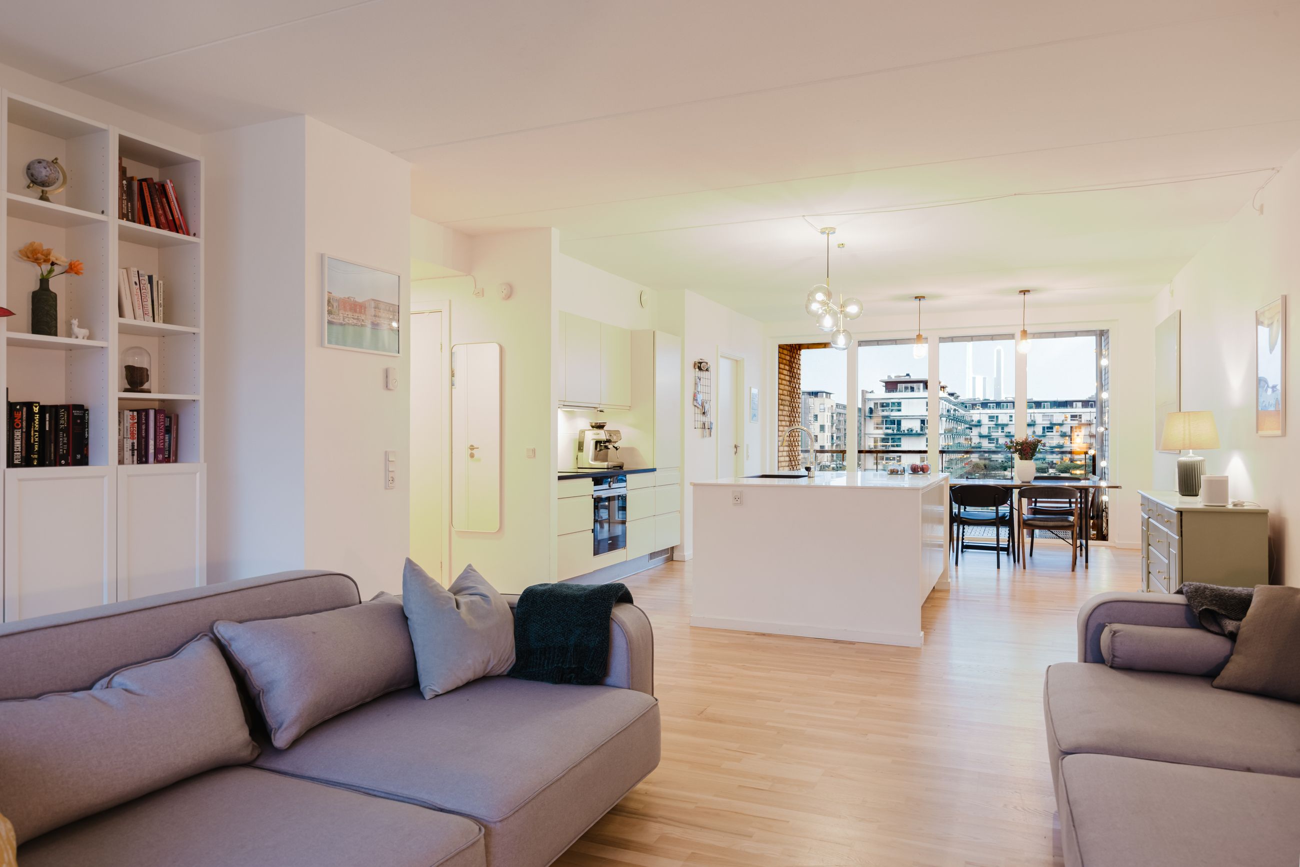 Velkommen til et lyst og velindrettet hjem på Dexter Gordons Vej, hvor vandet og udsigten bliver en naturlig del af hverdagen. Lejligheden ligger højt og frit med store vinduespartier mod kanalerne, og den gennemgående planløsning giver et behageligt flow fra entréen til opholdszonen. Allerede ved indgangen fornemmer du ro og rummelighed, her er garderobeplads, god opbevaring og et fint overblik til boligens rum.