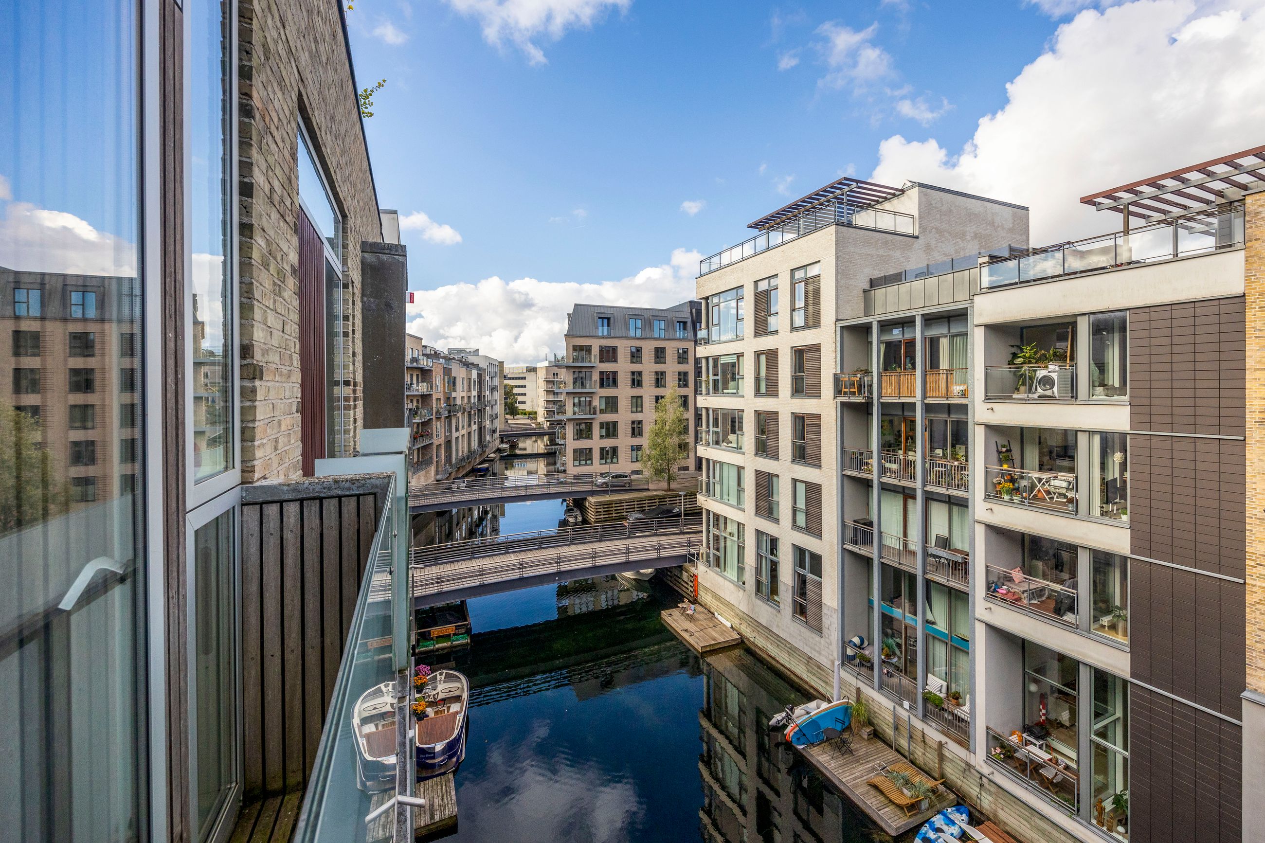 Lys lejlighed på Sluseholmen med fire altaner, kanalkig og stor skydedør til hovedaltanen