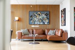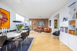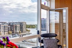 Stuen har et imponerende lysindfald fra de store vinduespartier, som samtidig giver en enestående udsigt over havnen og det omkringliggende bymiljø. Indretningen med trægulve og moderne vægbeklædning skaber en varm og rolig atmosfære.
