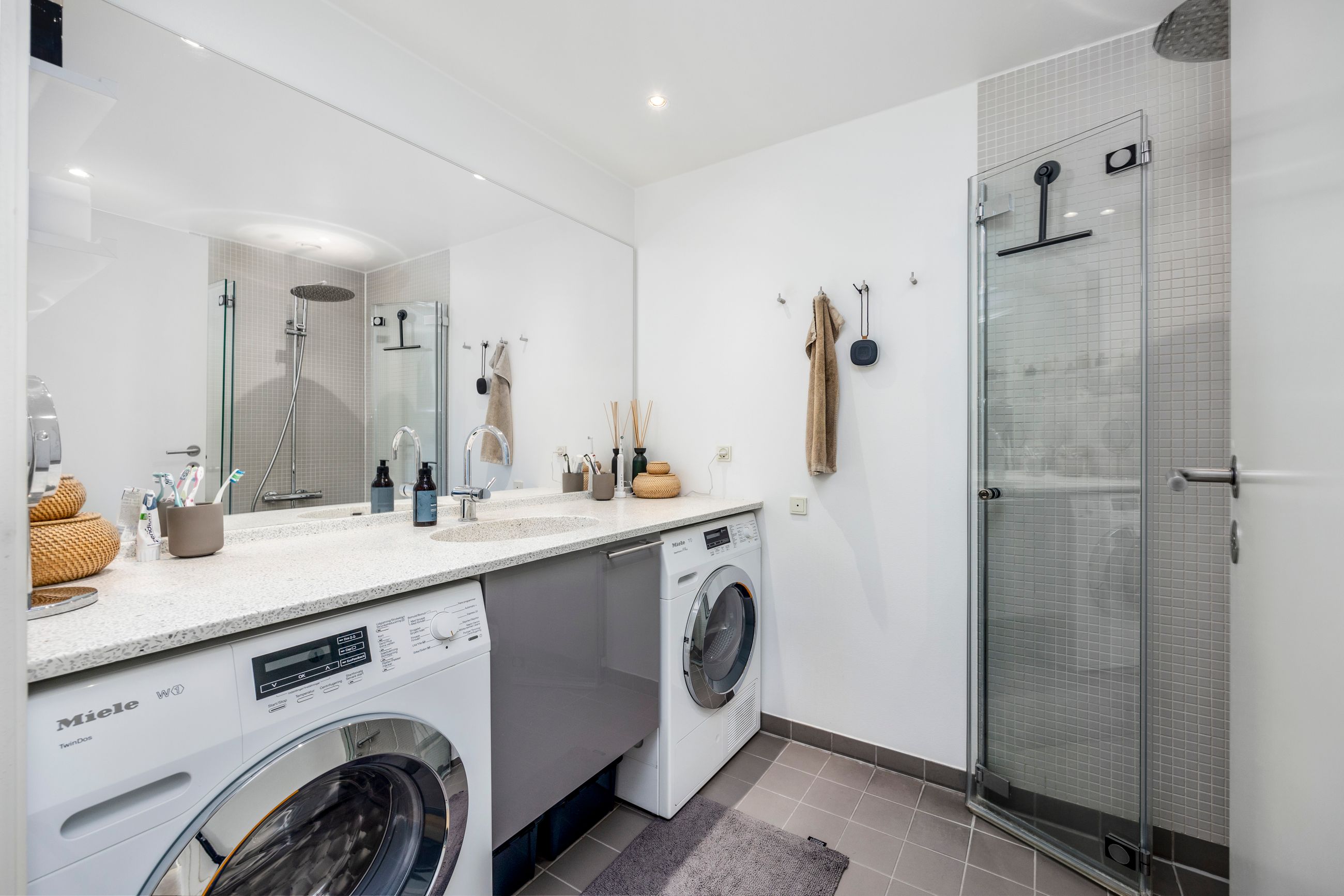 Soveværelset er lyst og praktisk indrettet med plads til både dobbeltseng og opbevaring. Også herfra er der udsigt til vandet. Badeværelset fremstår stilrent med separat bruseniche, vaskefaciliteter og funktionelle løsninger.