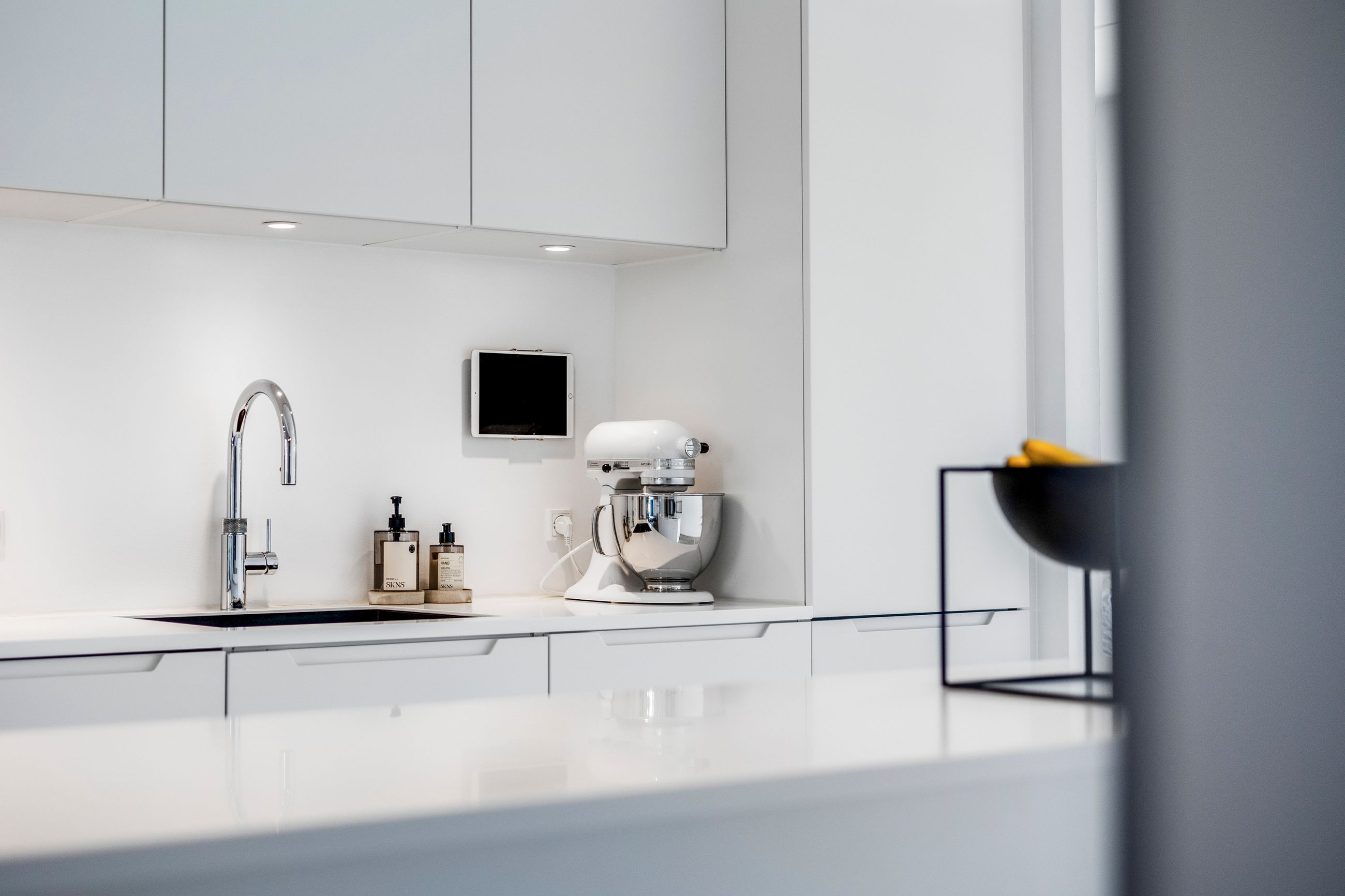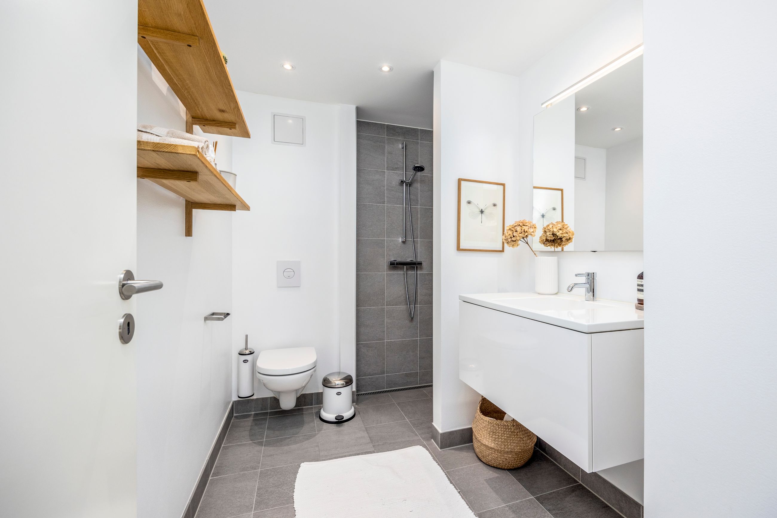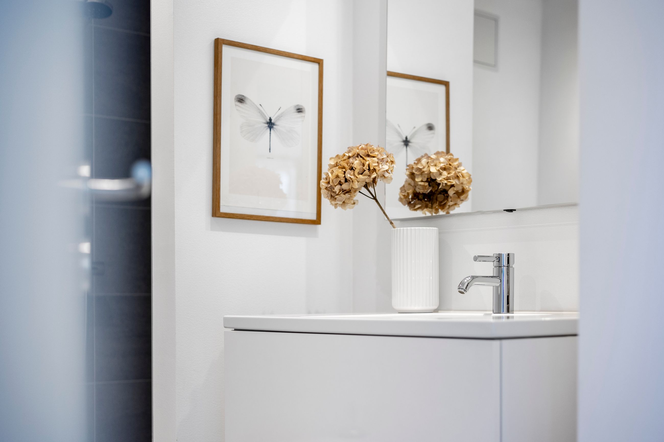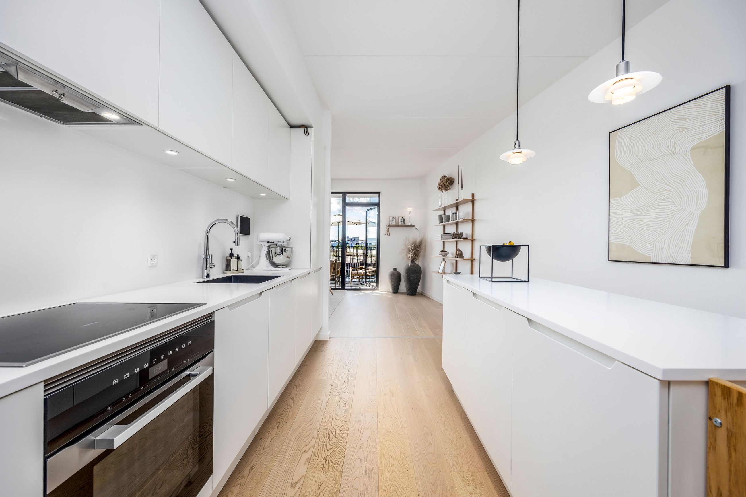 Planløsningen er gennemtænkt fra første skridt i entréen. Hjertet af hjemmet er den store, åbne stue med direkte udgang til altan mod vandet et naturligt samlingspunkt med god plads til både spisebord, sofaafdeling og gæster. Køkkenet ligger i forlængelse af rummet med rene linjer og masser af bordplads, så madlavning og samvær går hånd i hånd.