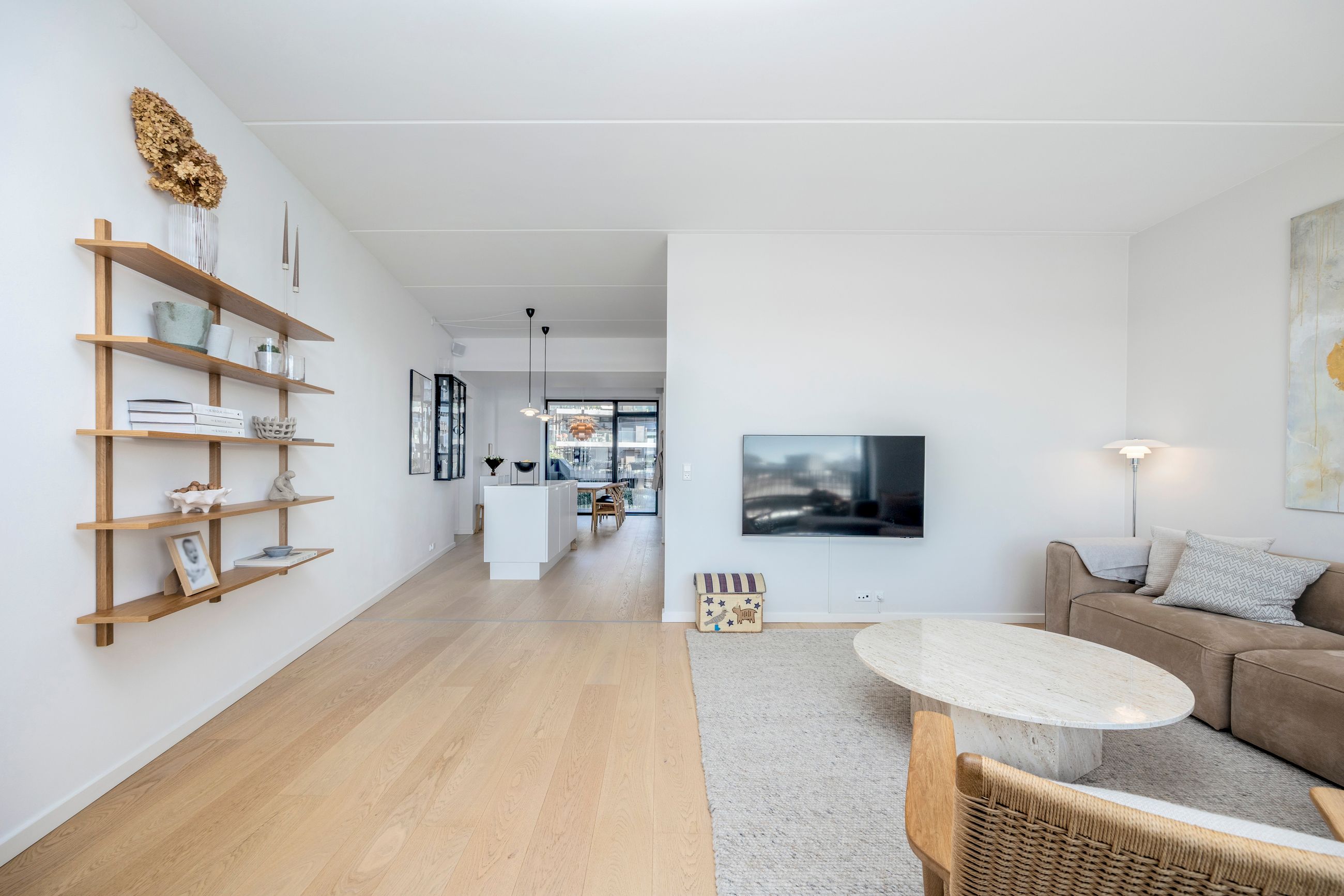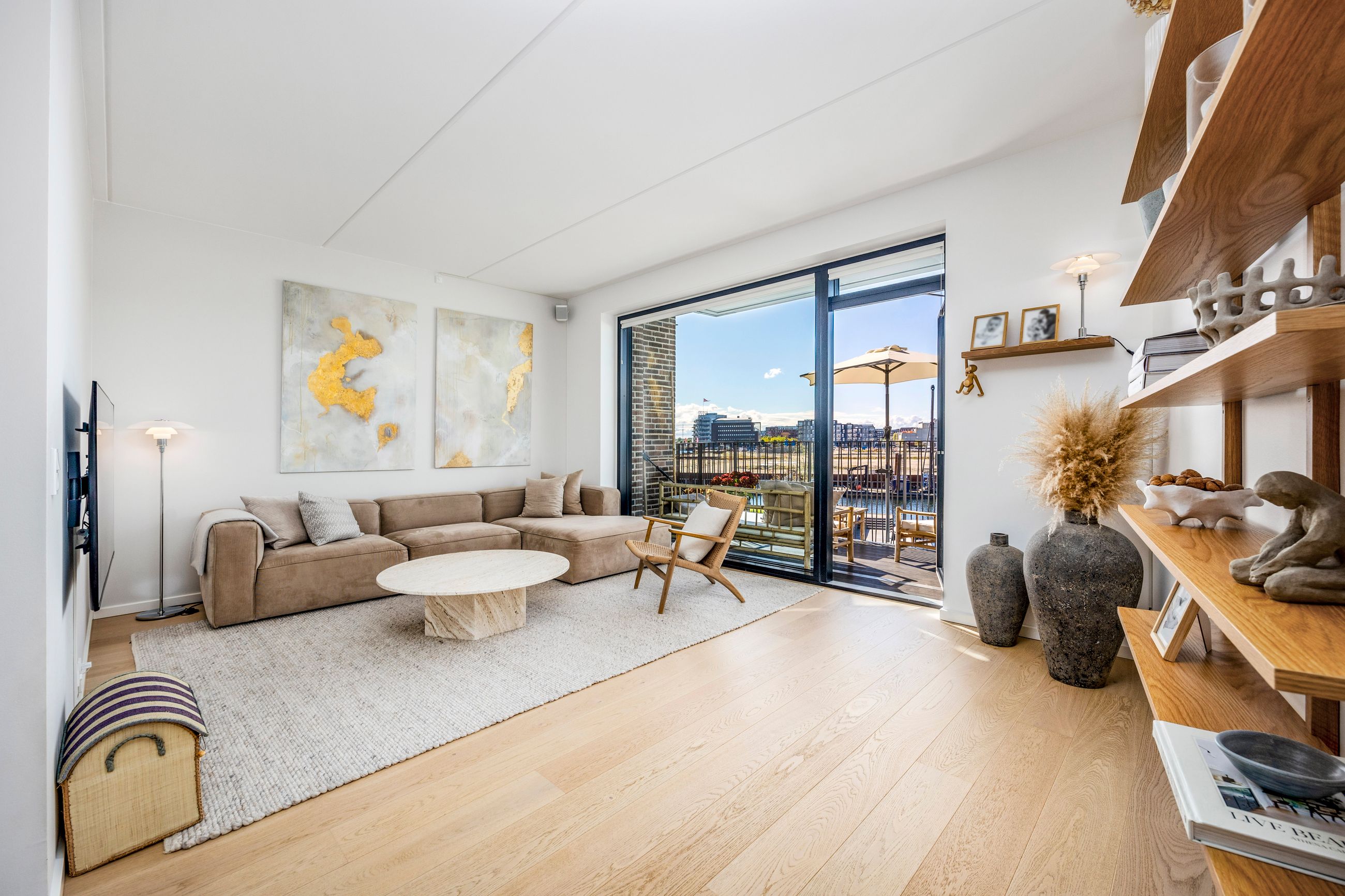 Velkommen til Christian Langes Plads 5, 1. mf. En lys og indbydende udsigtslejlighed, hvor vandet er din nærmeste nabo, og hverdagen får ekstra luft på to solrige altaner. Her får du moderne komfort, plads til både familie og hjemmearbejde og en adresse midt i Engholmenes levende kanalkvarter.