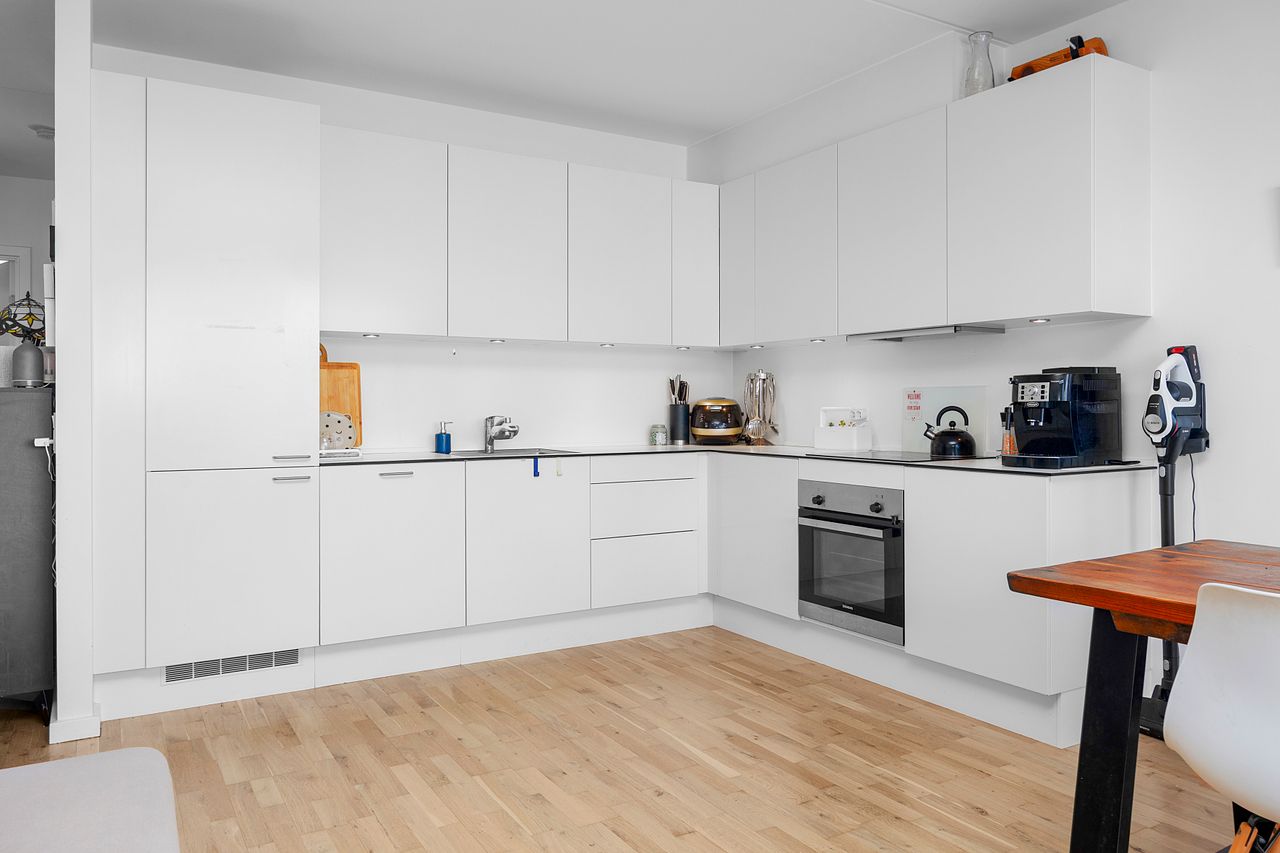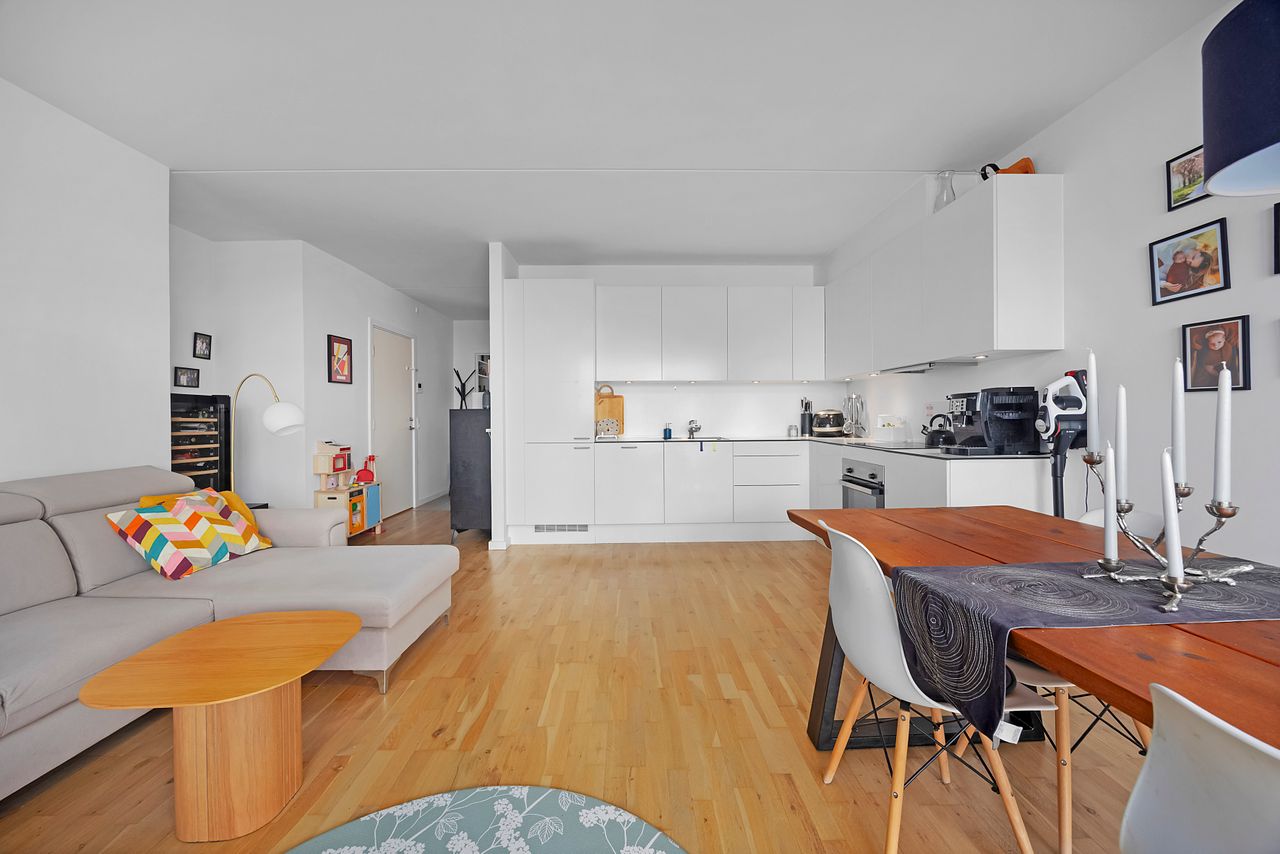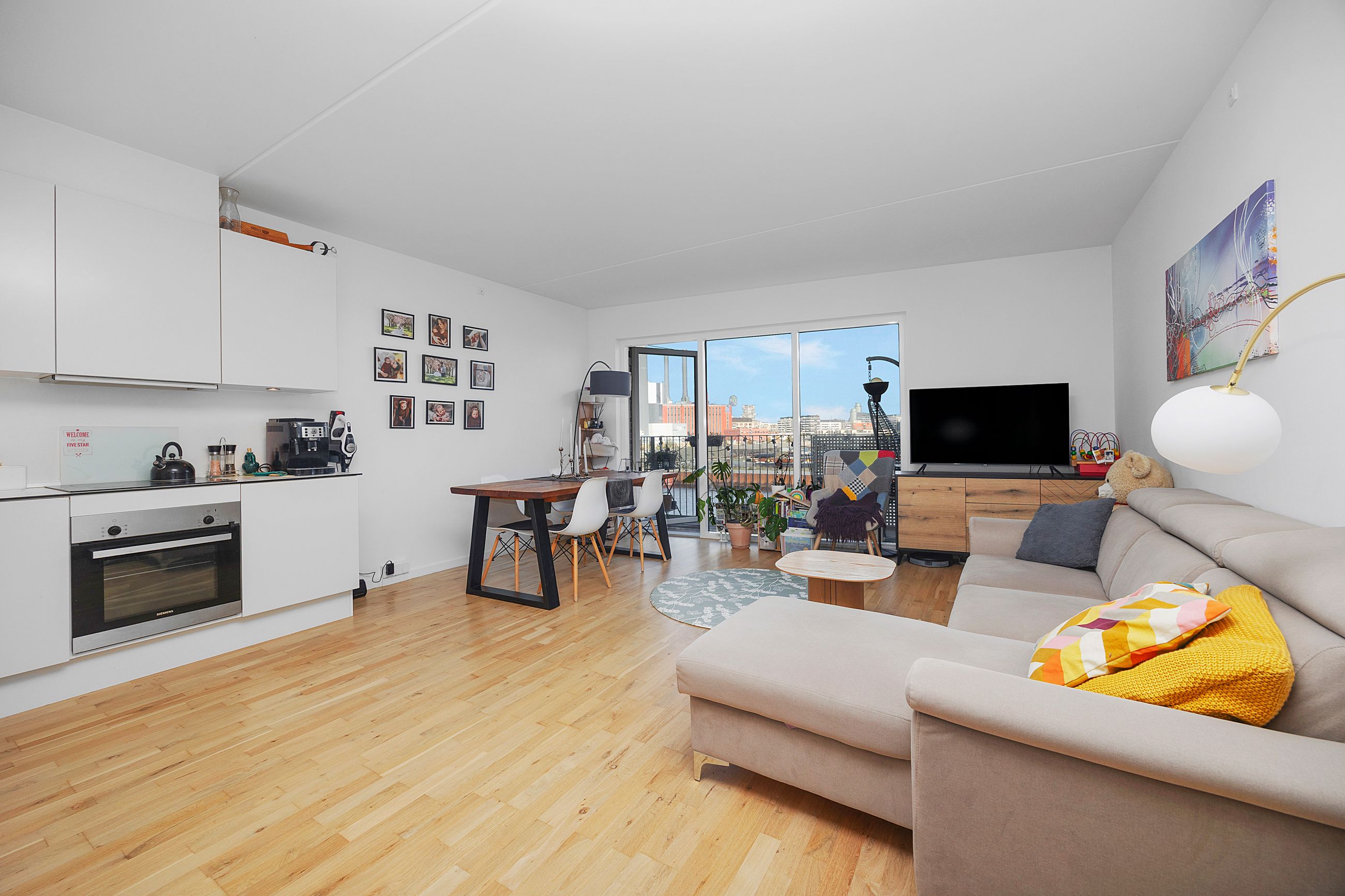 Lejlighedens naturlige samlingspunkt er det åbne køkkenalrum som er integreret med opholdsstuen. Det stilrene køkken har god skabsplads og alt i moderne hårde hvidevarer. Den åbne forbindelse til stuen giver et lyst og imødekommende opholdsrum. Her er der rigelig plads til både spisebord og sofaarrangement mens der fra stuen er udgang til altanen hvor udsigten over havnen kan nydes i fulde drag. Altanen bliver hurtigt en forlængelse af boligen i sommerhalvåret. Herfra kan du nyde morgensolen og det rolige liv langs vandet mens du mærker den maritime stemning som kendetegner Teglholmen.