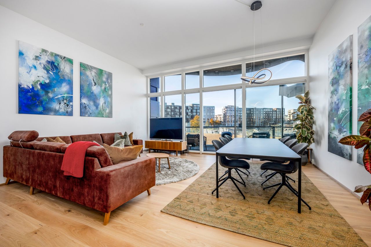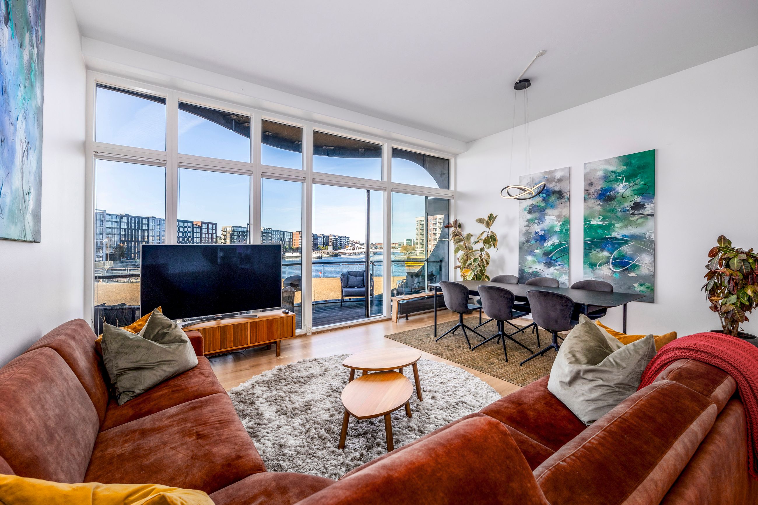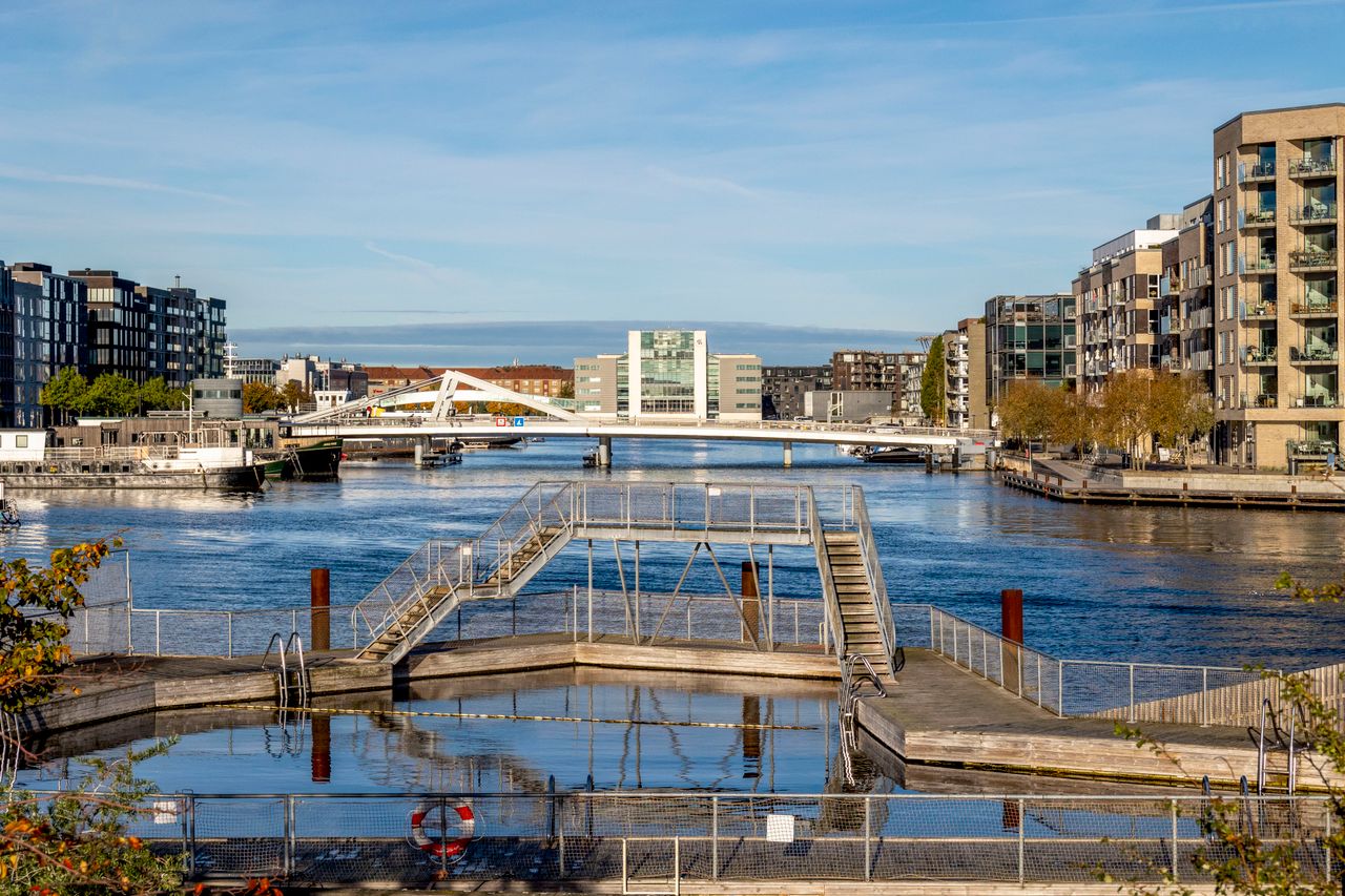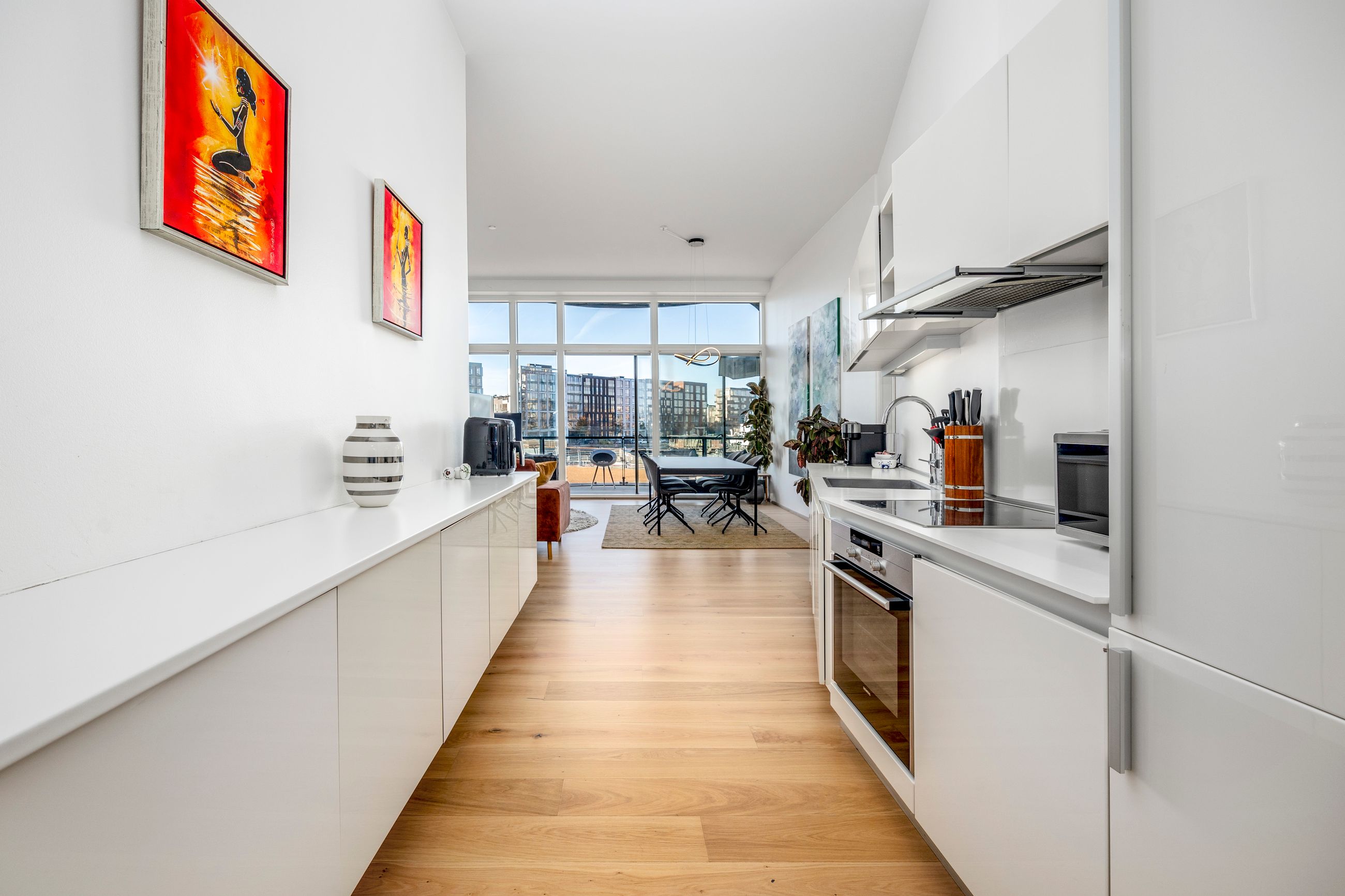 Lejligheden er en sjældent udbudt høj stuelejlighed på 106 m2, hævet over terræn og uden direkte kontakt til gadeplan – man har derfor ikke den almindelige københavneroplevelse af at bo i stueplan. Tværtimod giver niveauet den optimale højde til at fange den direkte vandudsigt fra stort set alle positioner i boligen. Boligen har altaner på begge sider og et imponerende kig langs kanalen. Indretningen er moderne og velfungerende med to gode soveværelser, to anvendelige hemse, et velproportioneret badeværelse samt et stort opholdsrum, hvor entré, køkken og stue flyder naturligt sammen. Køkkenet fremstår stilrent med lækre materialer, mens de store vinduespartier fra gulv til loft trækker udsigt og dagslys helt ind i boligen via den ca. 3,5 meter høje loftshøjde og lader de smukke trægulve komme til deres ret. Når behovet er ude, fortsætter udelivet på den store fælles tagterrasse, hvor København, Amager Fælled og Teglværkshavnen folder sig ud i horisonten.