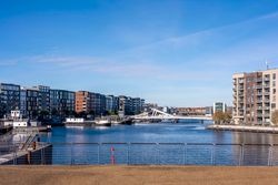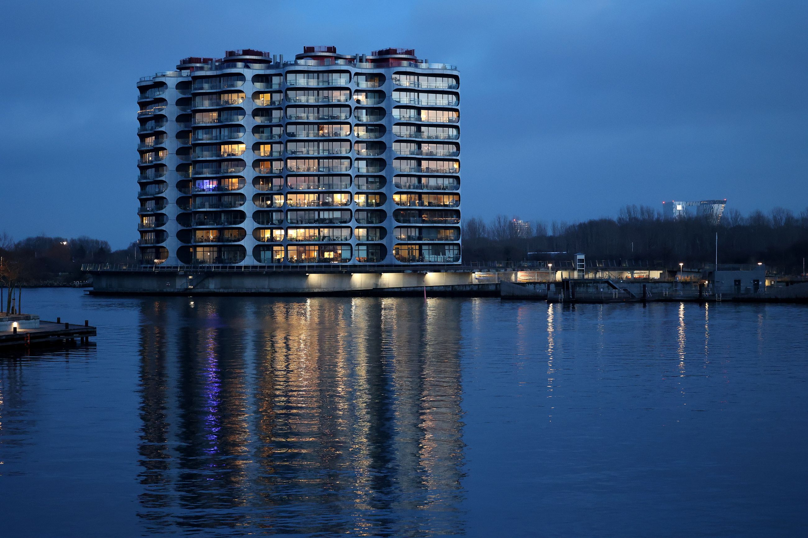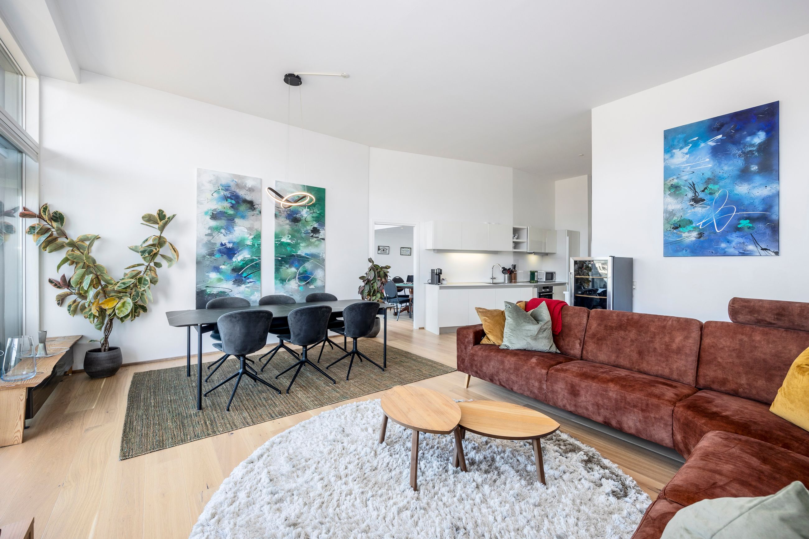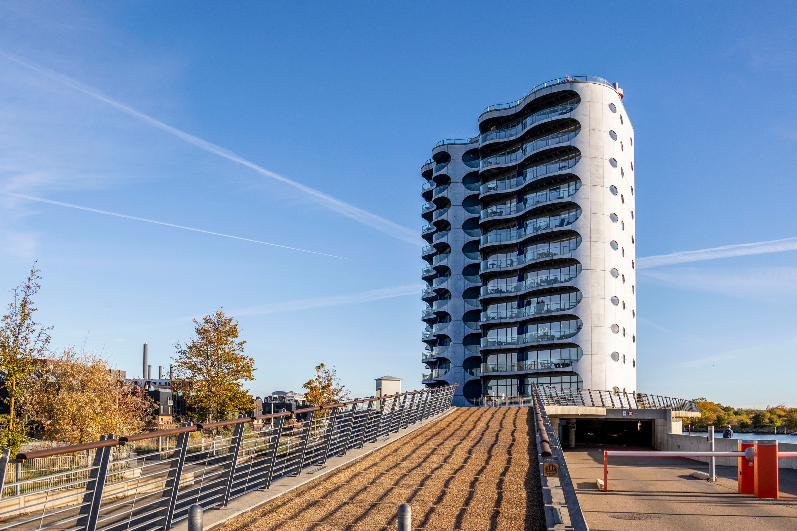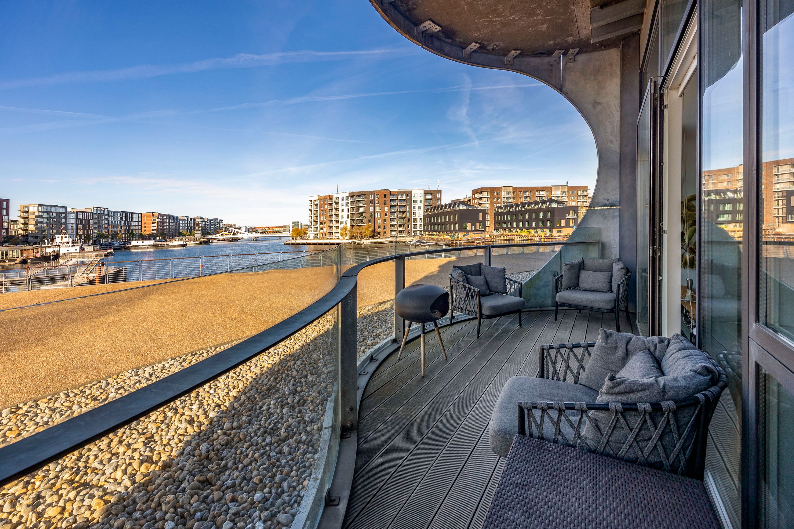 Lejligheden er en sjældent udbudt høj stuelejlighed på 106 m2, hævet over terræn og uden direkte kontakt til gadeplan – man har derfor ikke den almindelige københavneroplevelse af at bo i stueplan. Tværtimod giver niveauet den optimale højde til at fange den direkte vandudsigt fra stort set alle positioner i boligen. Boligen har altaner på begge sider og et imponerende kig langs kanalen. Indretningen er moderne og velfungerende med to gode soveværelser, to anvendelige hemse, et velproportioneret badeværelse samt et stort opholdsrum, hvor entré, køkken og stue flyder naturligt sammen. Køkkenet fremstår stilrent med lækre materialer, mens de store vinduespartier fra gulv til loft trækker udsigt og dagslys helt ind i boligen via den ca. 3,5 meter høje loftshøjde og lader de smukke trægulve komme til deres ret. Når behovet er ude, fortsætter udelivet på den store fælles tagterrasse, hvor København, Amager Fælled og Teglværkshavnen folder sig ud i horisonten.