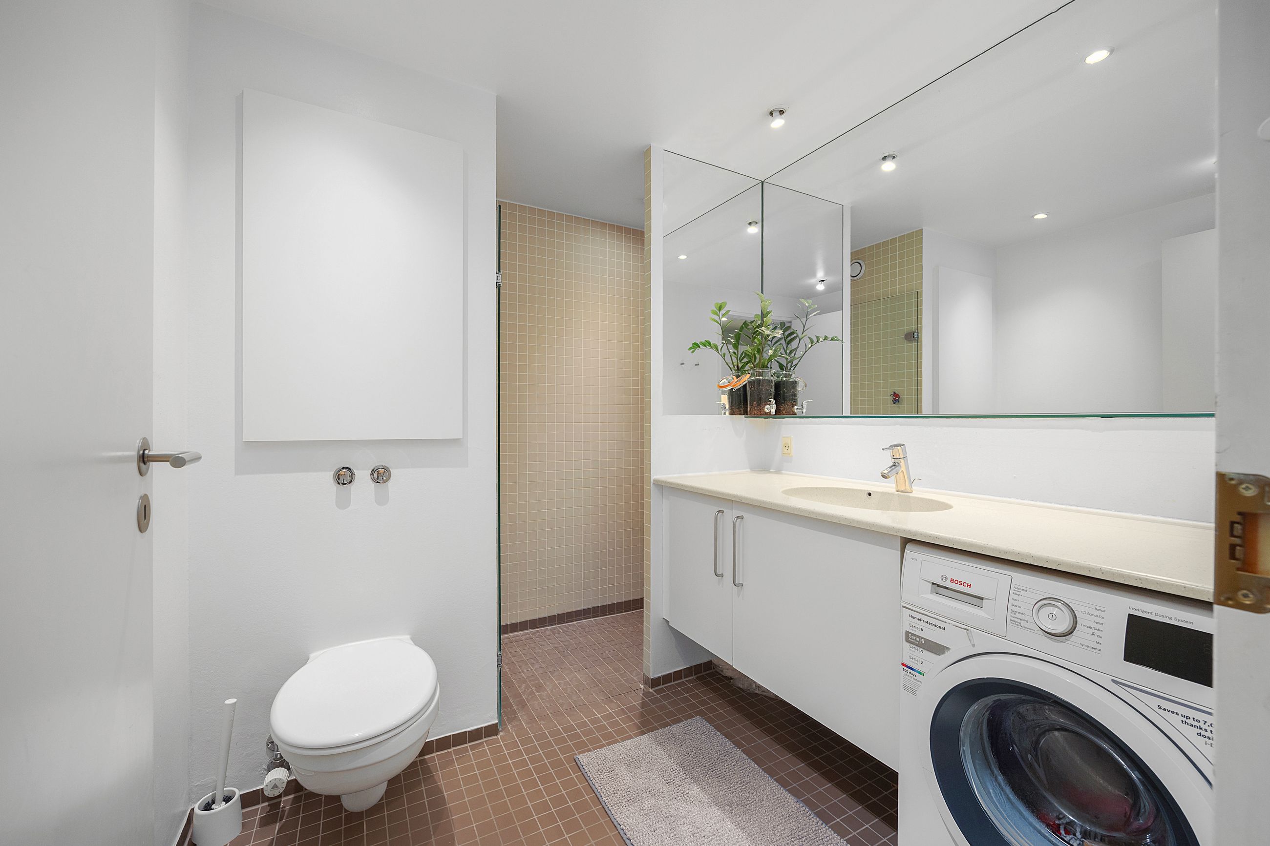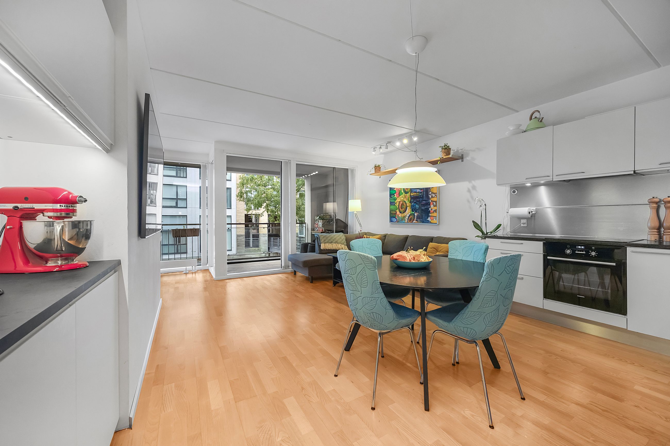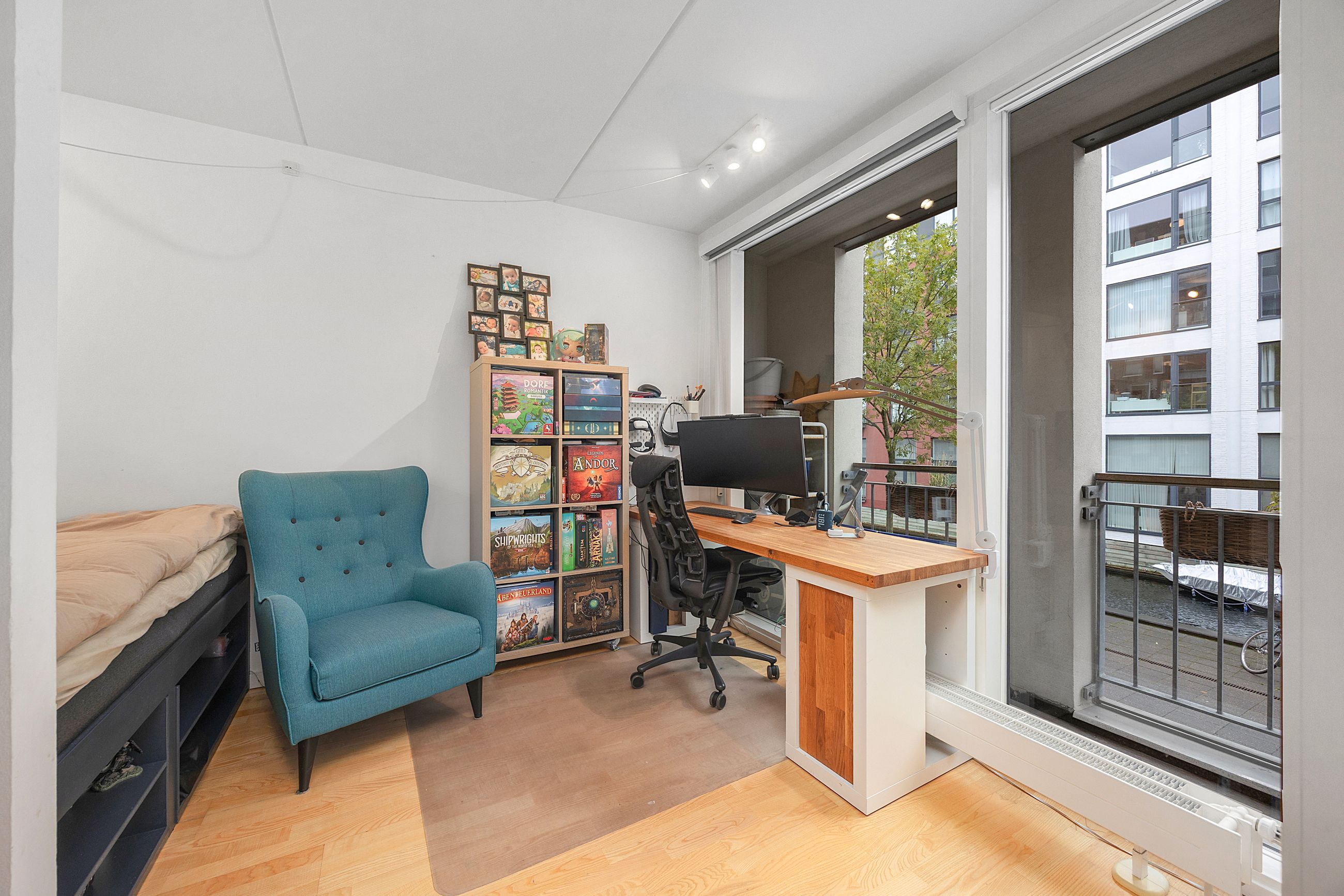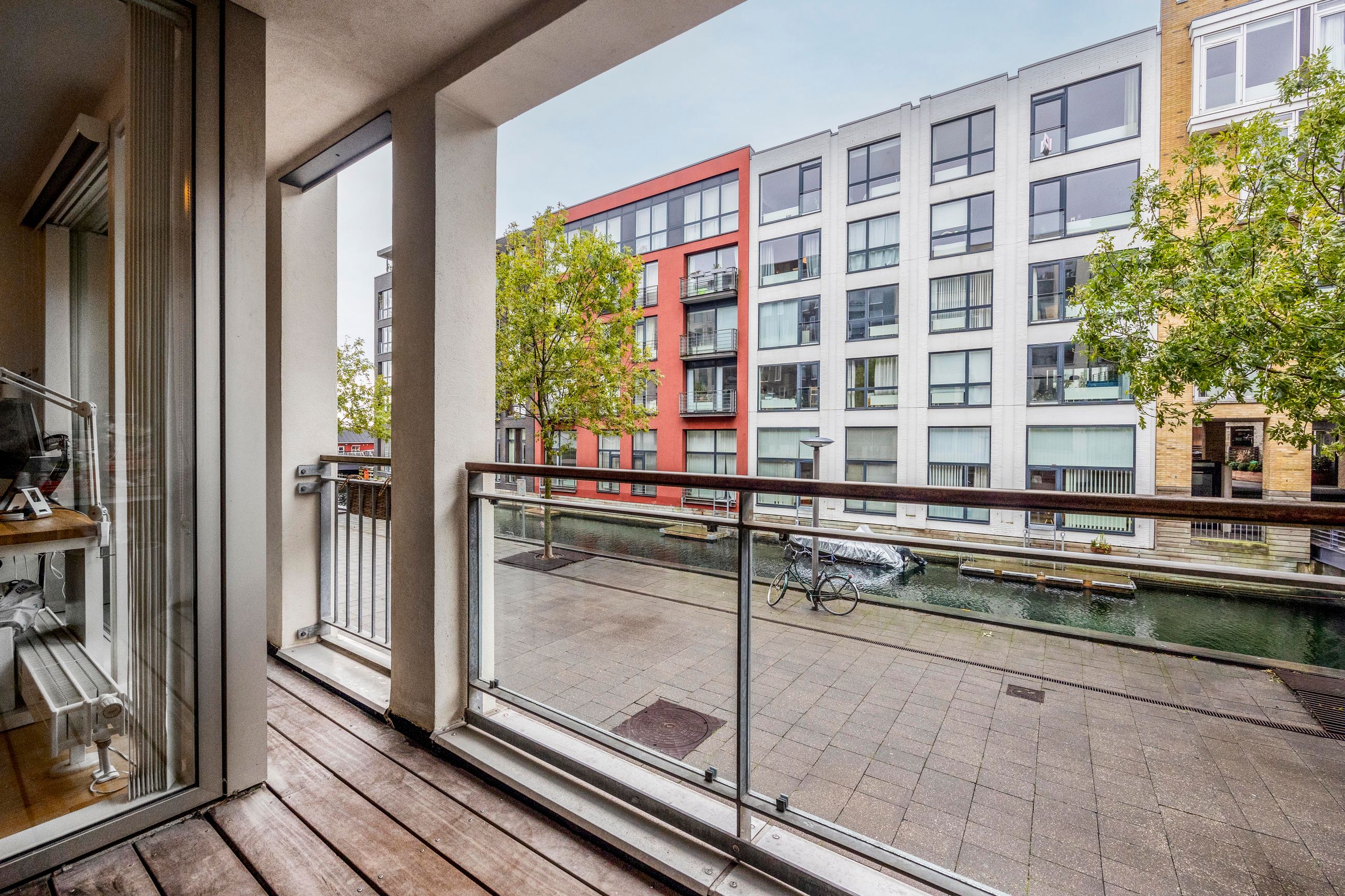 Køkkenet står moderne og funktionelt med lange bordløb og rigelig opbevaring, og der er god plads til spisebordet i forlængelse af stuen. Soveafdelingen rummer to indretningsvenlige værelser, begge med store vinduer. Det ene åbner mod grønne beplantninger og det hyggelige gårdmiljø, det andet ud mod kanalerne og det behagelige vandmiljø. Badeværelset er rummeligt med separat bruseniche og en god vaskesøjle.