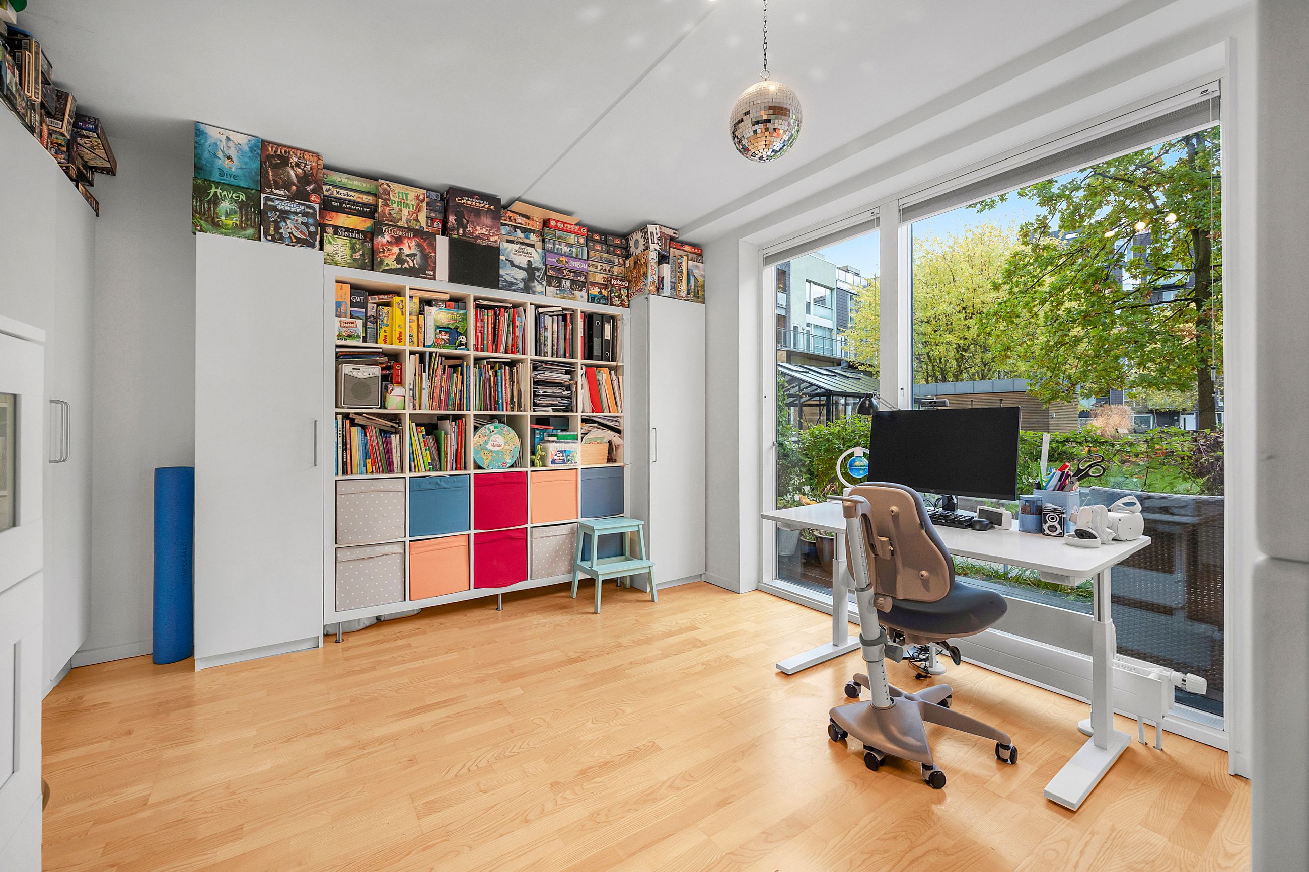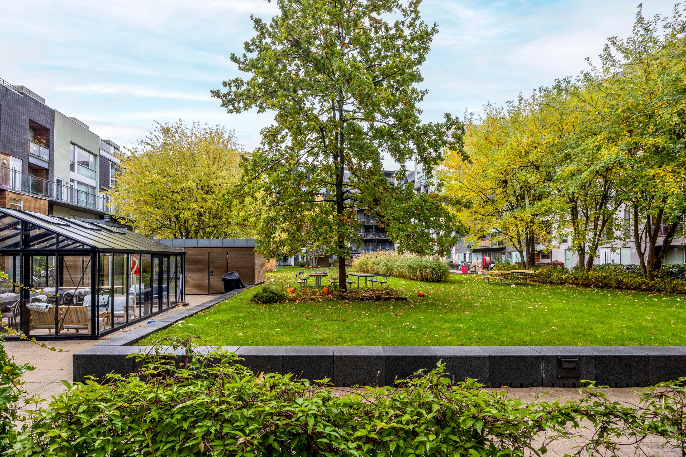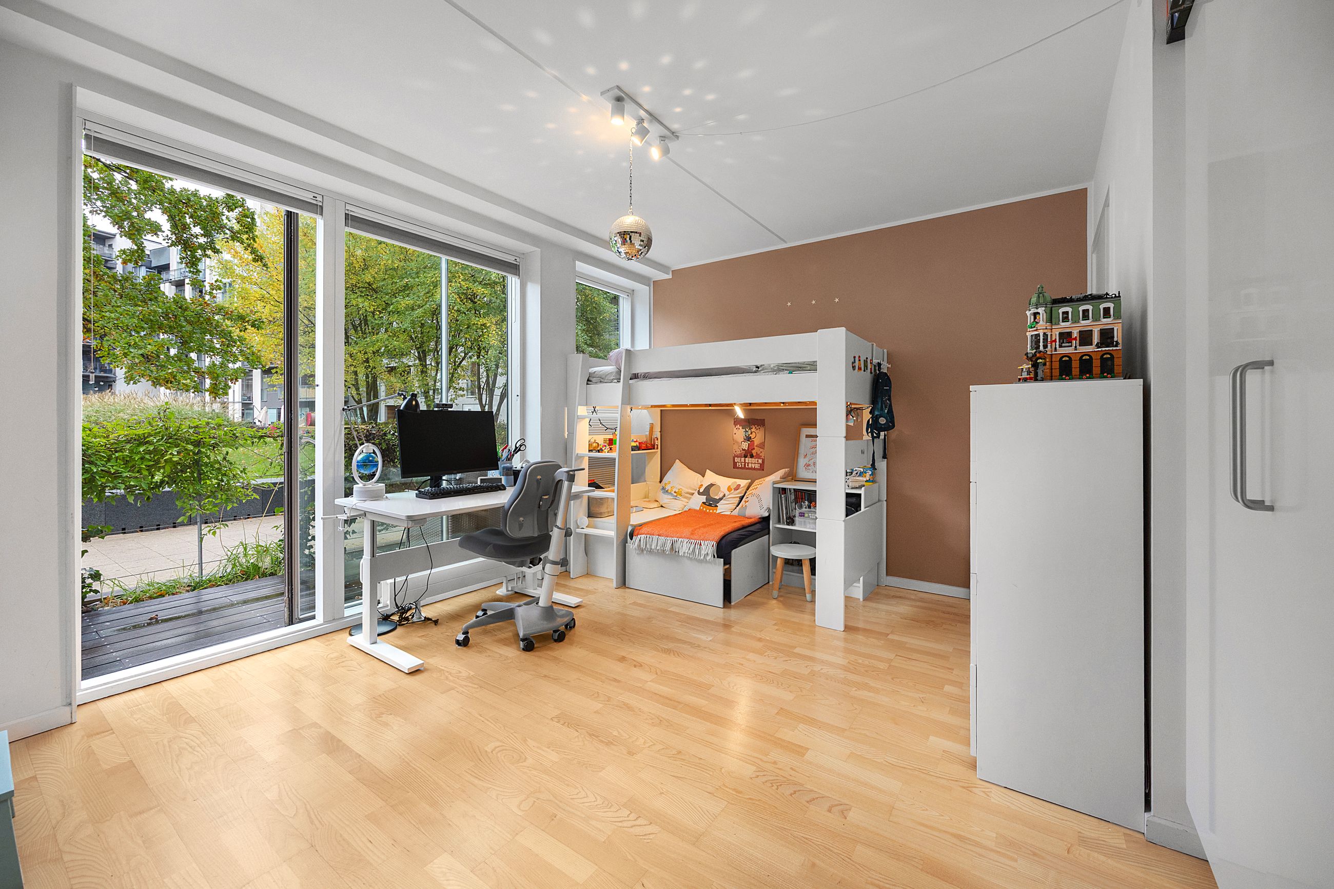 Køkkenet står moderne og funktionelt med lange bordløb og rigelig opbevaring, og der er god plads til spisebordet i forlængelse af stuen. Soveafdelingen rummer to indretningsvenlige værelser, begge med store vinduer. Det ene åbner mod grønne beplantninger og det hyggelige gårdmiljø, det andet ud mod kanalerne og det behagelige vandmiljø. Badeværelset er rummeligt med separat bruseniche og en god vaskesøjle.