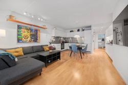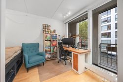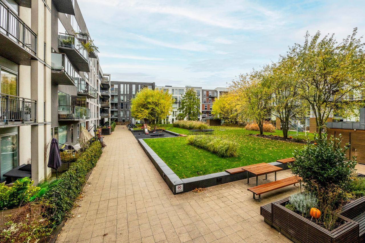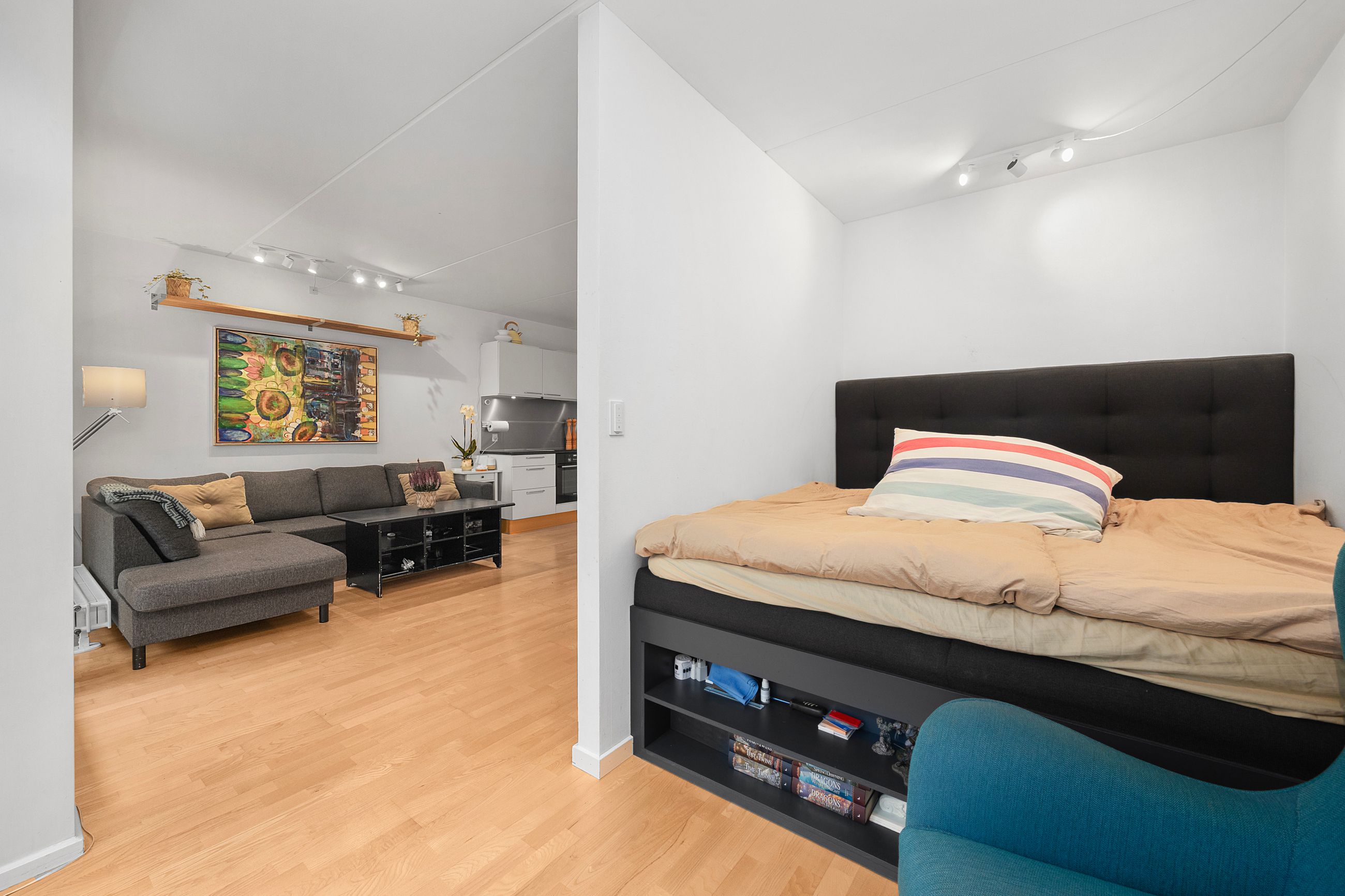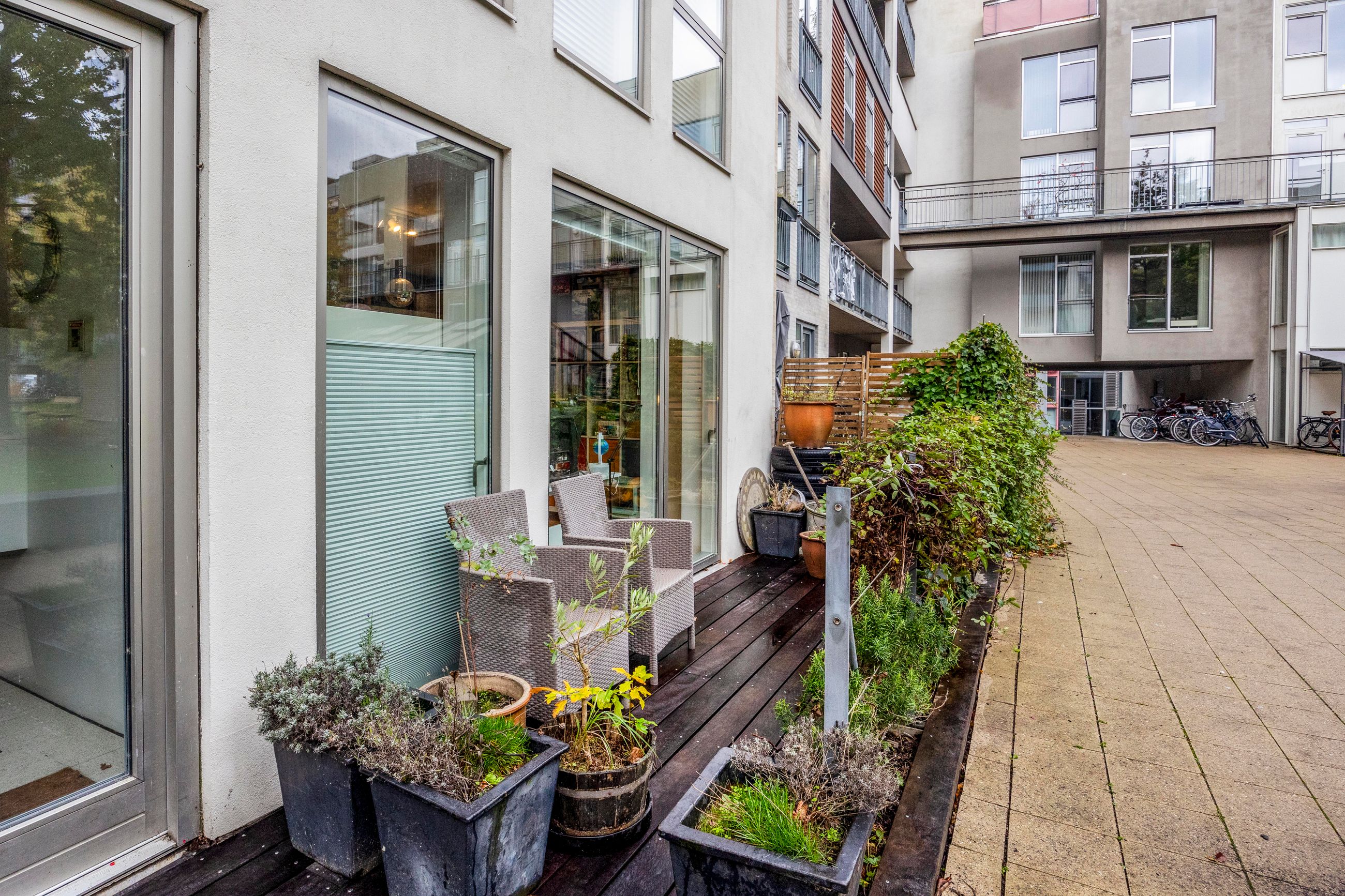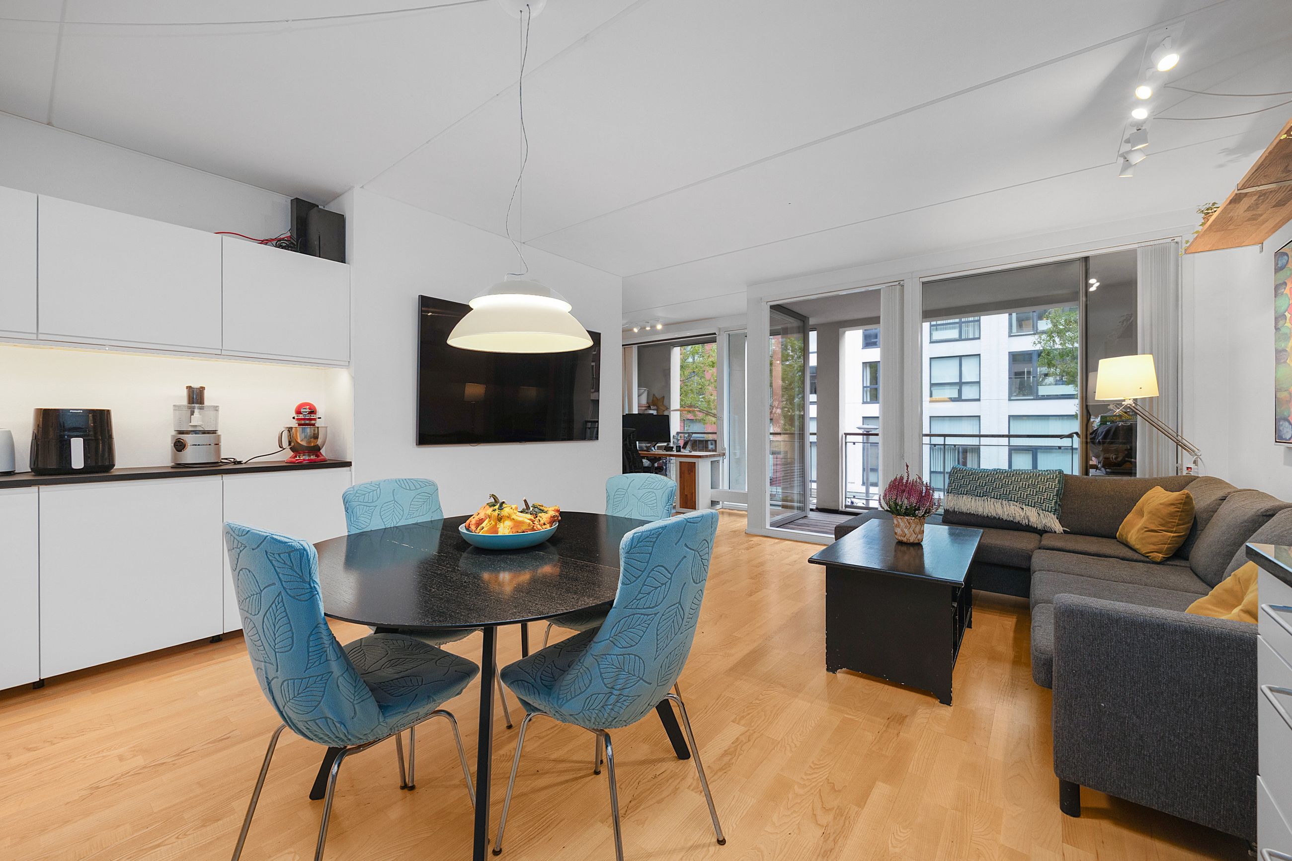 Køkkenet står moderne og funktionelt med lange bordløb og rigelig opbevaring, og der er god plads til spisebordet i forlængelse af stuen. Soveafdelingen rummer to indretningsvenlige værelser, begge med store vinduer. Det ene åbner mod grønne beplantninger og det hyggelige gårdmiljø, det andet ud mod kanalerne og det behagelige vandmiljø. Badeværelset er rummeligt med separat bruseniche og en god vaskesøjle.
