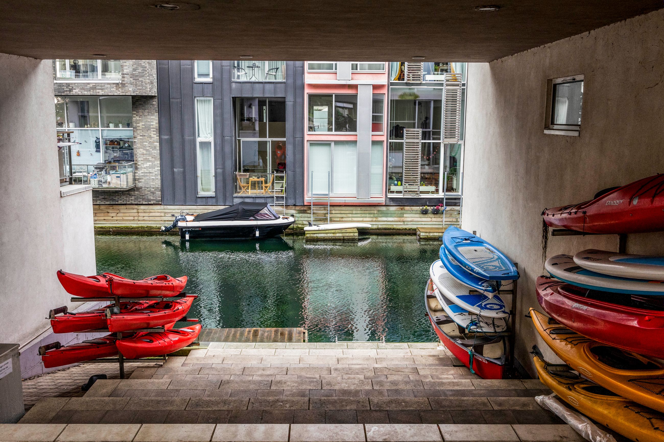 Nabolaget er Sluseholmen, når det er bedst, med promenader, kajak og paddleboard, badezoner og små opholdslommer langs kanalerne. I nærområdet finder du caféer, bager, vinbar og indkøb, og byen er tæt på. Cykelbroerne fører hurtigt til Bryggen og Vesterbro, havnebussen ligger få minutter fra hoveddøren, og metroen giver nem adgang til resten af København.
