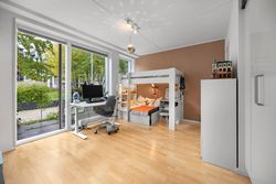 Boligen folder sig for alvor ud mod vandet. De brede vinduespartier trækker kanalen helt ind i stuen, og de store skydedøre fører ud til den overdækkede altan, som kan lukkes med foldedøre. Det forlænger udelivet markant, så du får et brugbart, halvt indendørs rum fra tidligt forår til sen efterår. Dertil kommer en solvendt terrasse ved det ene værelse, perfekt til morgenkaffe eller et stille øjeblik i læ, så du reelt får to private uderum lige uden for døren.