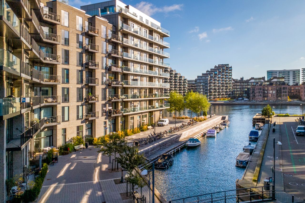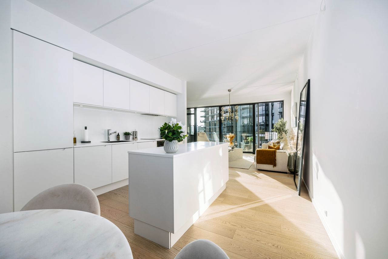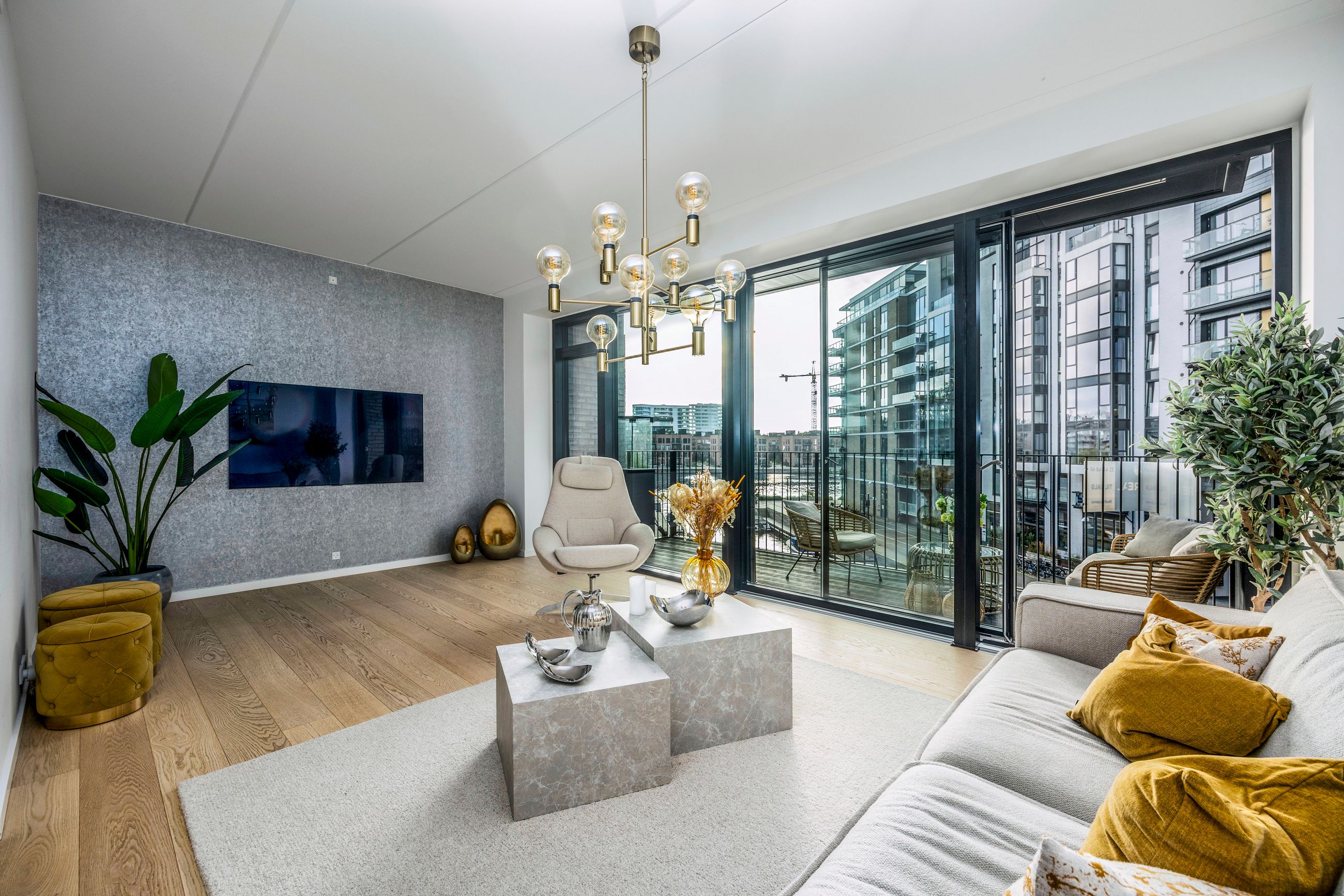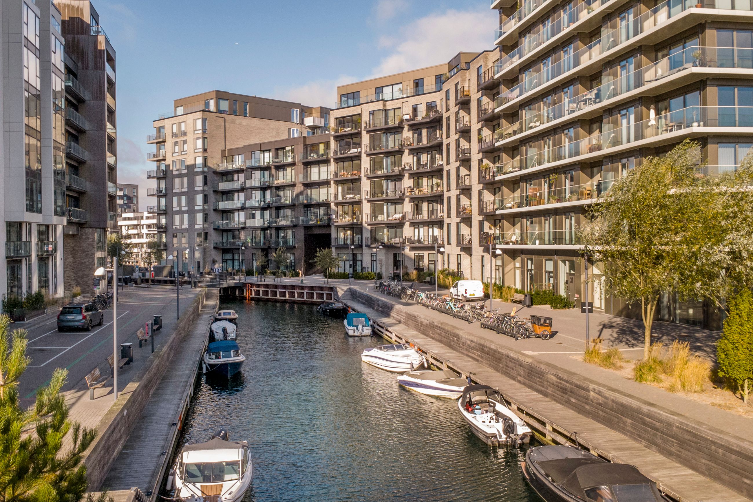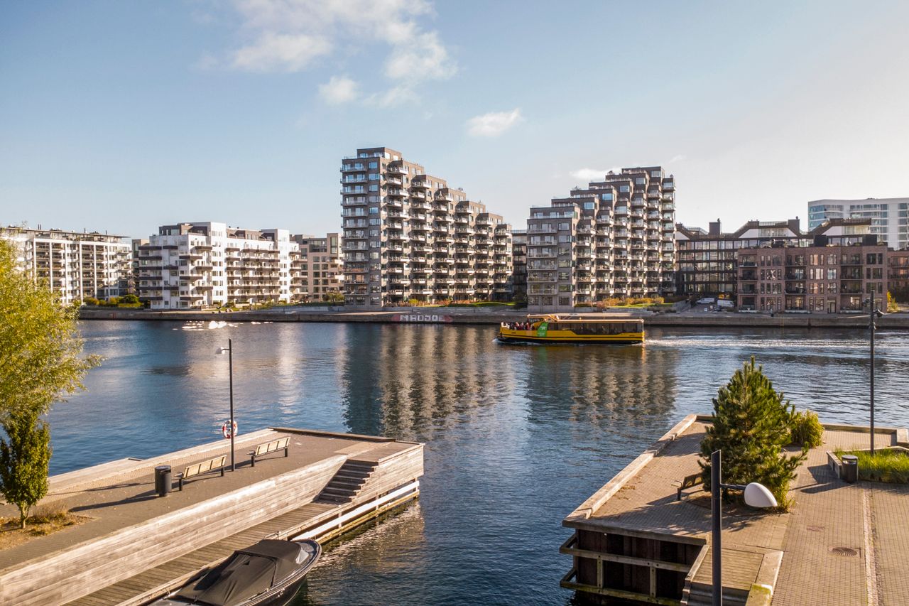 Velkommen til et lyst og indbydende byhjem på havnefronten, hvor udsigten får lov at fylde. Fra stuen har du et eksklusivt kig over vandet mod Bryggen, du følger livet på kanalerne med kajakker og paddleboards og får et dagligt lysindfald, der skaber ro og rum. Rummet opleves åbent og harmonisk, og de brede vinduespartier rammer himlen og vandet ind, så udsigten bliver en naturlig del af indretningen året rundt.