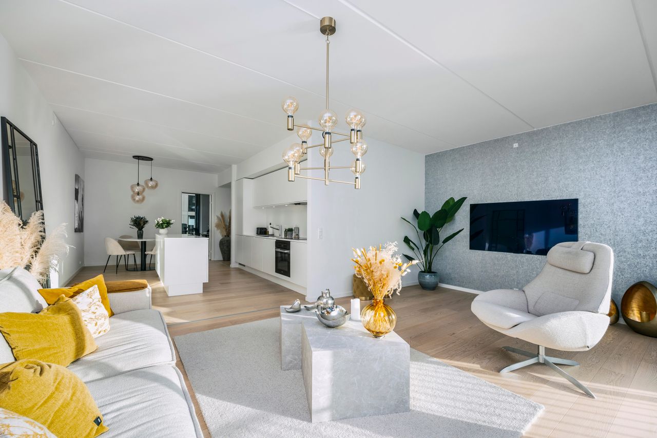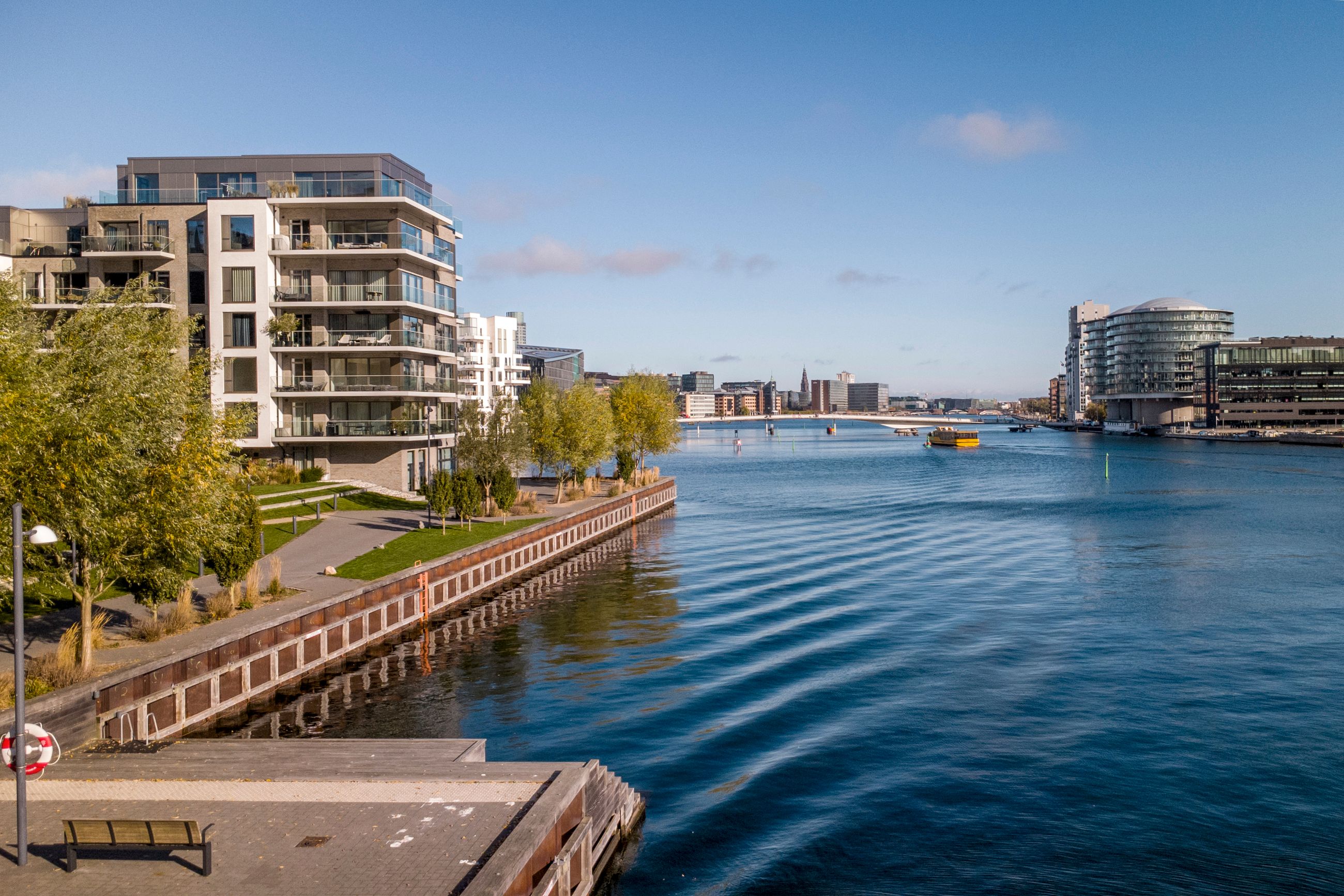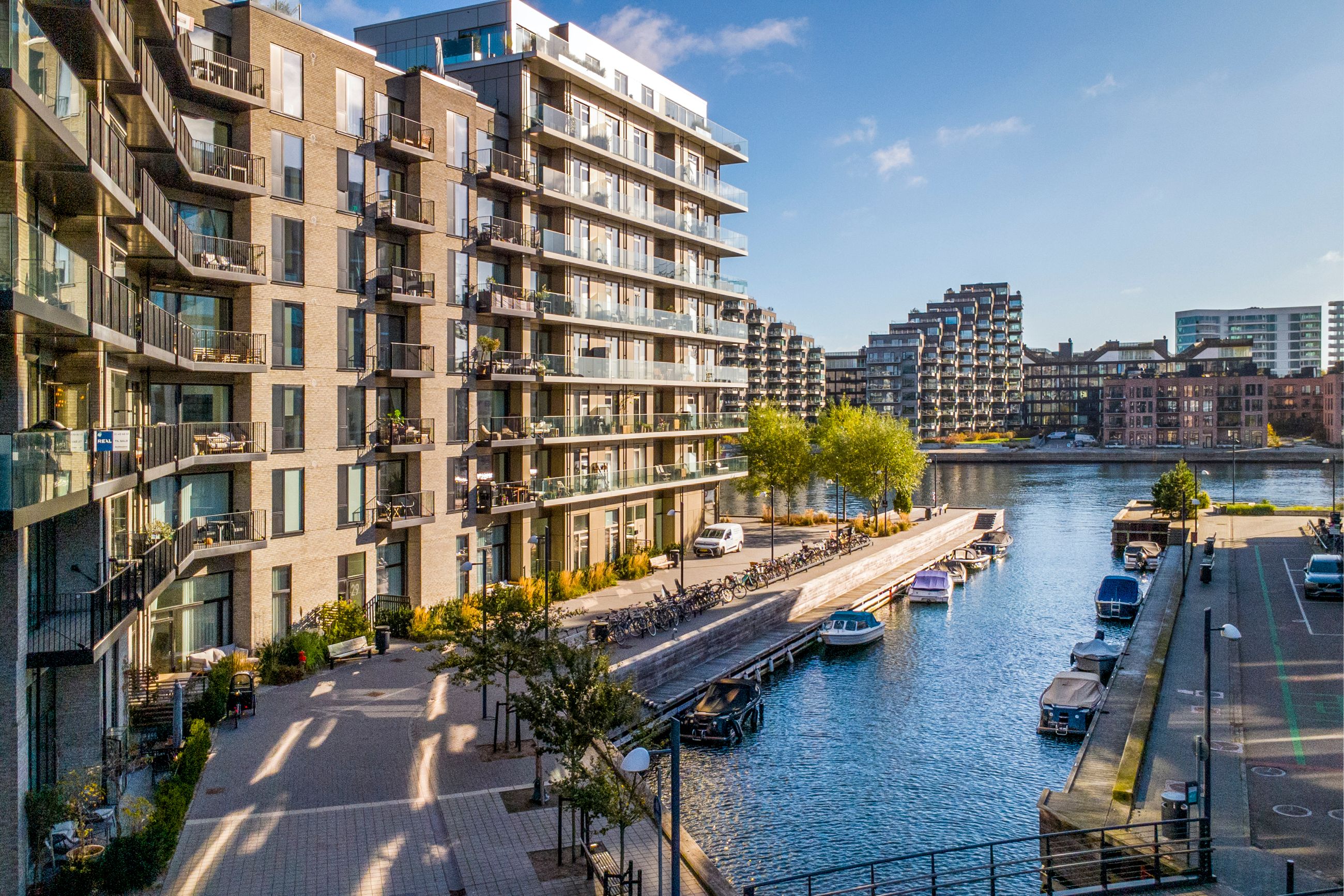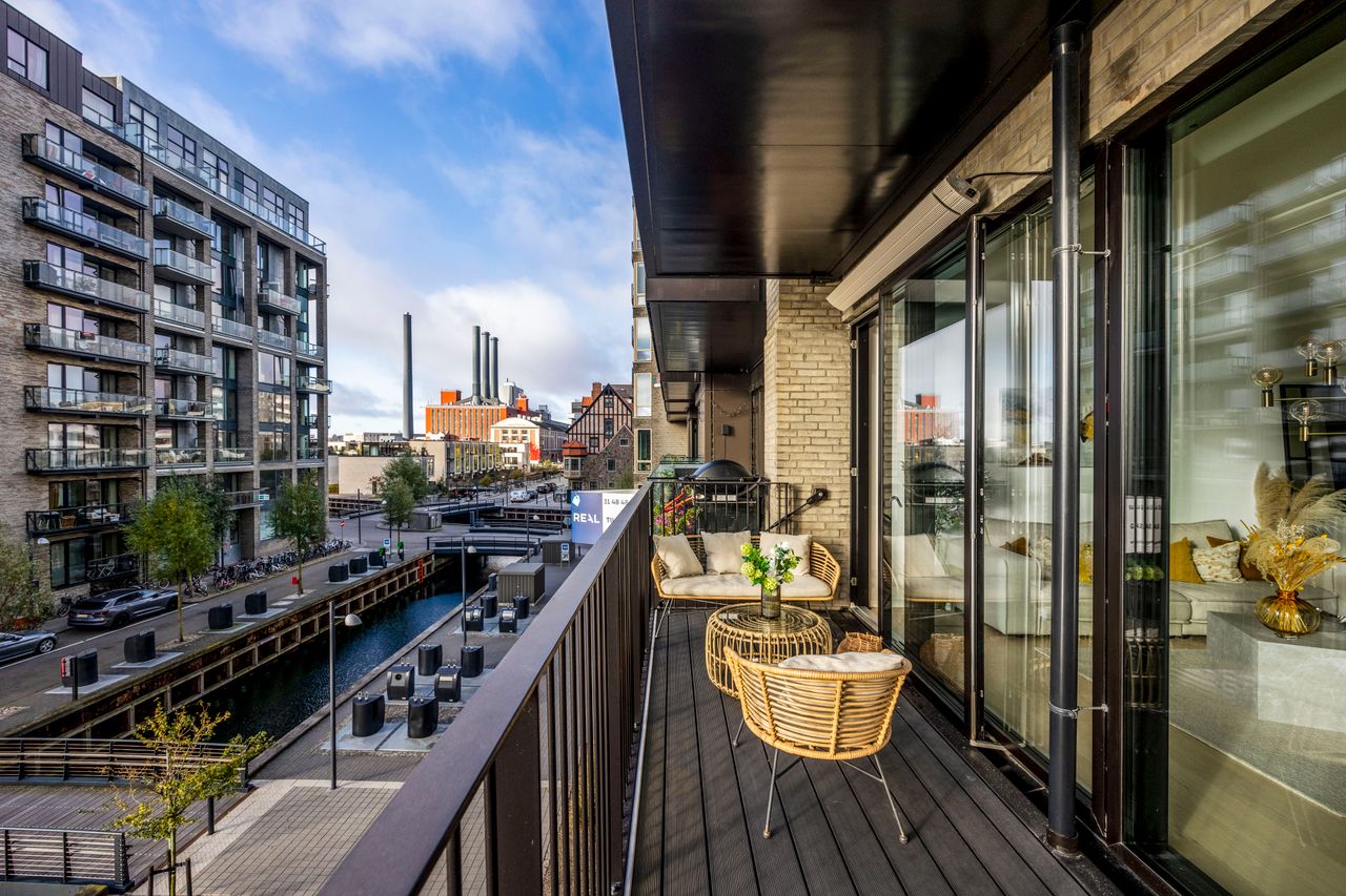 Velkommen til et lyst og indbydende byhjem på havnefronten, hvor udsigten får lov at fylde. Fra stuen har du et eksklusivt kig over vandet mod Bryggen, du følger livet på kanalerne med kajakker og paddleboards og får et dagligt lysindfald, der skaber ro og rum. Rummet opleves åbent og harmonisk, og de brede vinduespartier rammer himlen og vandet ind, så udsigten bliver en naturlig del af indretningen året rundt.