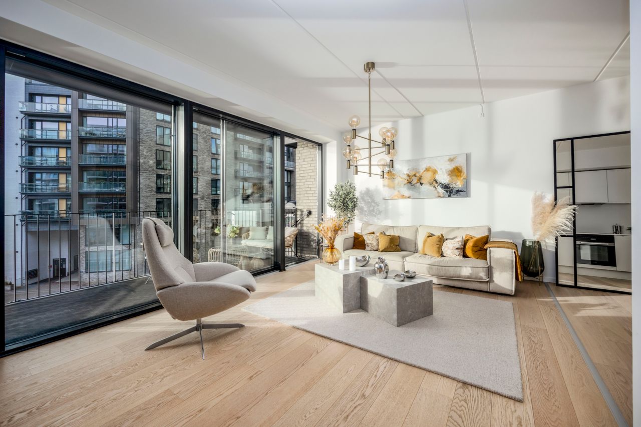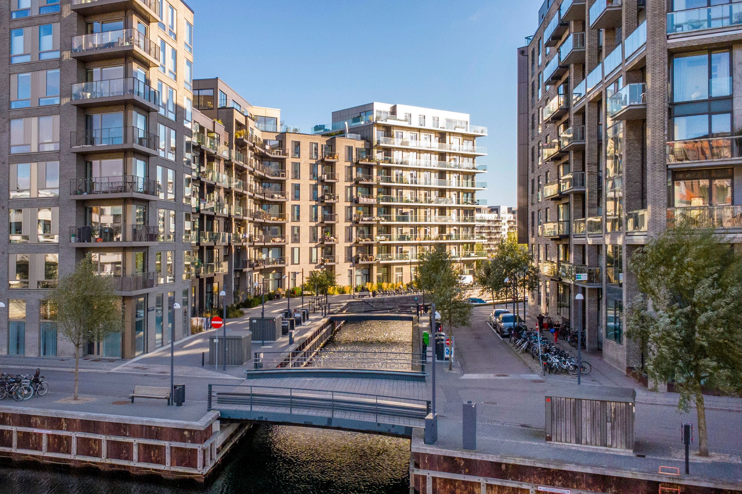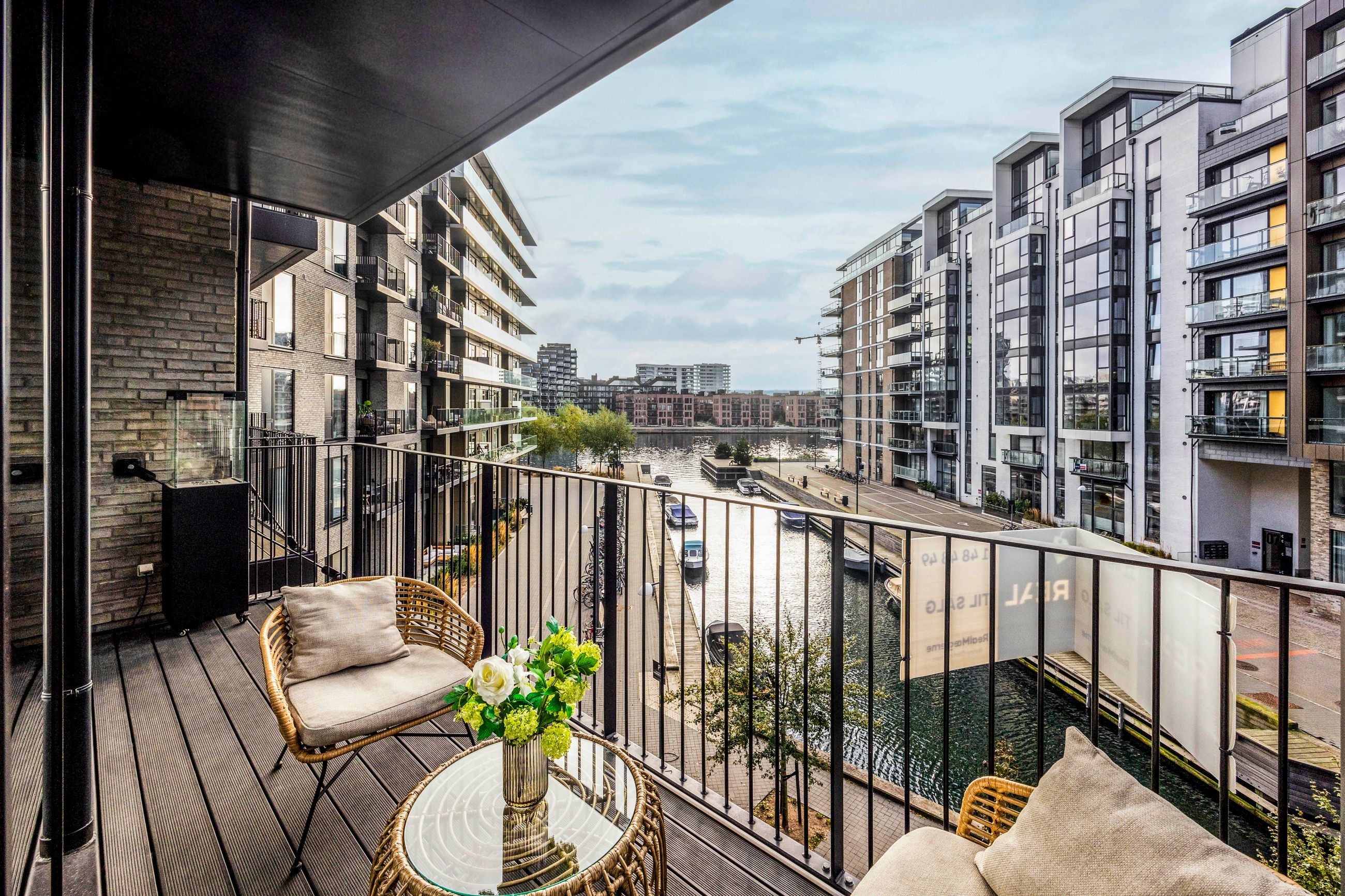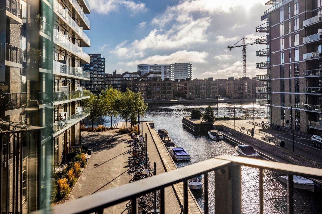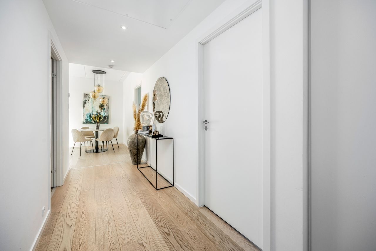 Velkommen til et lyst og indbydende byhjem på havnefronten, hvor udsigten får lov at fylde. Fra stuen har du et eksklusivt kig over vandet mod Bryggen, du følger livet på kanalerne med kajakker og paddleboards og får et dagligt lysindfald, der skaber ro og rum. Rummet opleves åbent og harmonisk, og de brede vinduespartier rammer himlen og vandet ind, så udsigten bliver en naturlig del af indretningen året rundt.