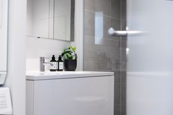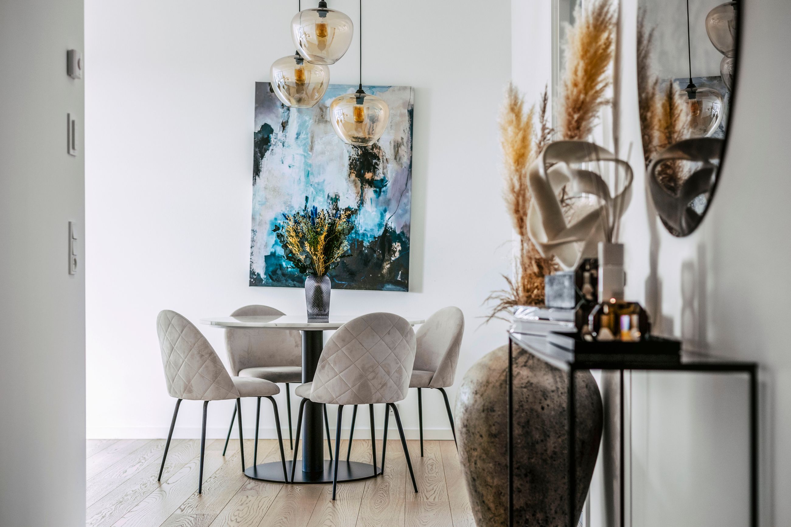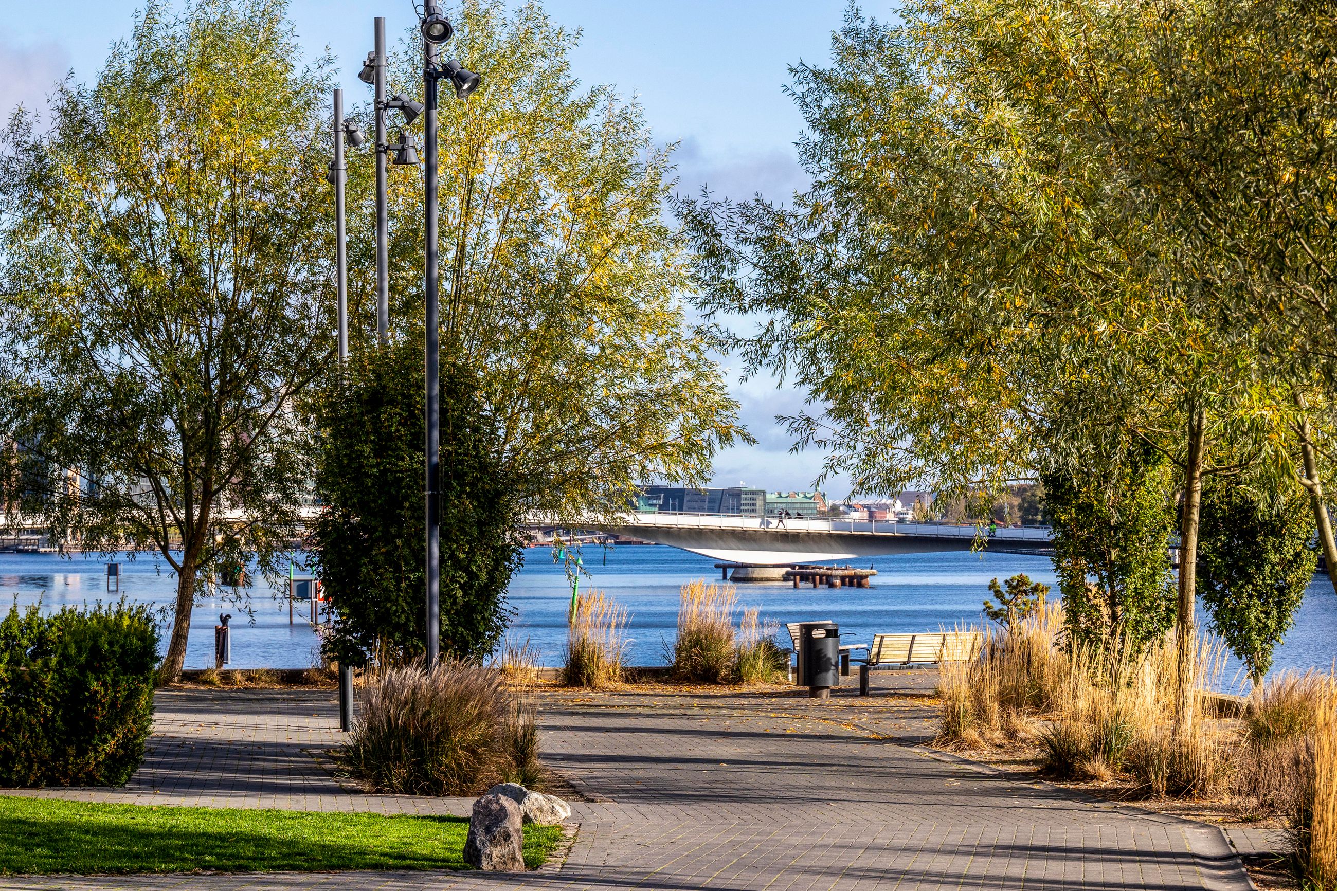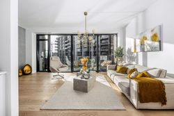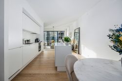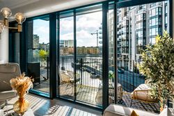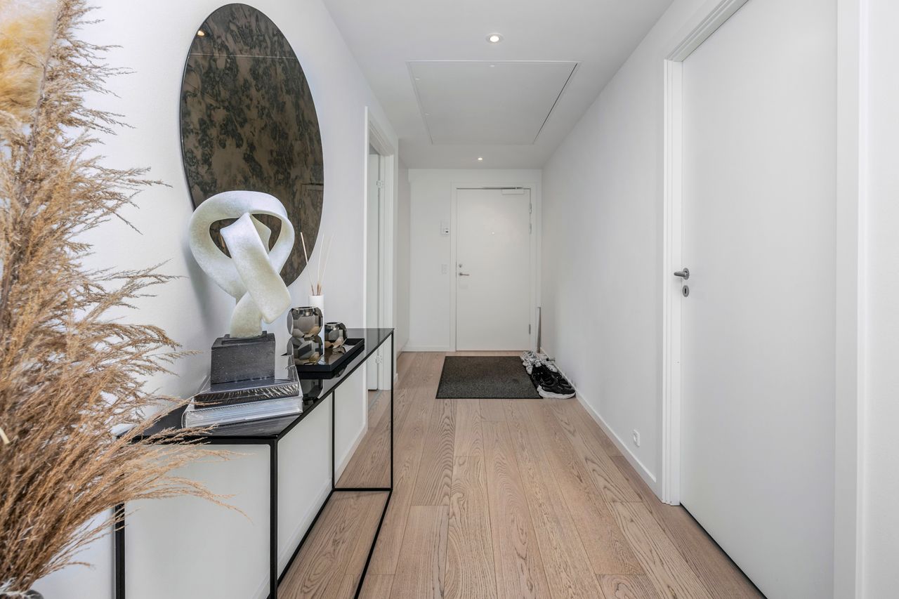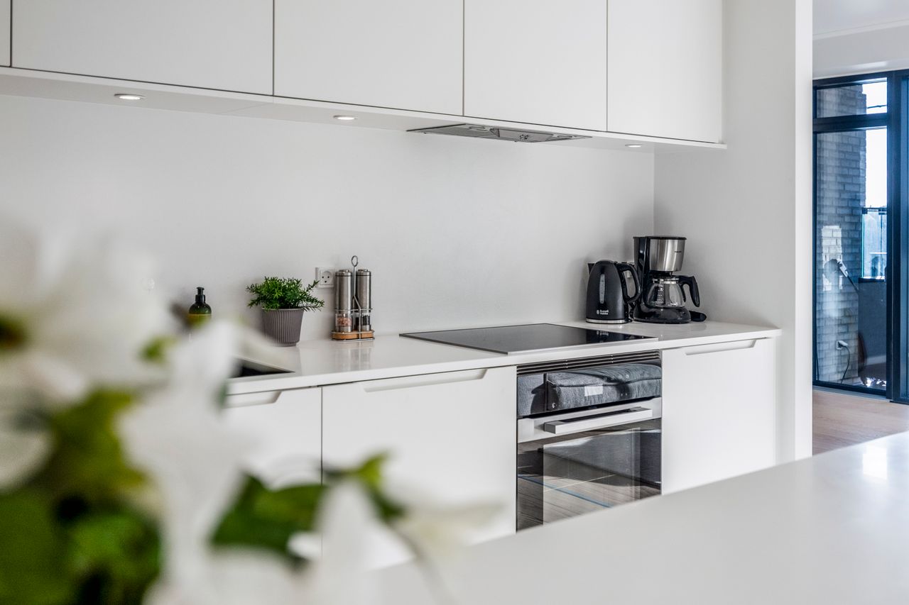Velkommen til et lyst og indbydende byhjem på havnefronten, hvor udsigten får lov at fylde. Fra stuen har du et eksklusivt kig over vandet mod Bryggen, du følger livet på kanalerne med kajakker og paddleboards og får et dagligt lysindfald, der skaber ro og rum. Rummet opleves åbent og harmonisk, og de brede vinduespartier rammer himlen og vandet ind, så udsigten bliver en naturlig del af indretningen året rundt.
