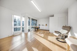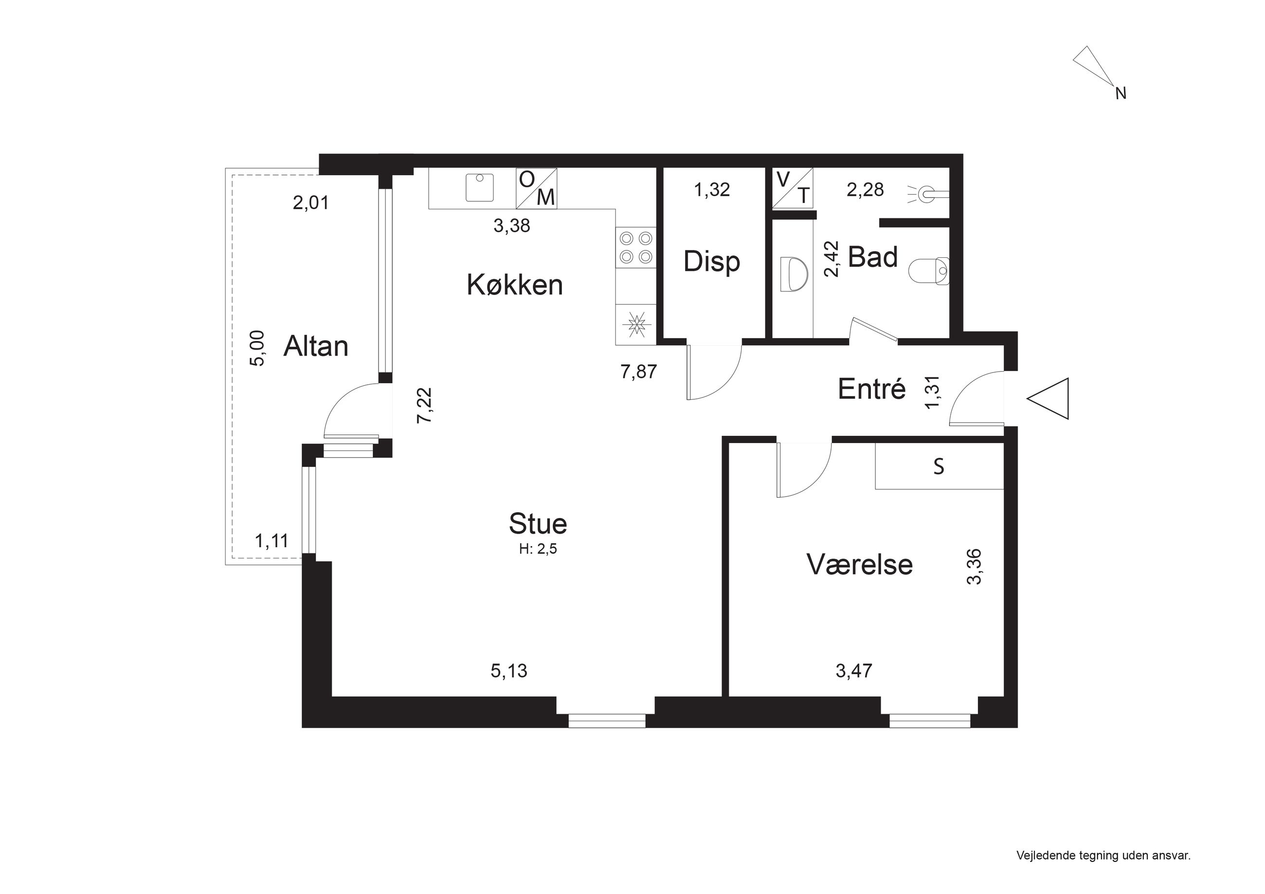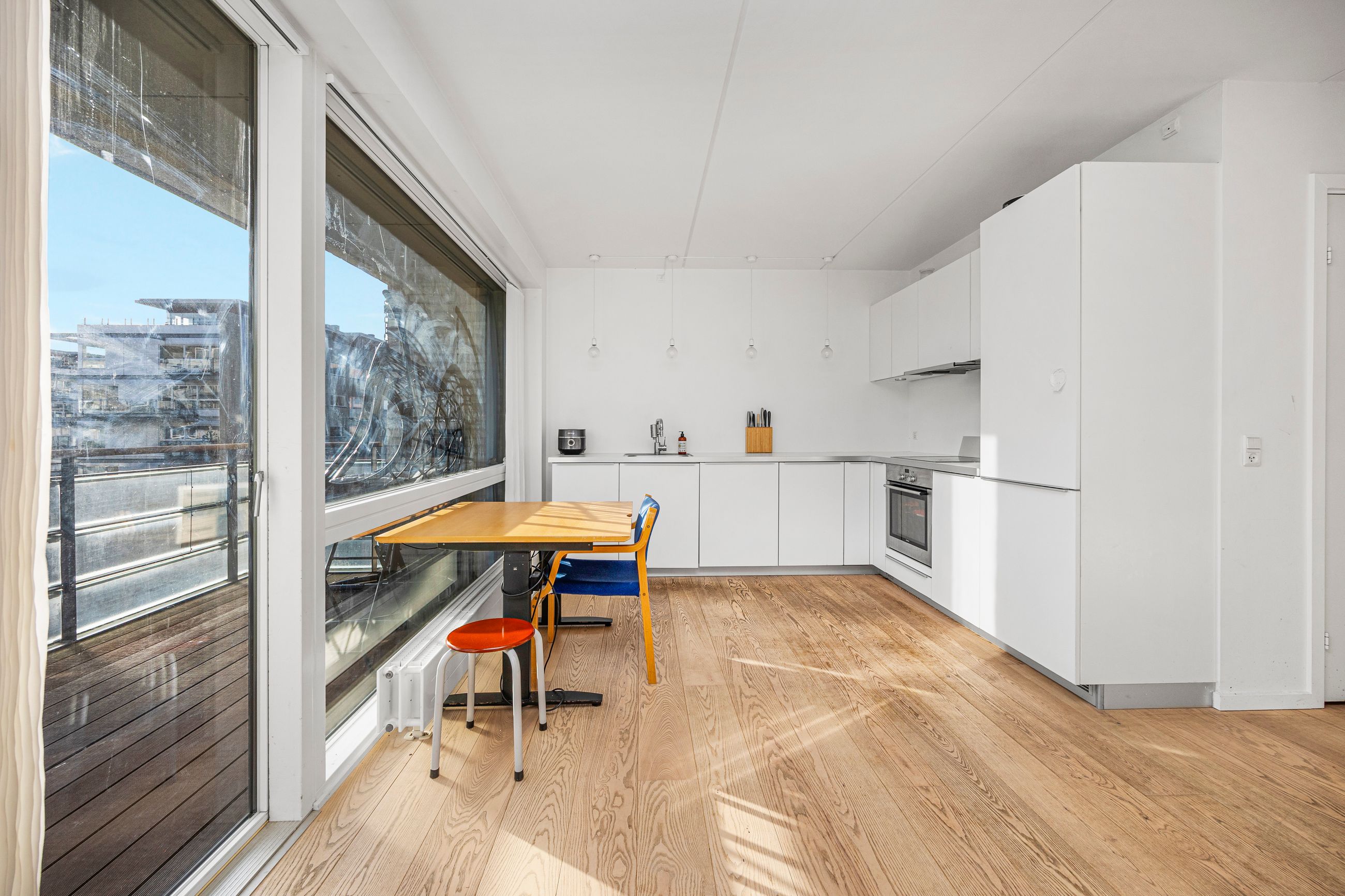 Velkommen til et indflytningsklart hjem på Teglholm Tværvej med optimal planløsning. Entré med garderobe og opbevaring. Det store køkken-alrum ligger langs en glasvæg, hvor de brede vinduespartier lader dagslyset strømme ind og skaber et lyst, åbent opholdsrum. Lyset spejler sig i plankegulvene og giver et roligt, venligt udtryk, mens glaspartierne giver lange kig over kvarterets arkitektur. Her er plads til langbord og sofaarrangement, og fra alrummet er der udgang til den store altan med god dybde – med plads til lounge og grill. Boligen er i dag en 2-værelses, men kan let udnyttes som 3V ved opsætning af en let væg i alrummet. Soveværelset vender mod nord og holder sig tempereret, når solen går ned og aftenen falder på, og her er god skabsplads. Disponibelt rum til ekstra opbevaring. Badeværelset er velindrettet med bruseniche, vaskesøjle og gulvvarme. Køkkenet er fuldt funktionelt med hvide elementer, ovn, kogeplade, emhætte og fin bord- og skabsplads.