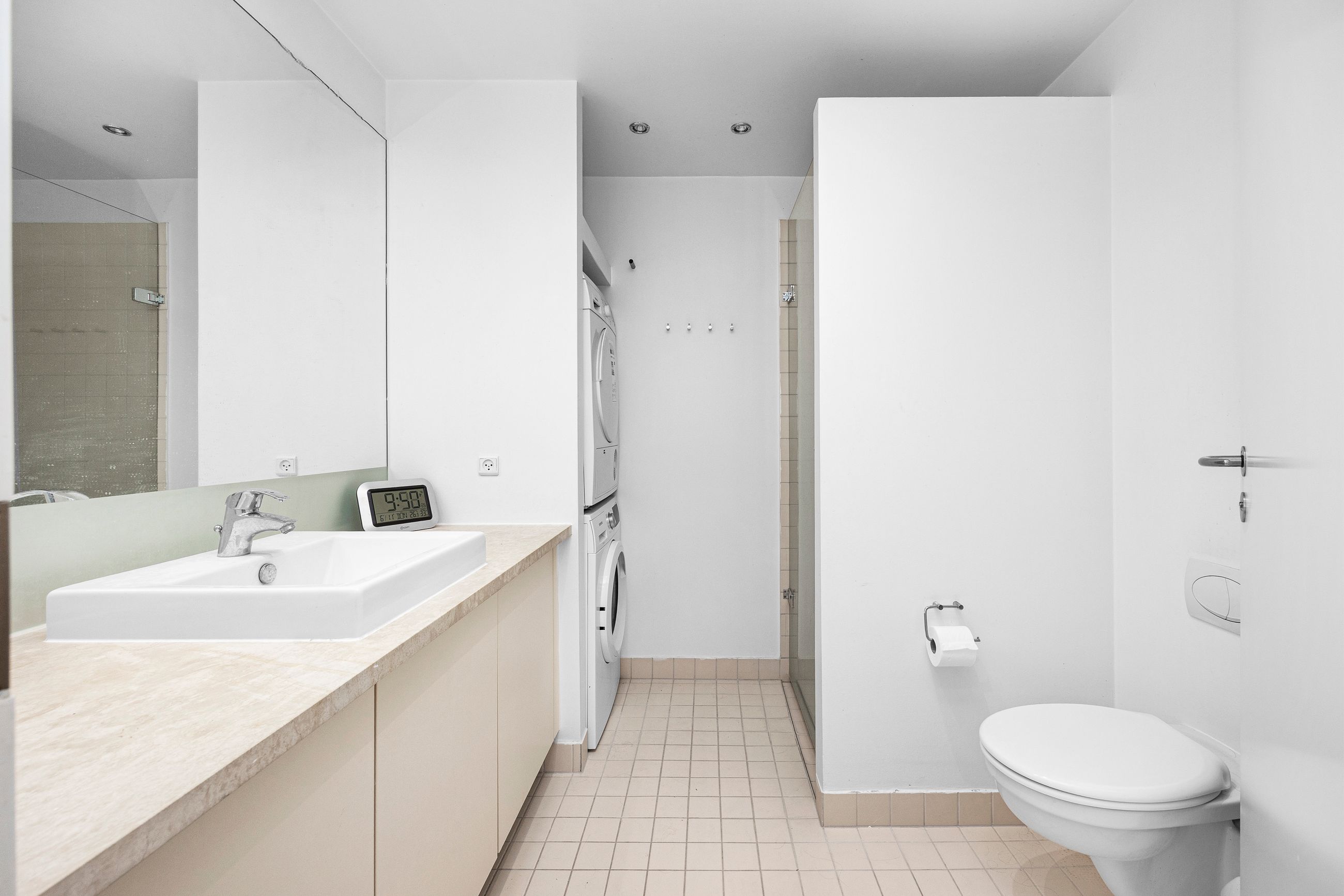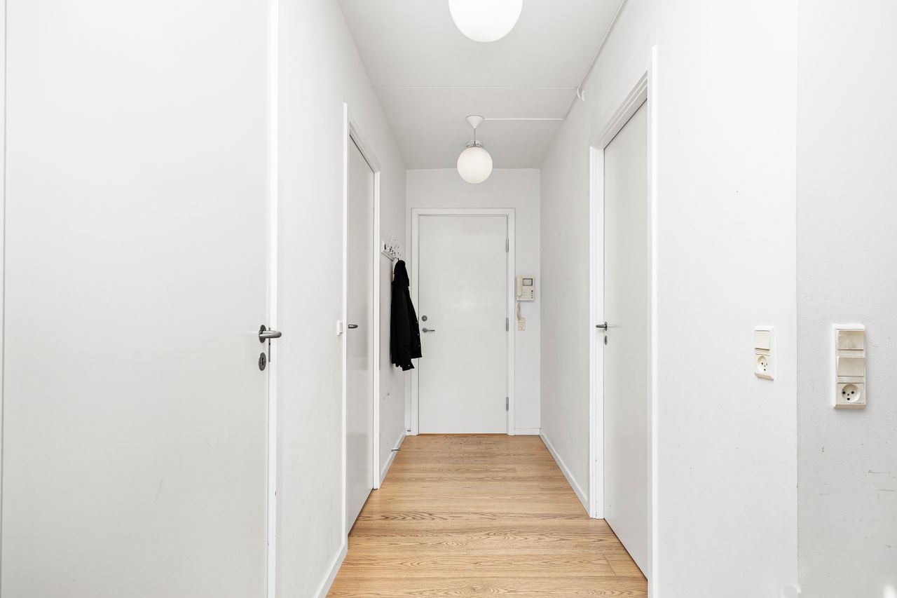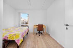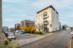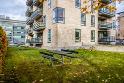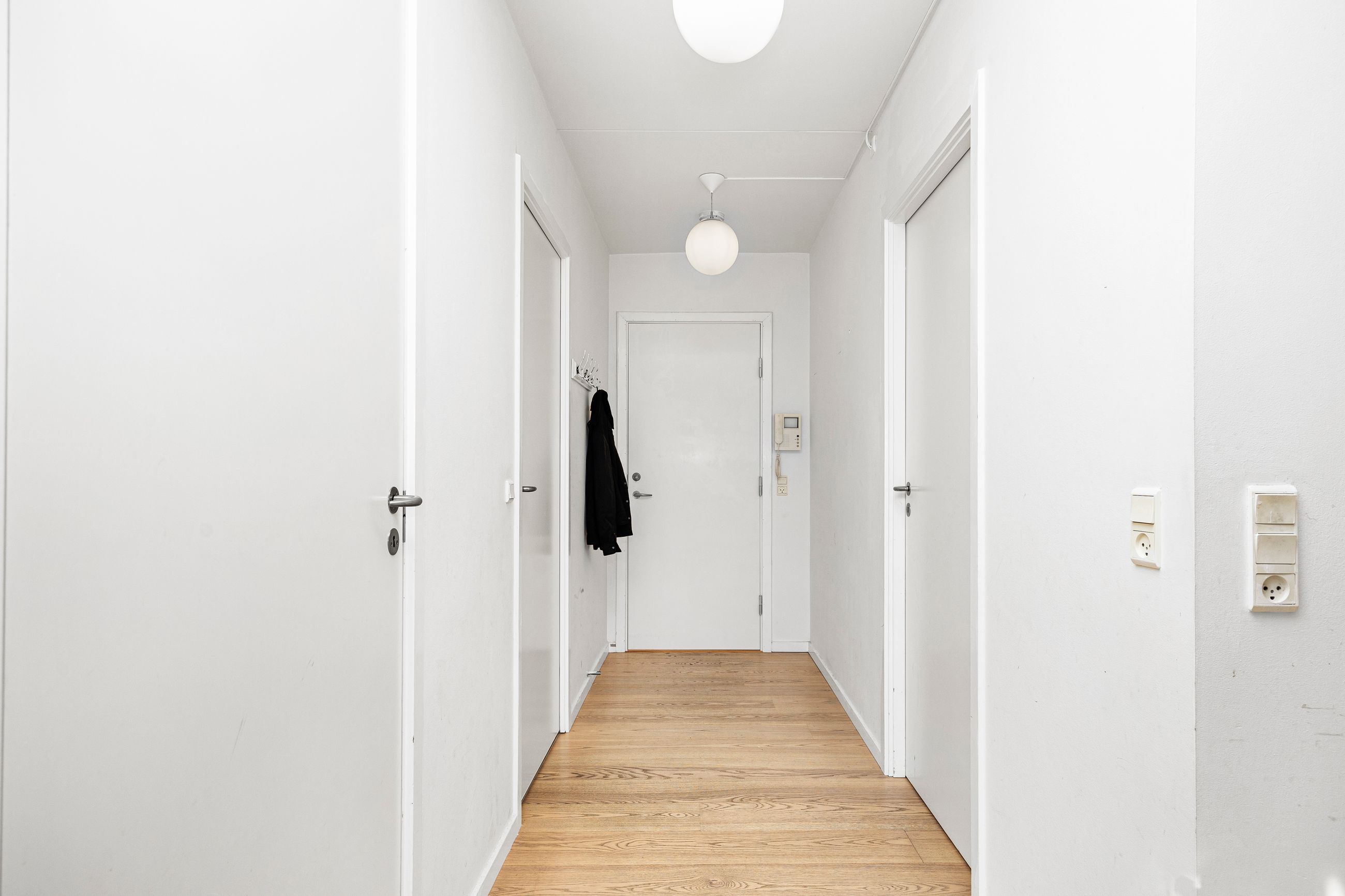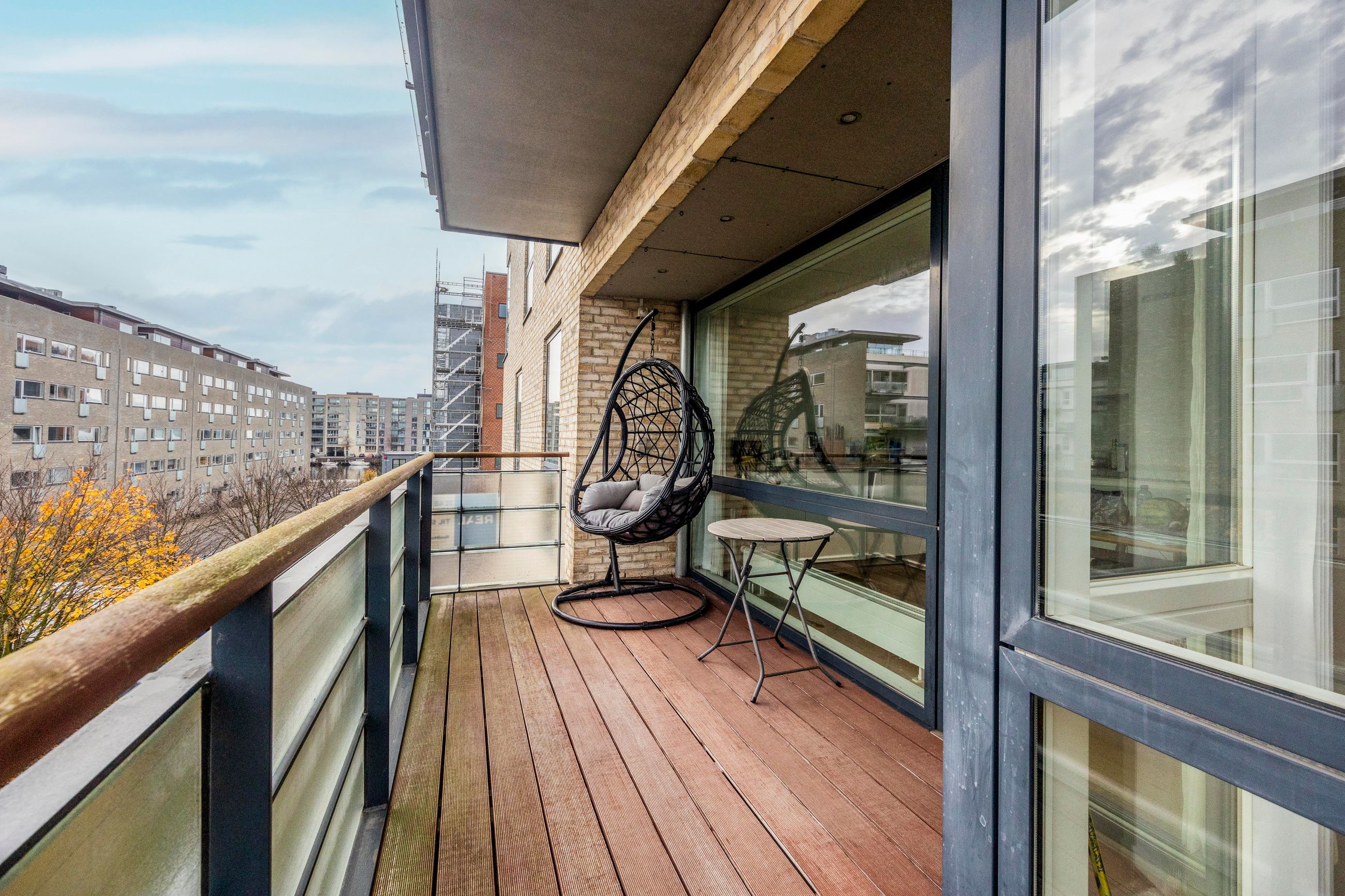 Ejendommen fremstår moderne med lyse teglfacader, store vinduer og altaner. Fællesarealerne er pæne og funktionelle, gården er velholdt med hække og beplantning, og der er cykelparkering og affaldssortering – rammer, der gør hverdagen nem.