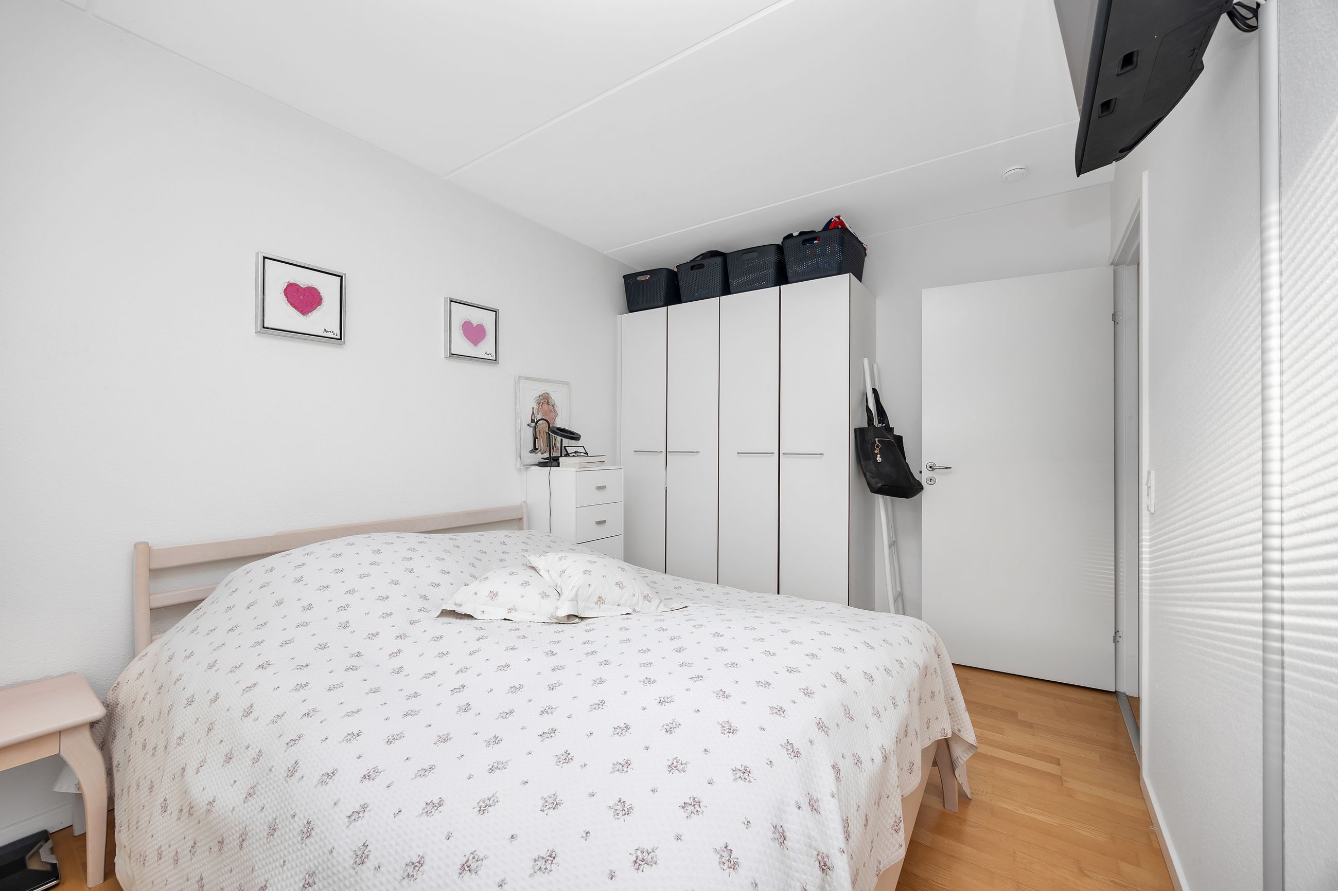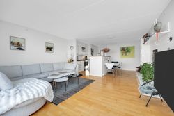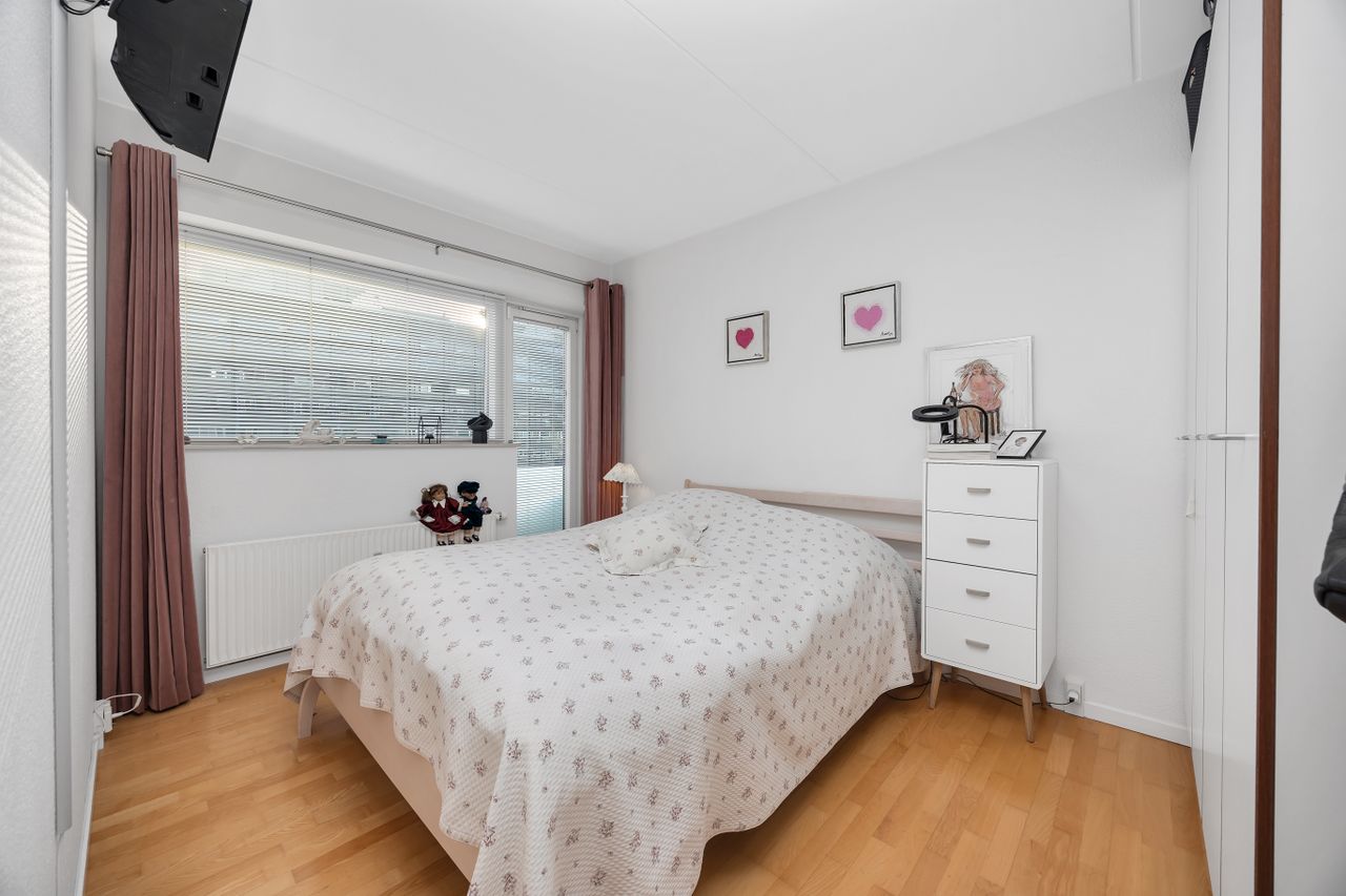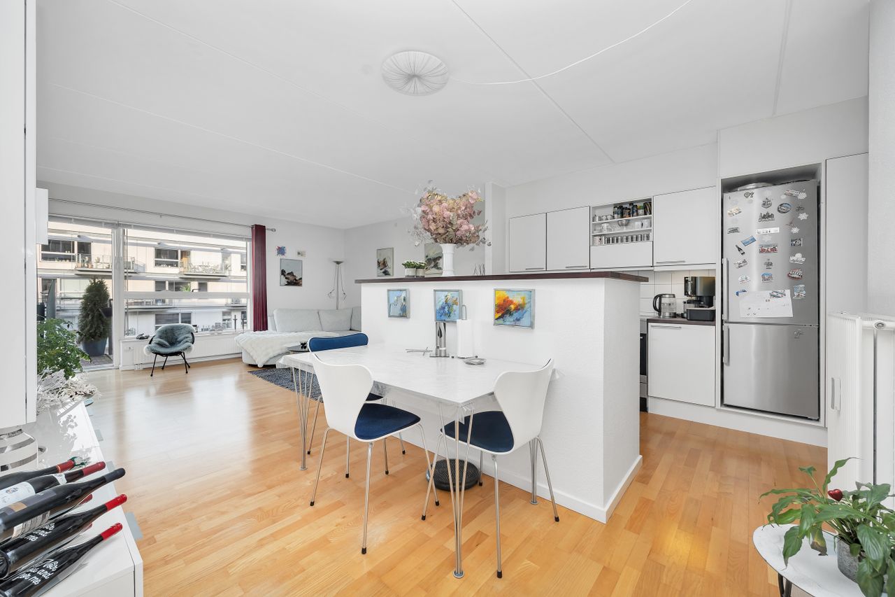 Planløsningen er velovervejet med en møblerbar entré, der giver et fint overblik over lejligheden. Herfra er der adgang til et lyst badeværelse med separat bruseniche, vindue og praktisk vaskesøjle samt to gode værelser i boligens stille del. Det ene værelse egner sig oplagt som soveværelse med skabe og plads til opbevaring, mens det andet lige så fint kan bruges som børneværelse, gæsteværelse eller hjemmekontor. Overalt går de lyse overflader og trægulve igen og skaber en behagelig, sammenhængende atmosfære, som er nem at indrette videre på.