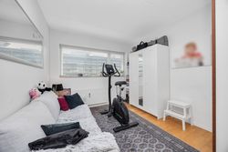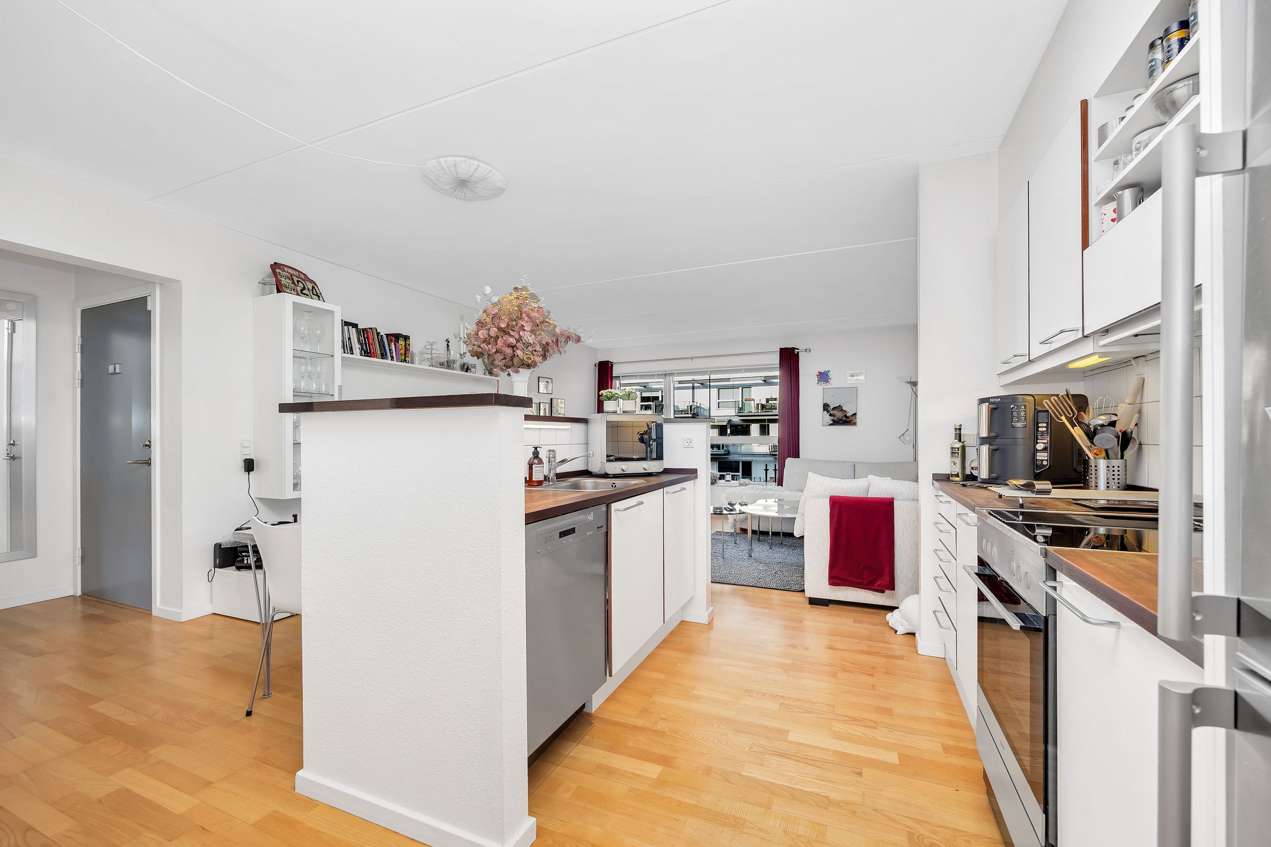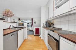 Boligens naturlige samlingspunkt er det store opholdsrum, hvor stue og køkken ligger i åben forbindelse. Her er god plads til både sofaarrangement og spisebord, og de brede vinduespartier trækker dagslyset langt ind i rummet. Køkkenet fremstår tidløst med hvide elementer, træbordplader og gode arbejdsforhold, så madlavning og samvær kan gå hånd i hånd. Fra stuen er der direkte udgang til altanen, hvor du kan følge livet ved vandet, nyde en stille stund med en bog eller invitere gæster på et glas i det fri.