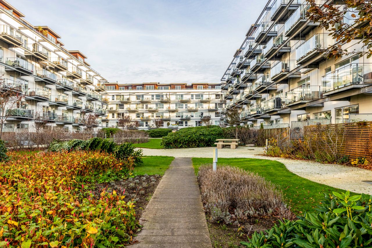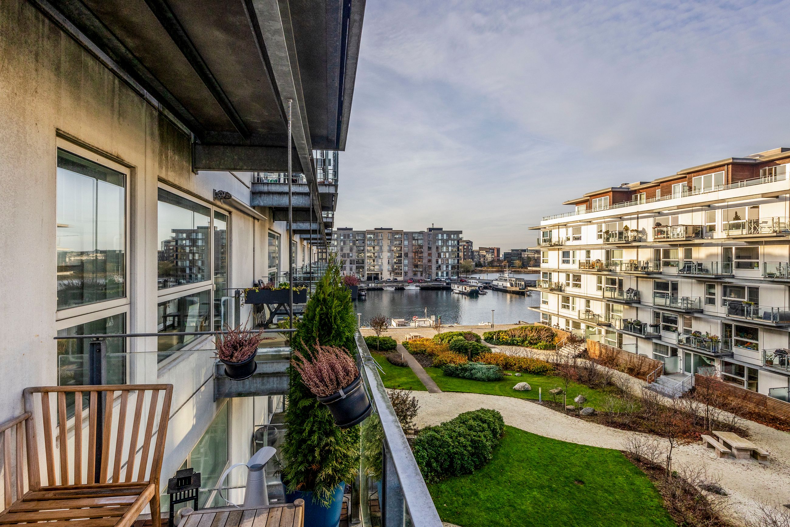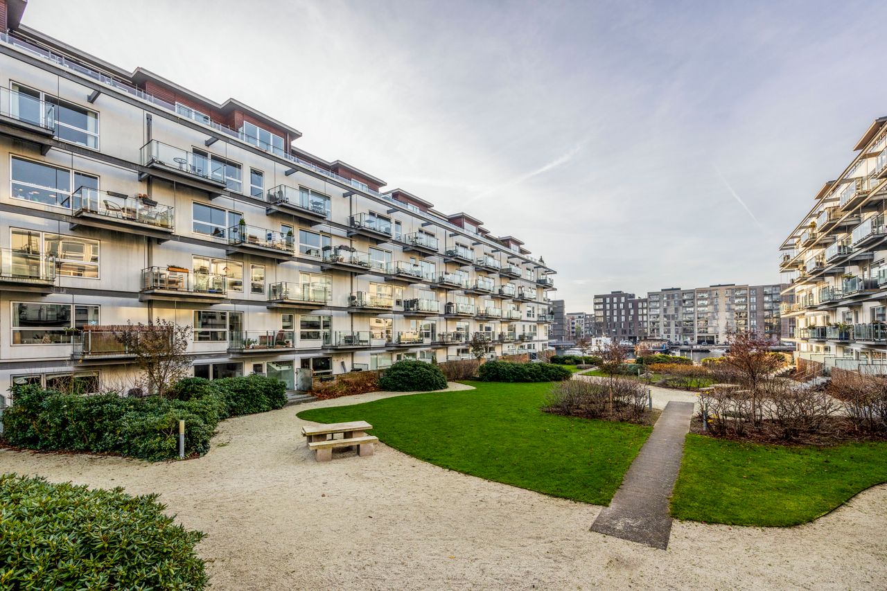 Velkommen til Teglholm Tværvej 5, 3. tv. – en lys og venligt indrettet lejlighed, hvor vandet, udsigten og det grønne gårdmiljø er en naturlig del af hverdagen. Fra den solrige altan er der frit kig ned over den velplejede beplantning, havnebassinet og den høje beliggenhed giver både ro og privatliv, samtidig med at du er midt i det levende Teglholmen-kvarter.