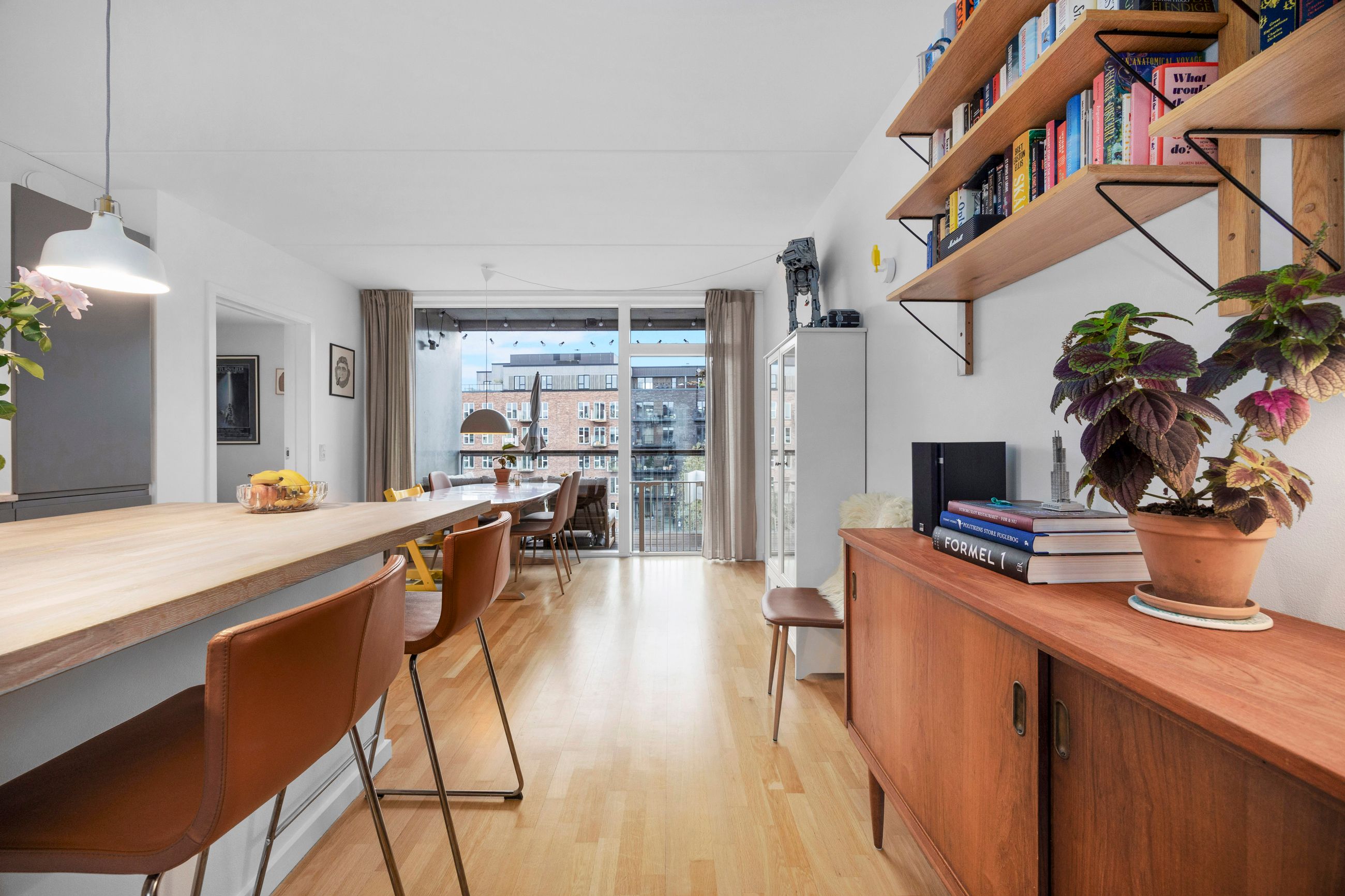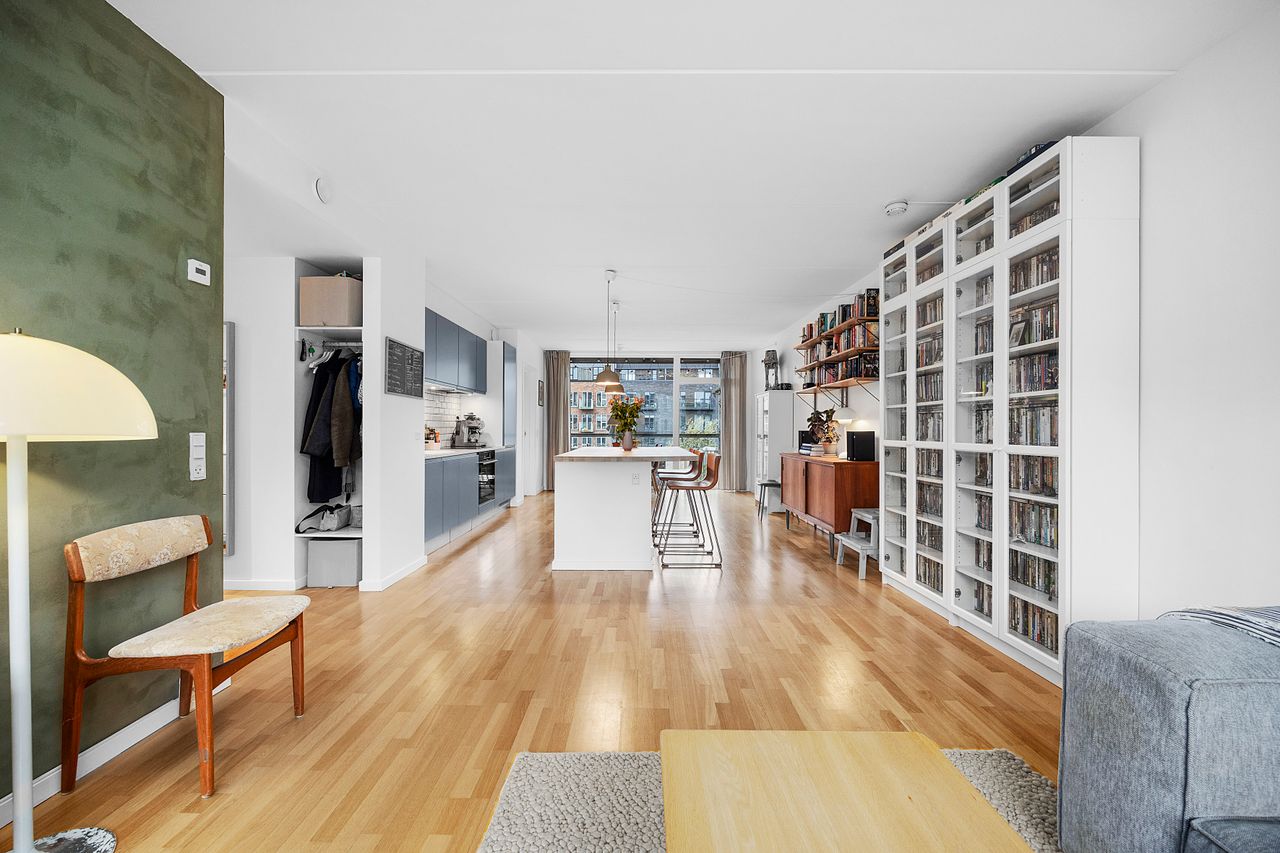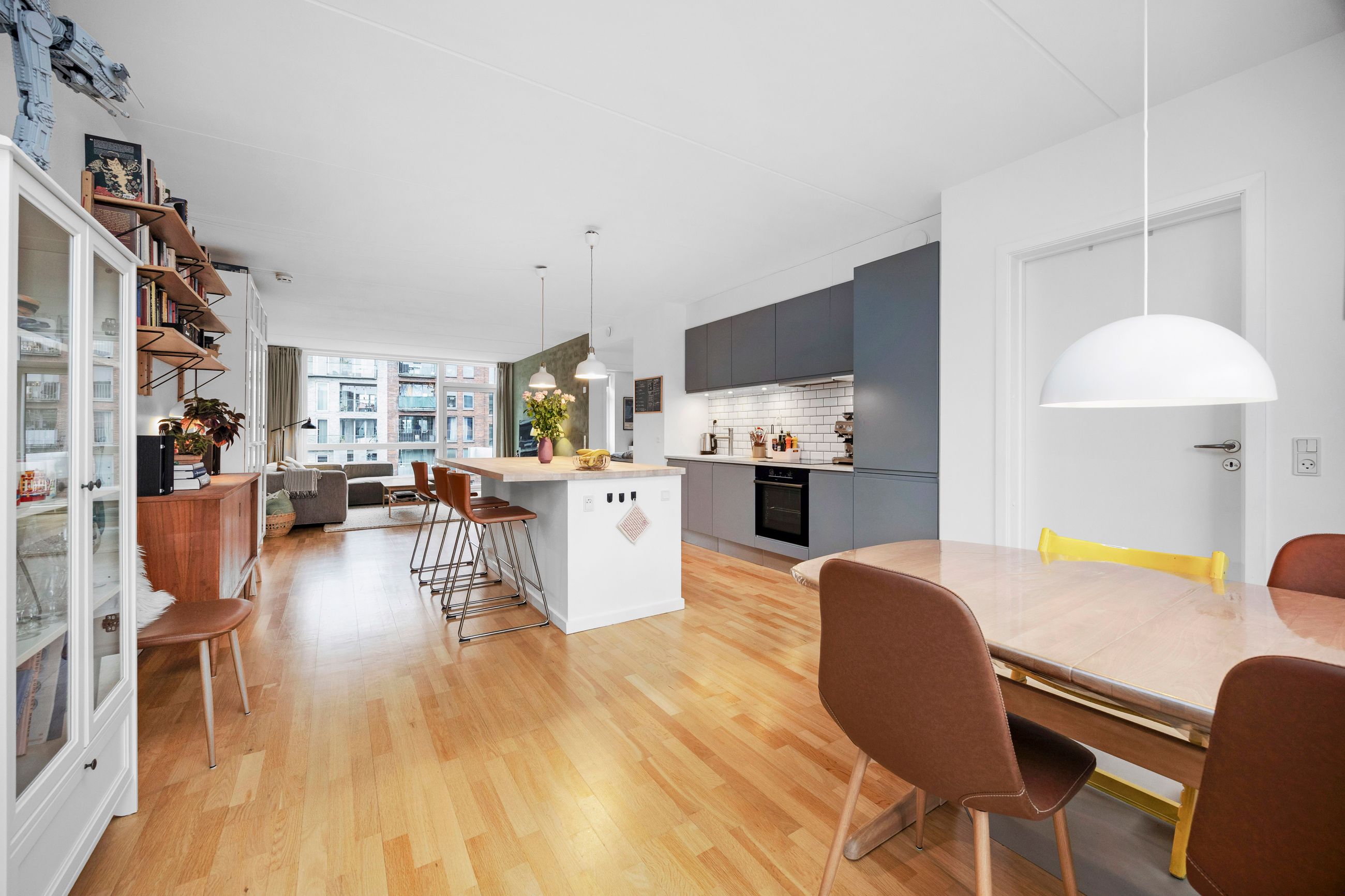 Højt til himlen, sol fra syd og kig til det glitrende vand – på Thad Jones Vej 6, 3. th. får du en lys og veldisponeret lejlighed på 106 kvm, hvor funktionalitet, atmosfære og delevenlighed går hånd i hånd.