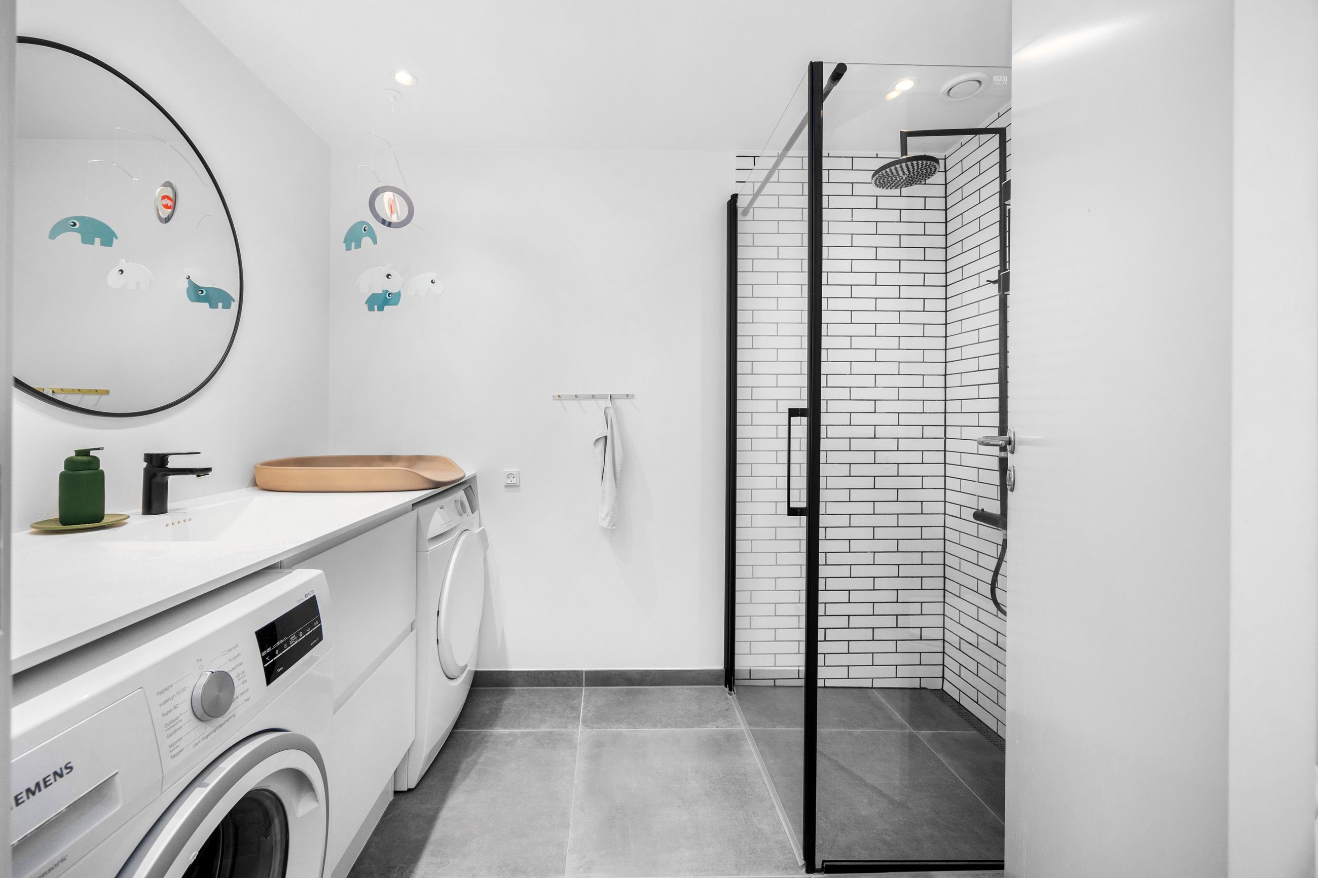 Badeværelset er moderne og veludnyttet med separat bruseniche og praktisk vaskesøjle.