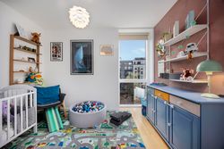 Fra stuen træder du ud på en skøn, sydvendt altan med masser af sol og en flot udsigt mod vandet. Det andet vinduesparti vender imod gårdens grønne fællesarealer, hvor der også er legeplads – perfekt til både børn og afslapning i rolige omgivelser.