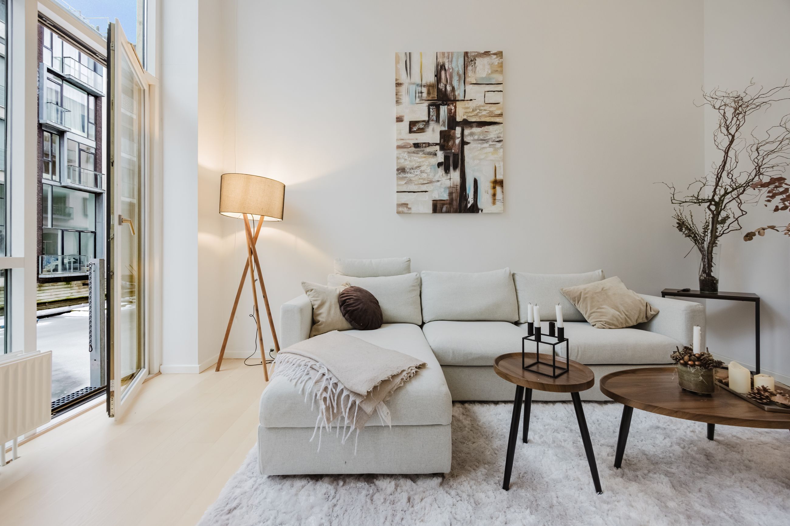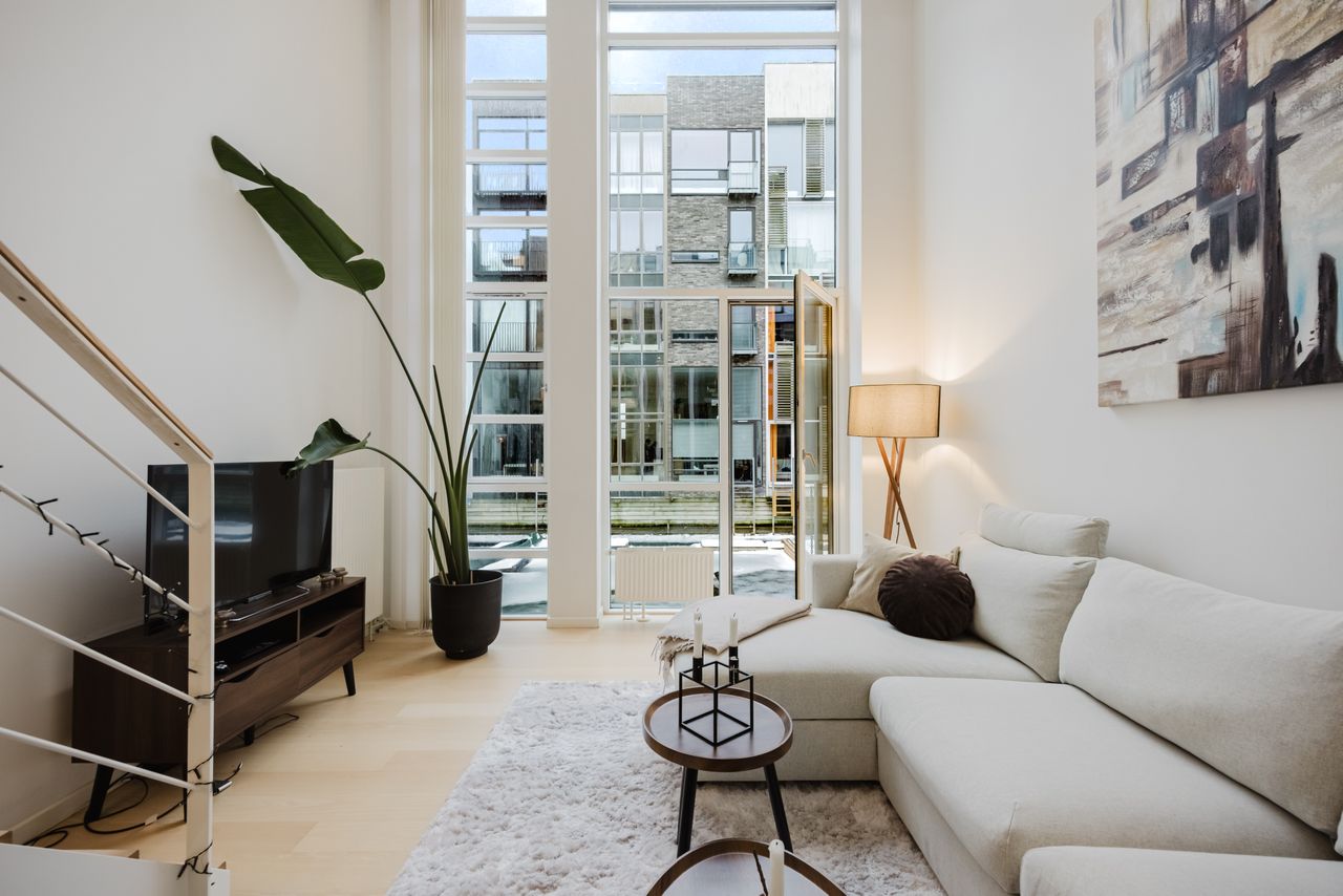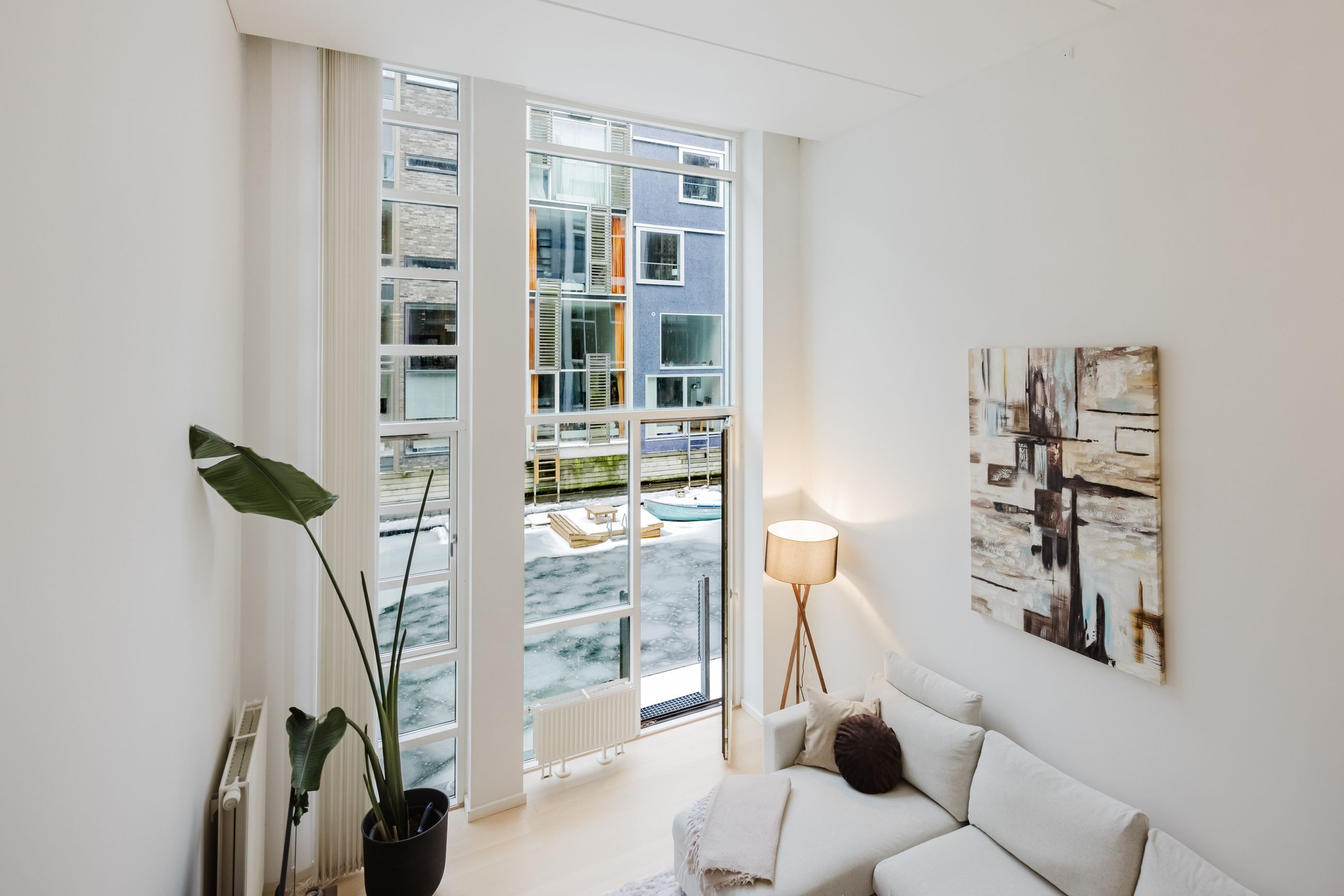Opholdsrummet imponerer med en markant loftshøjde på ca. 4,5 meter, som skaber en imponerende rumfornemmelse og et fantastisk lysindfald fra de store vinduespartier. Lyset giver stuen en åben og indbydende karakter, hvor udsigten til kanalen bliver en betydende del af indretningen.