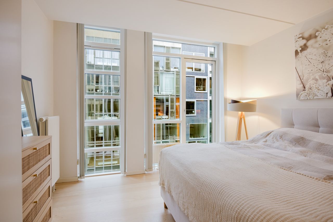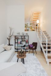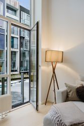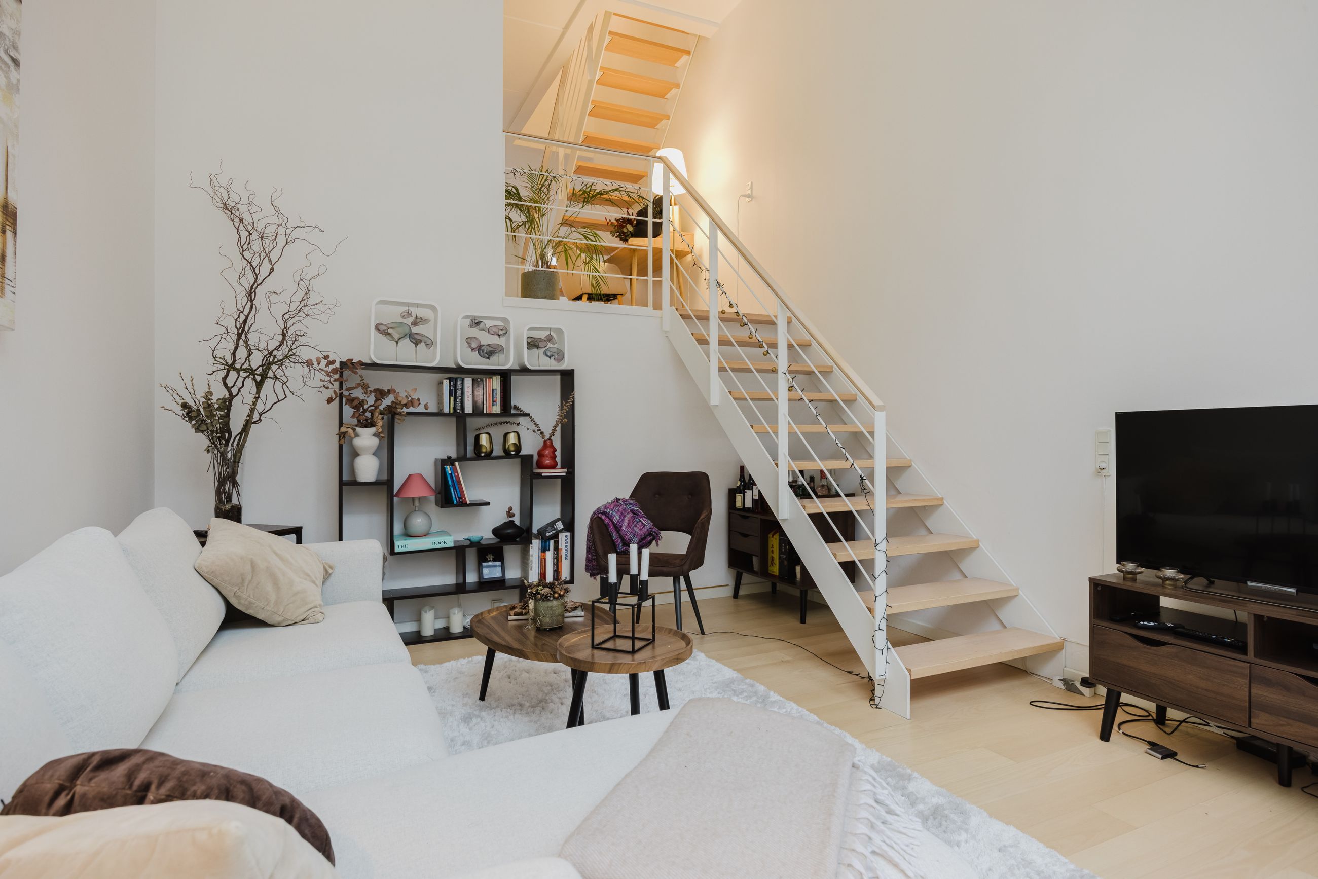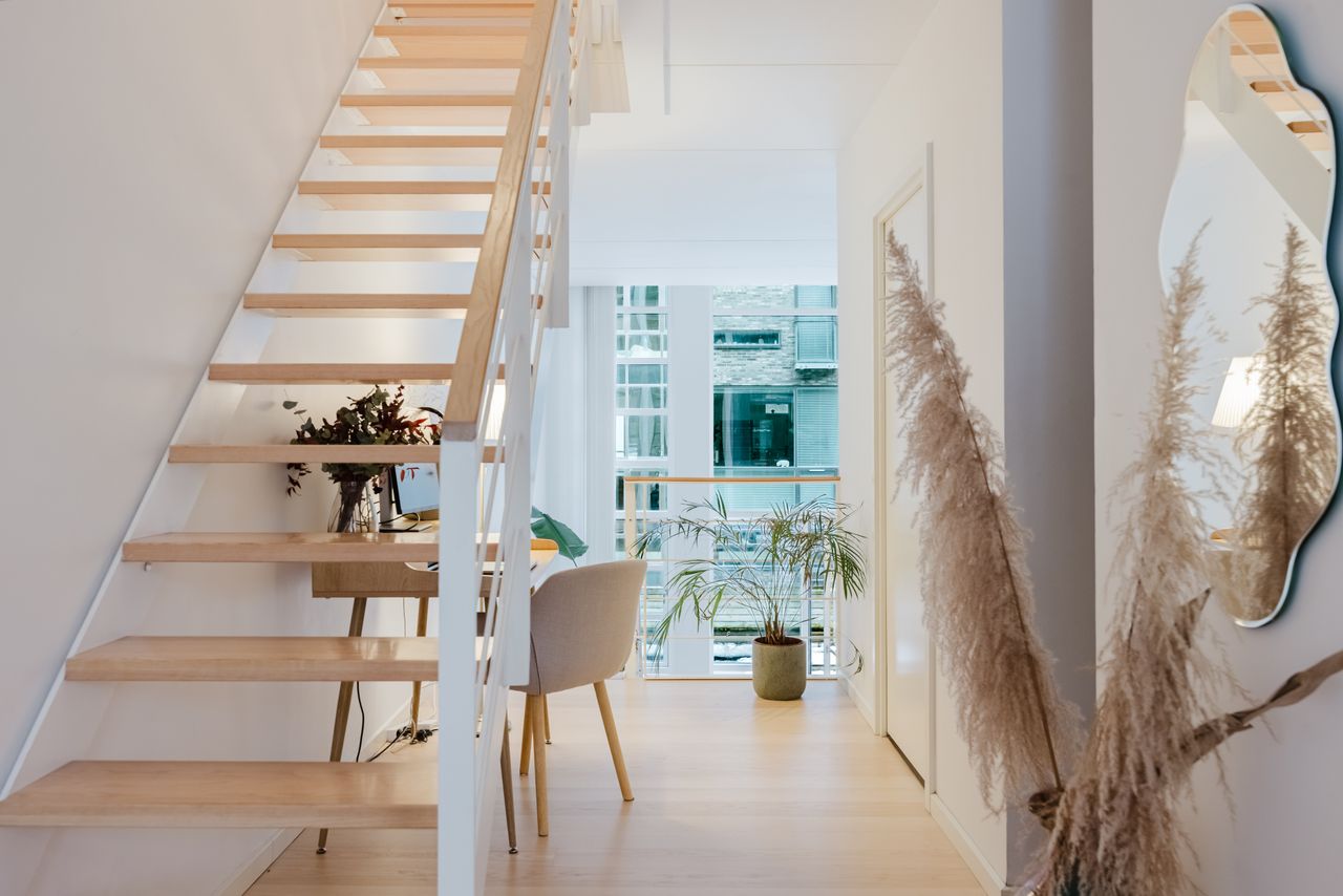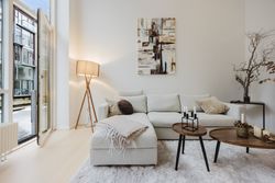 Opholdsrummet imponerer med en markant loftshøjde på ca. 4,5 meter, som skaber en imponerende rumfornemmelse og et fantastisk lysindfald fra de store vinduespartier. Lyset giver stuen en åben og indbydende karakter, hvor udsigten til kanalen bliver en betydende del af indretningen.