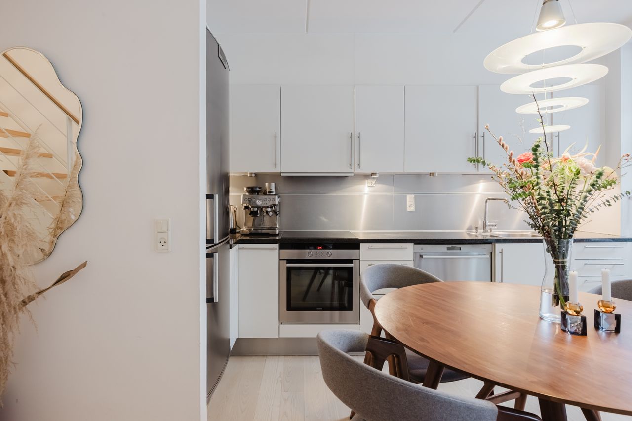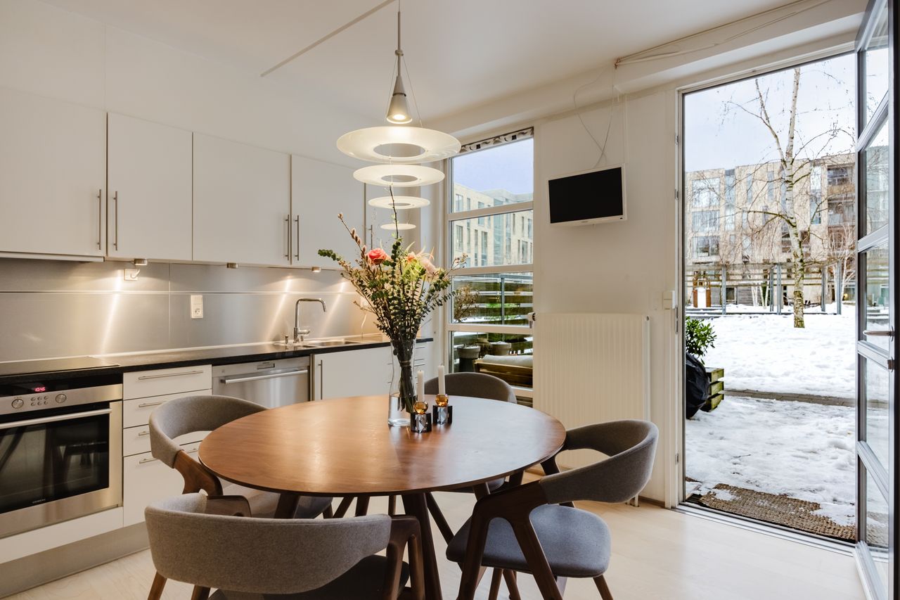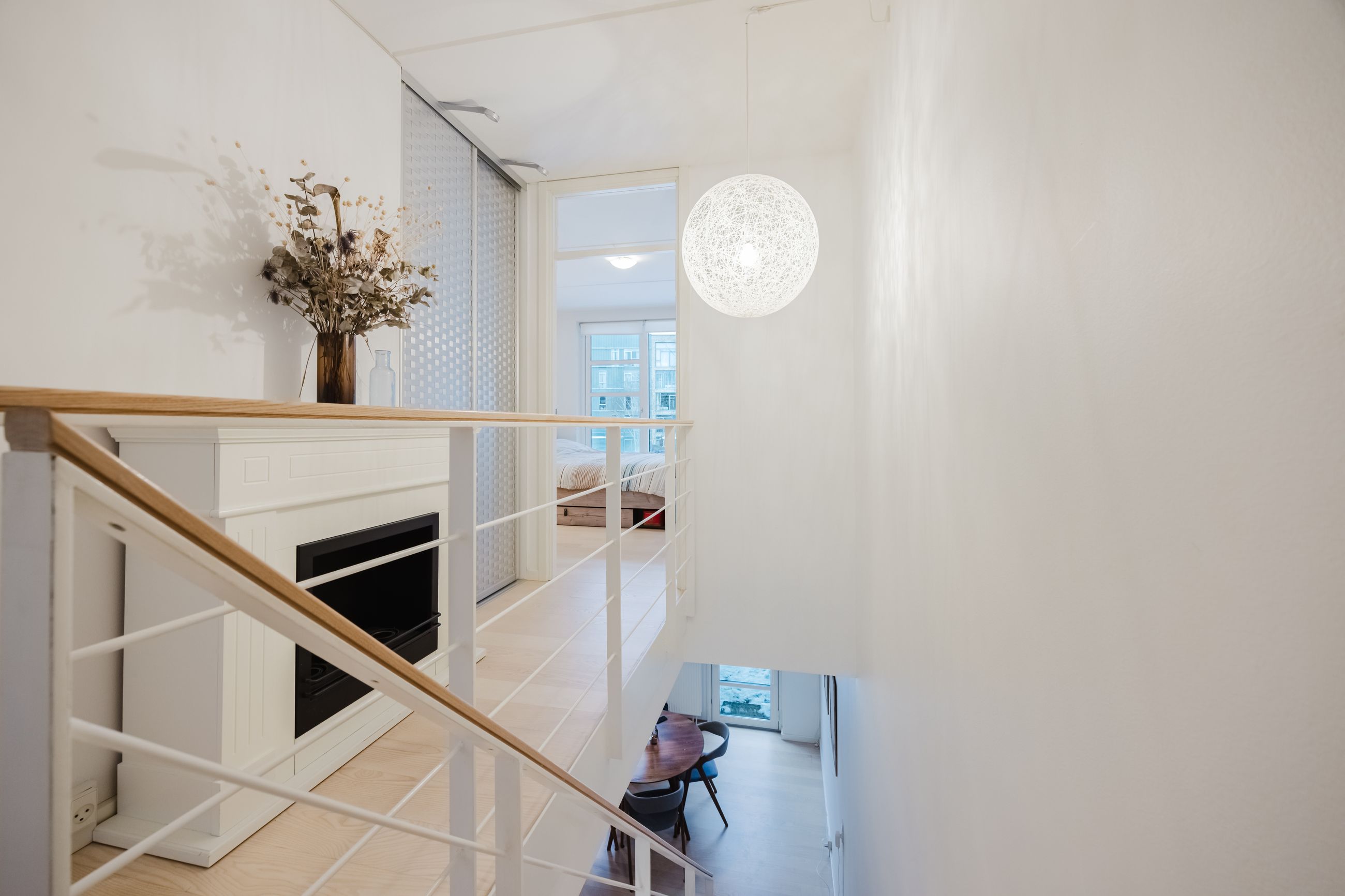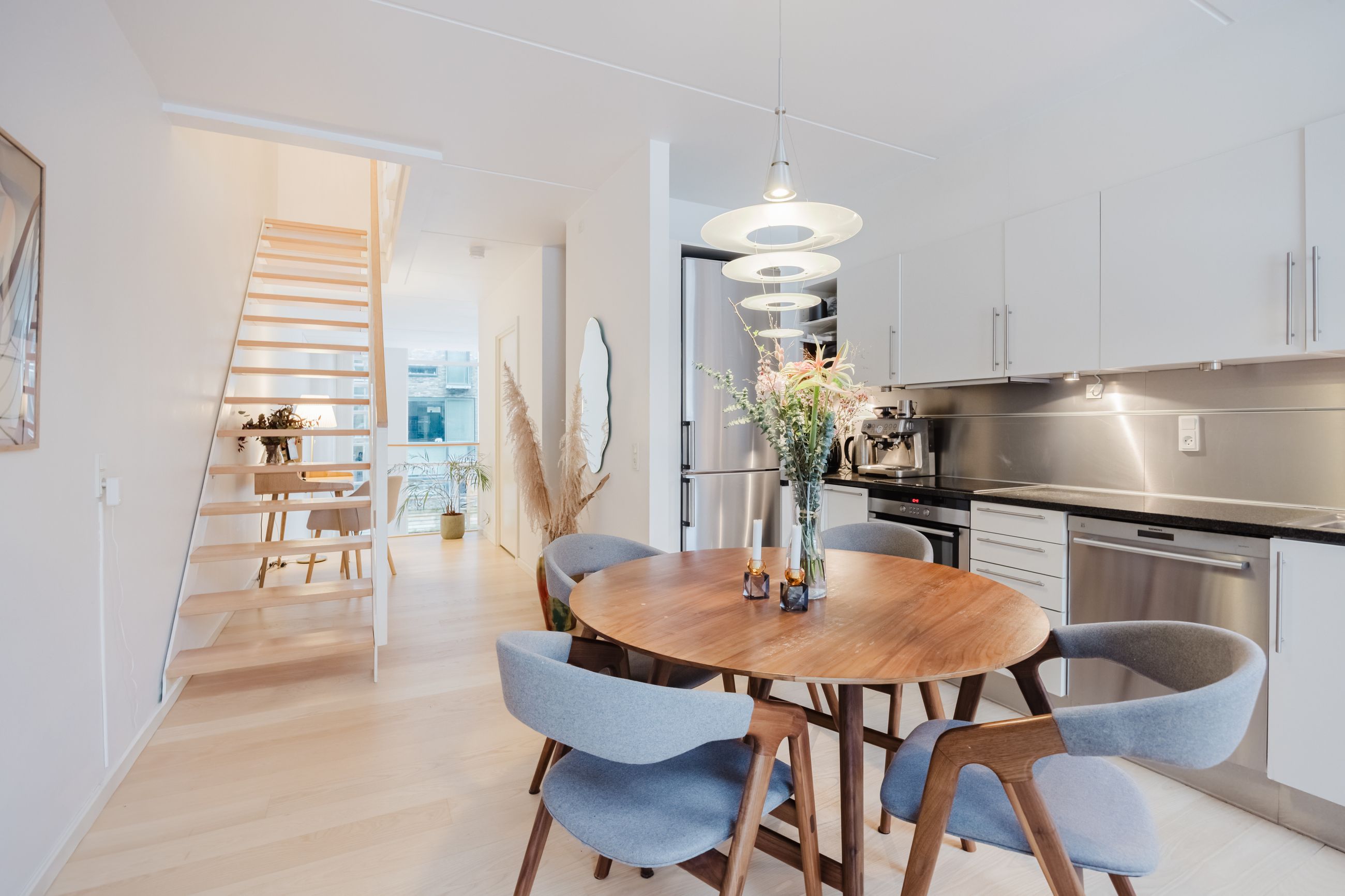 Køkken og stue er sepereret og sørger for god opdeling af rummene. Planløsningen er velovervejet, og hver kvadratmeter er udnyttet effektivt. Fra opholdsrummet er der direkte adgang til pontonen mod vandet, hvor man kan nyde solen og det levende havnemiljø. Pontonen fungerer som et ekstra uderum og giver mulighed for både badning, kajak eller blot ophold med udsigt over kanalen.