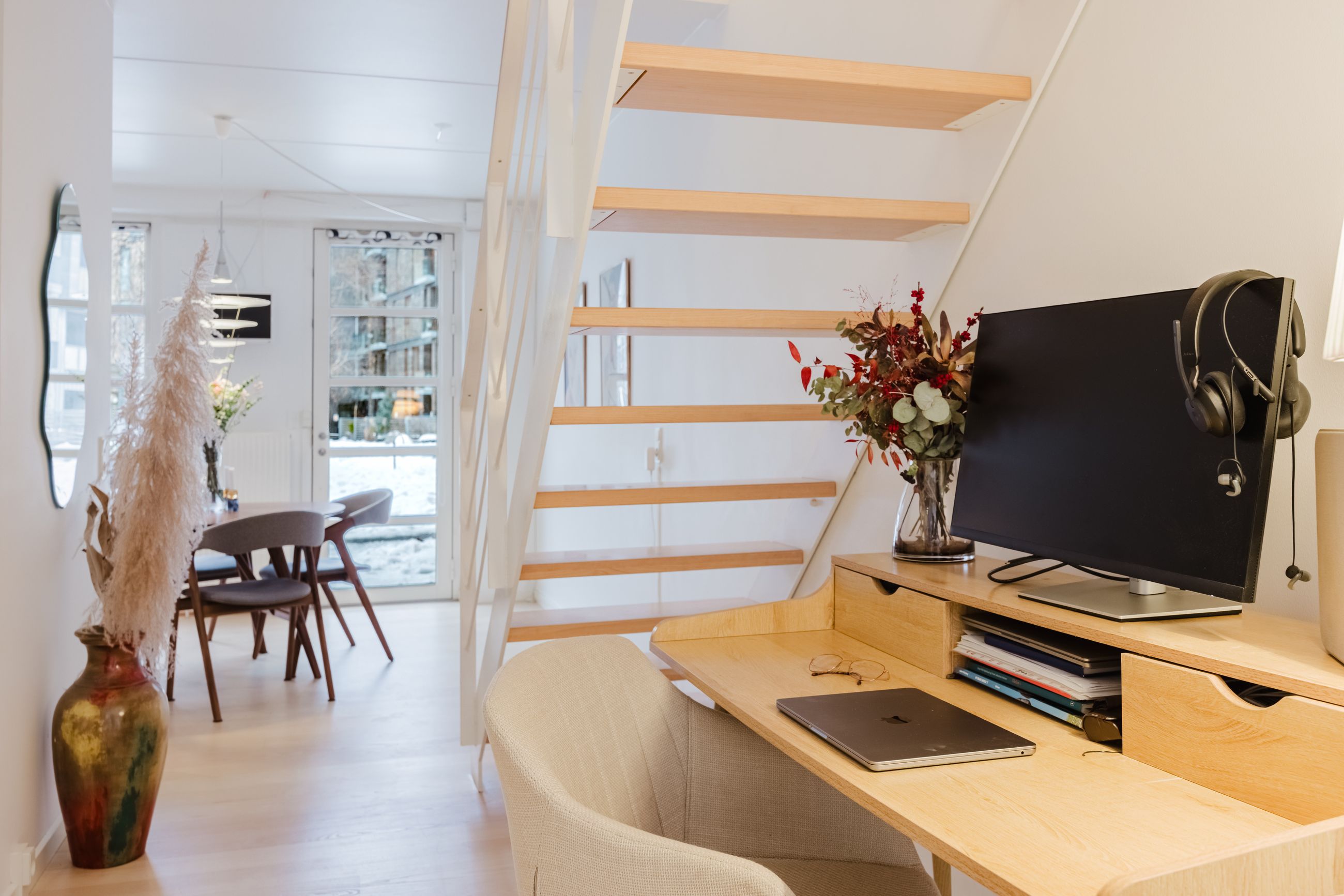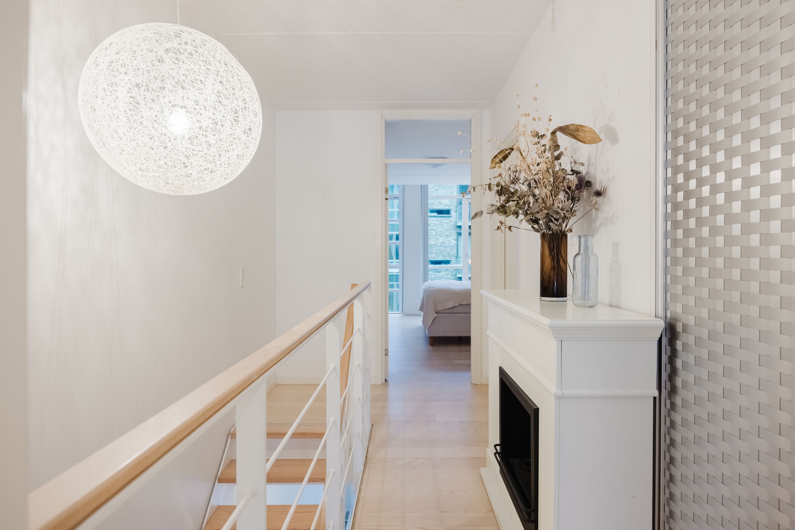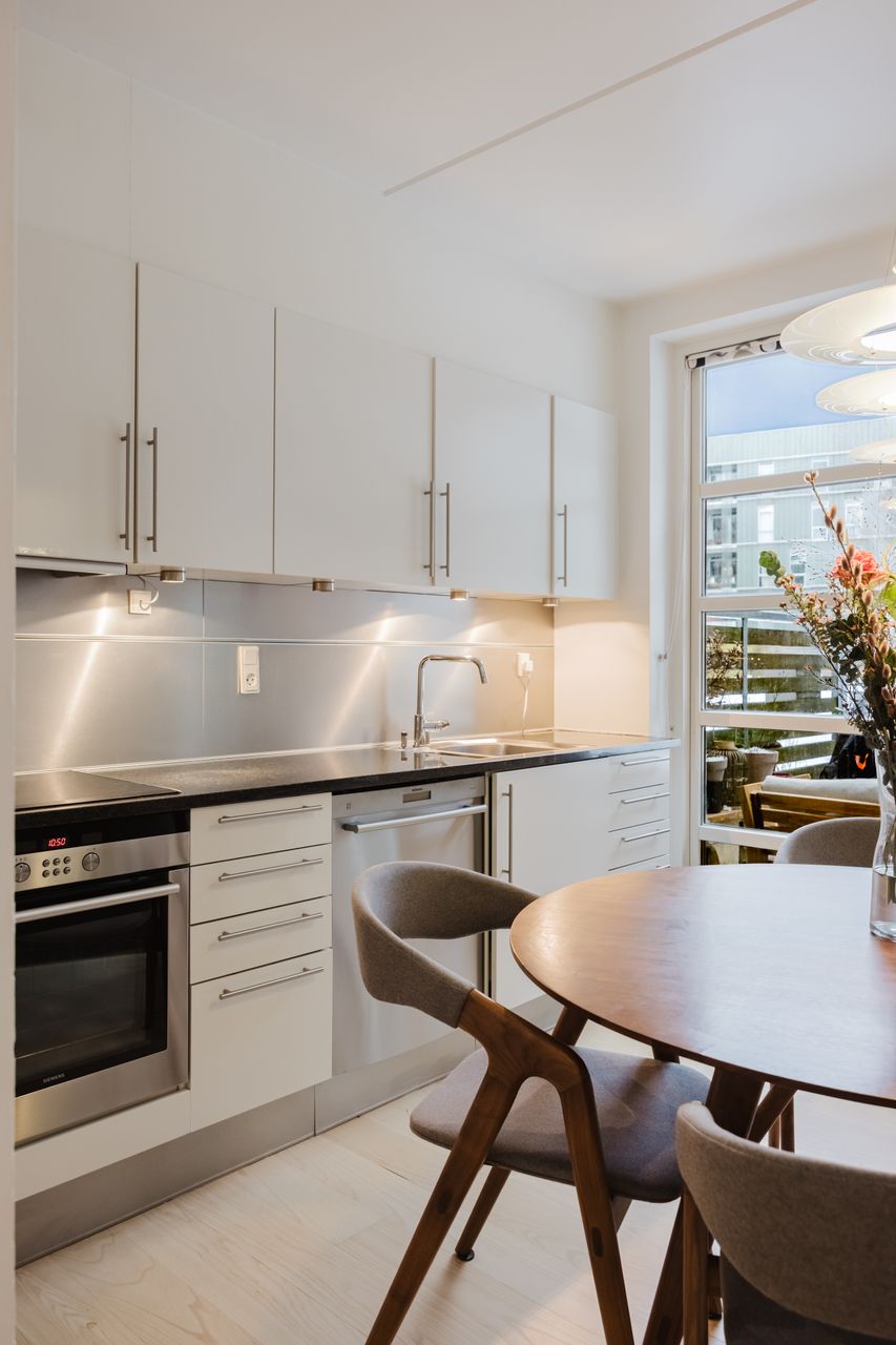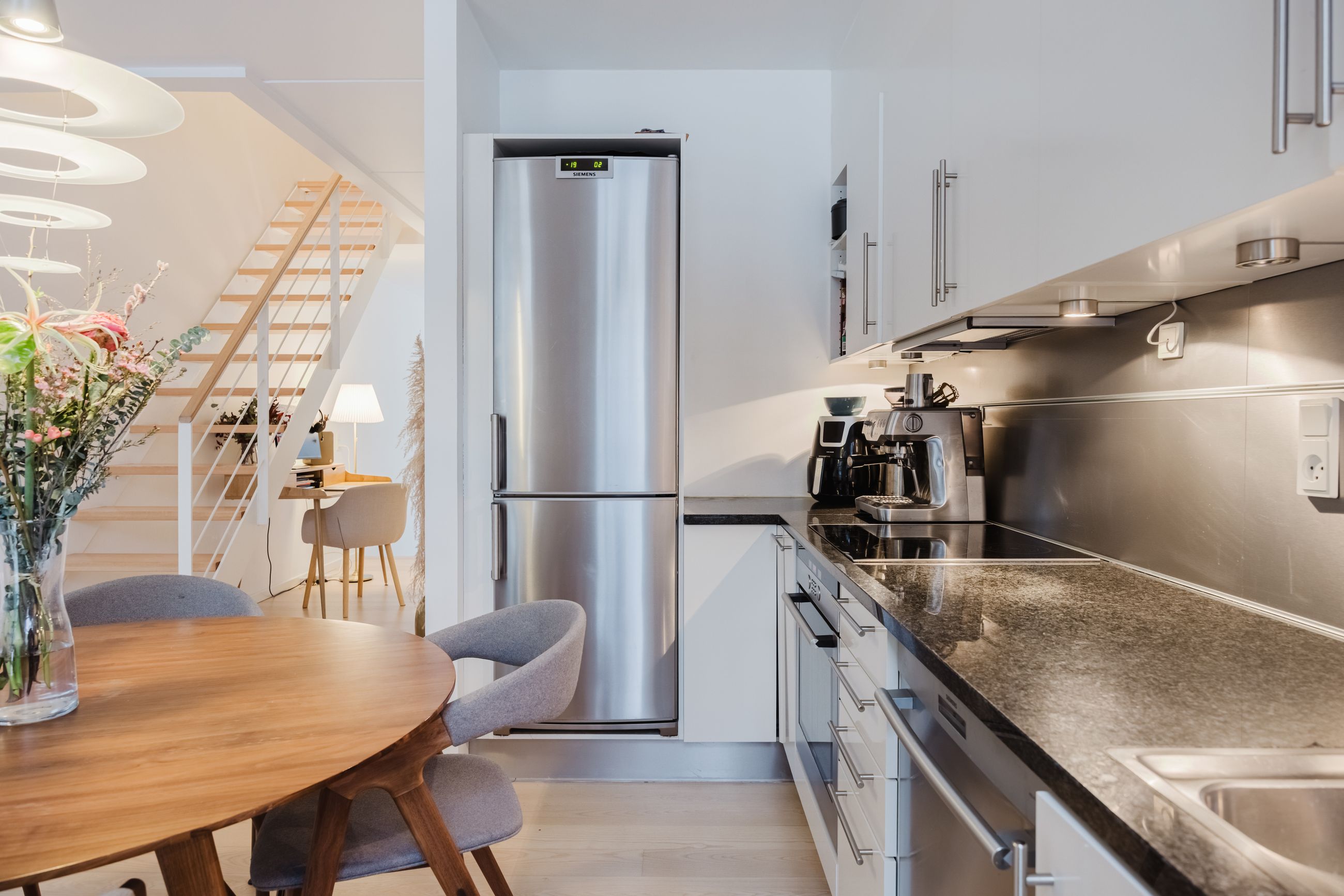 Køkken og stue er sepereret og sørger for god opdeling af rummene. Planløsningen er velovervejet, og hver kvadratmeter er udnyttet effektivt. Fra opholdsrummet er der direkte adgang til pontonen mod vandet, hvor man kan nyde solen og det levende havnemiljø. Pontonen fungerer som et ekstra uderum og giver mulighed for både badning, kajak eller blot ophold med udsigt over kanalen.