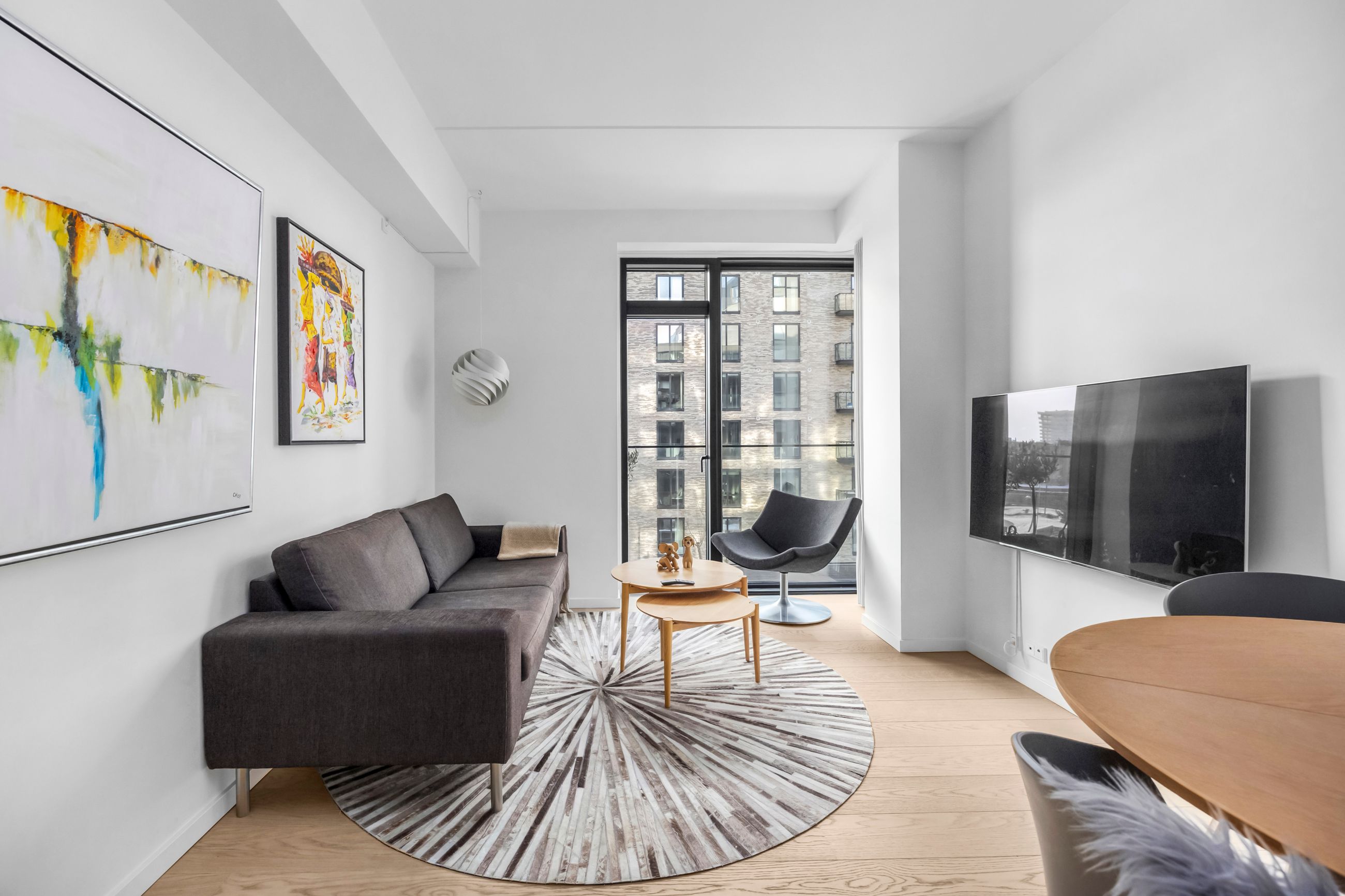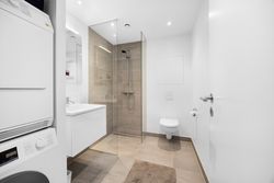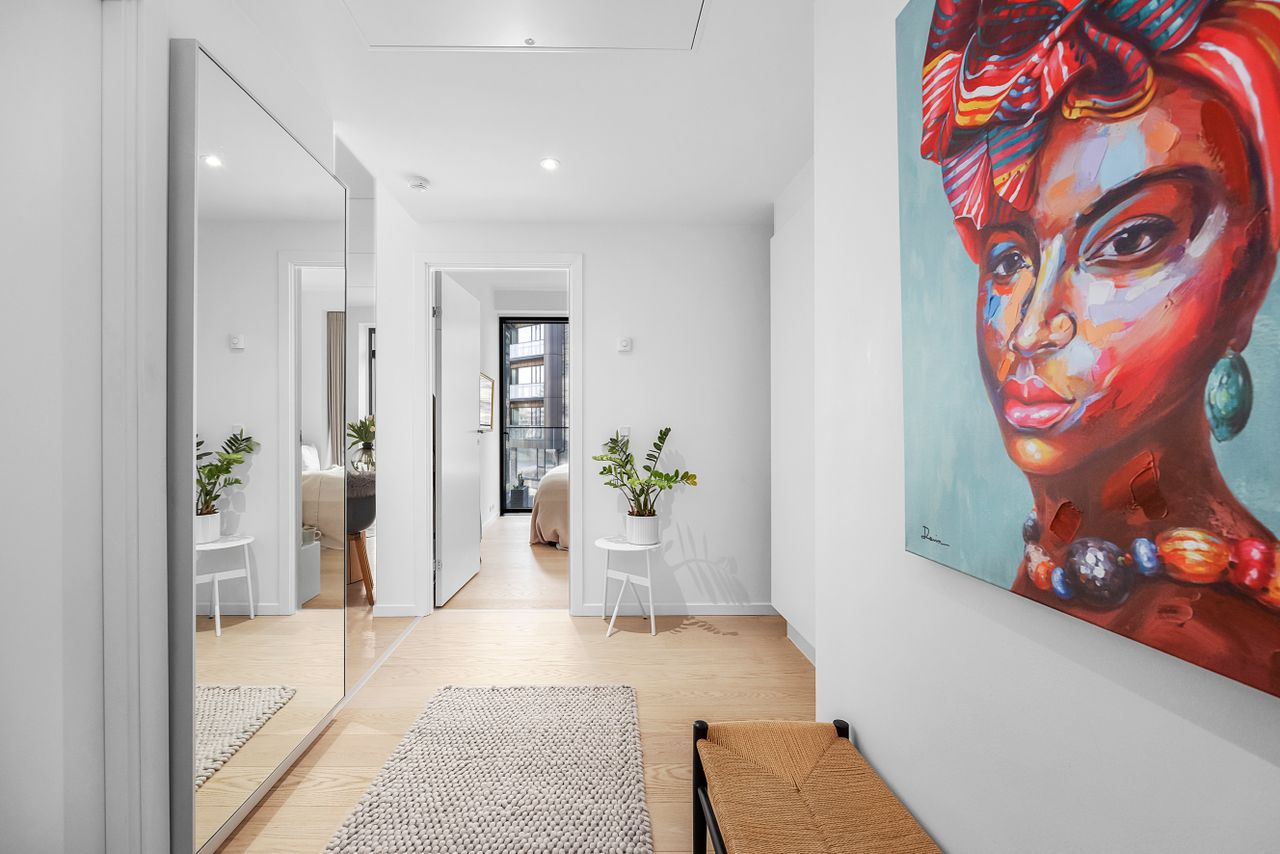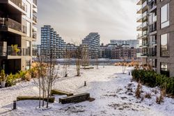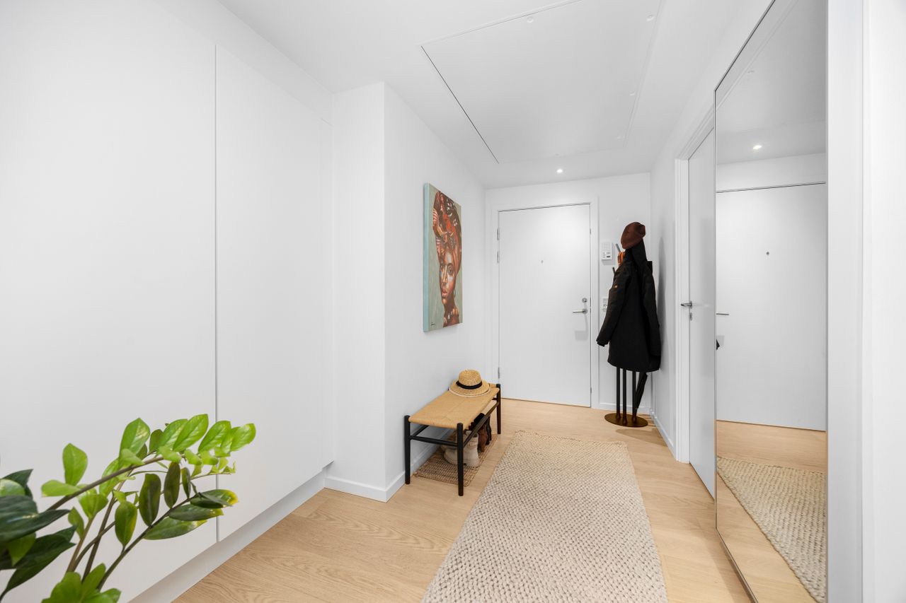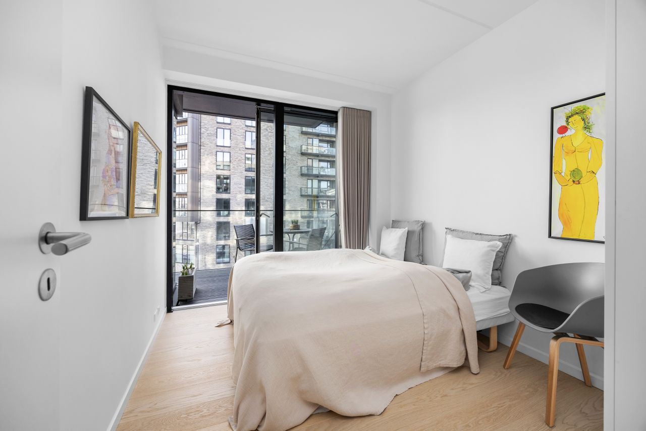 På George Marshalls Vej 25, 2. 2. får du en lys og moderne lejlighed, hvor udsigten er noget af det første, man lægger mærke til og noget af det, der bliver ved med at imponere. Her er gulvvarme i hele boligen og som et af de nyeste byggerier på Engholmene er der ingen radiatorer, der tager plads i indretningen. Resultatet er rene linjer, en rolig helhed og et hjem, der føles både let og komfortabelt fra første skridt indenfor.