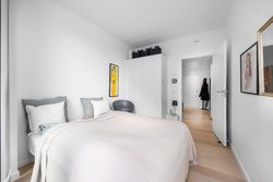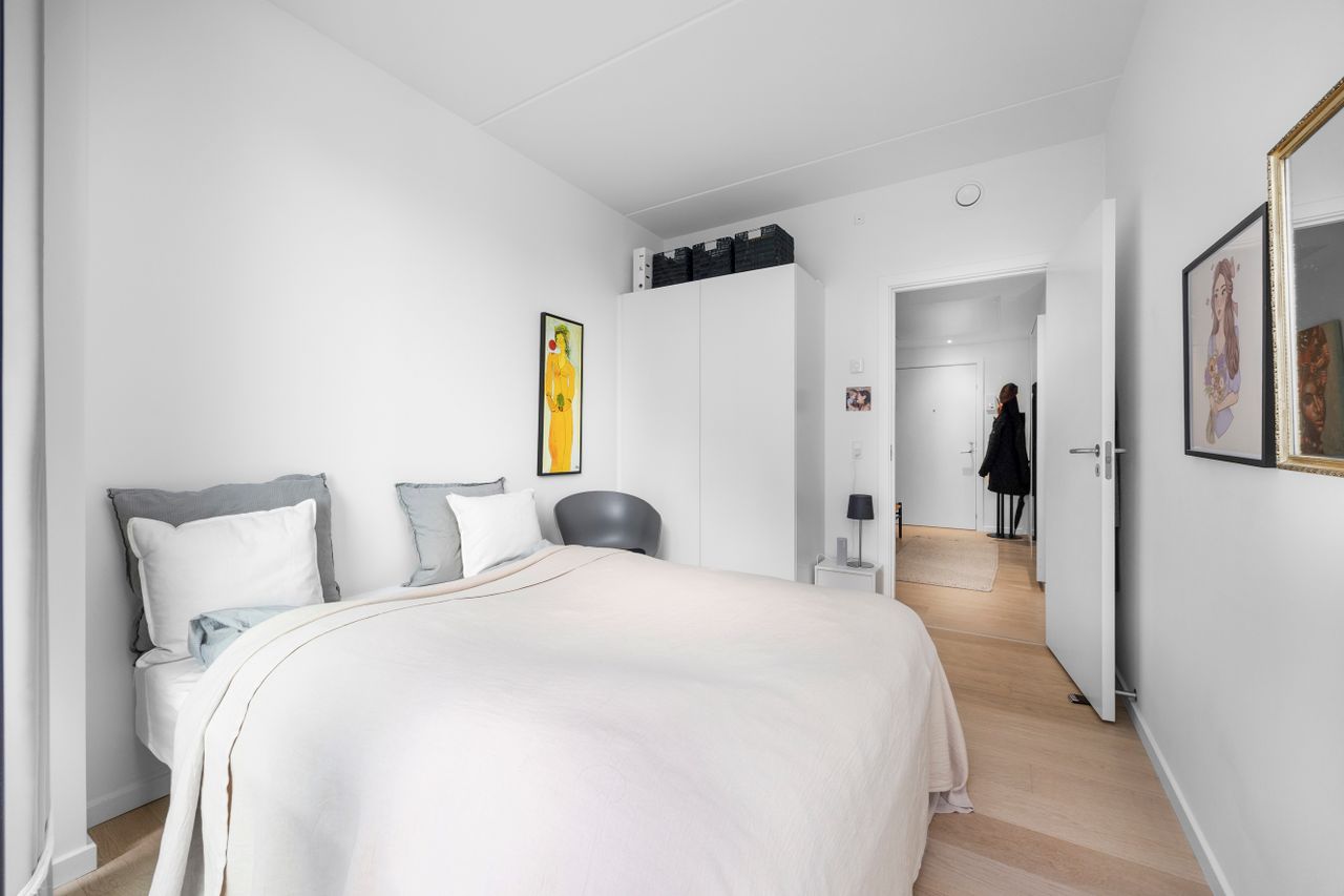 Soveværelset ligger roligt og er lige til at indrette med seng og skabe, og boligen hænger generelt godt sammen i både materialer og udtryk og her kan du flytte ind uden at skulle i gang med en masse.